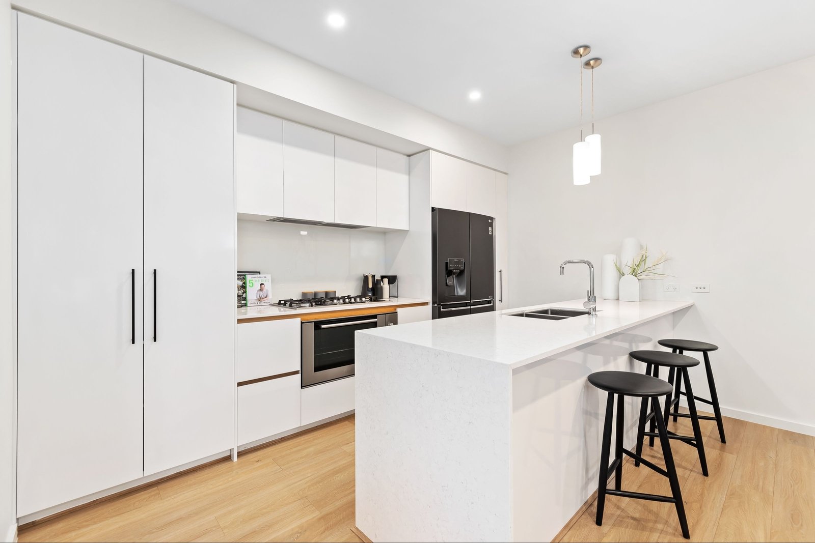 The spacious open-plan living area seamlessly integrates with a state-of-the-art kitchen. Crafted with stone finishes, top-quality appliances, and ample storage, it's a chef's paradise. Step out into the expansive rear courtyard, a perfect space for hosting gatherings and enjoying the outdoors.