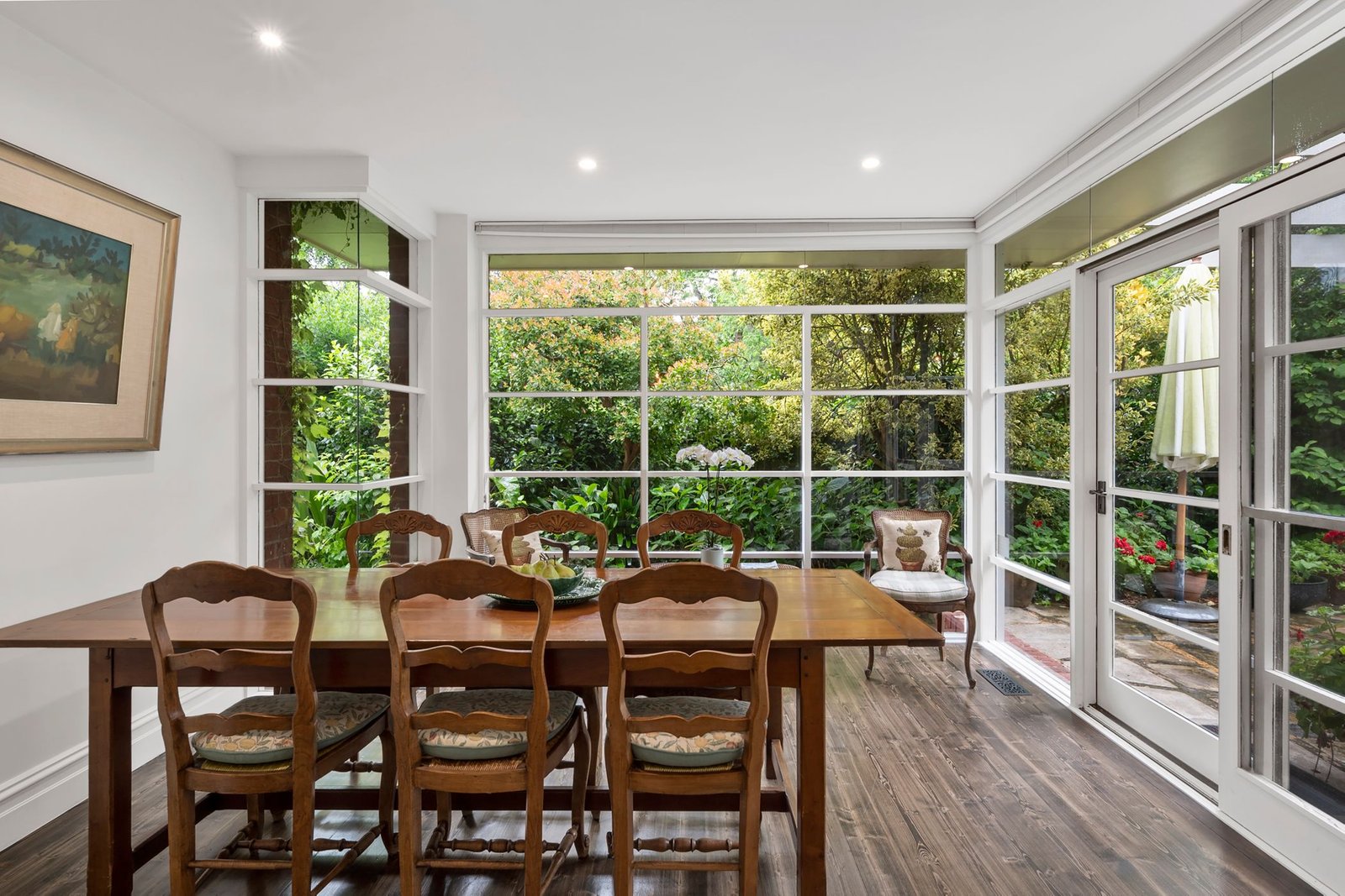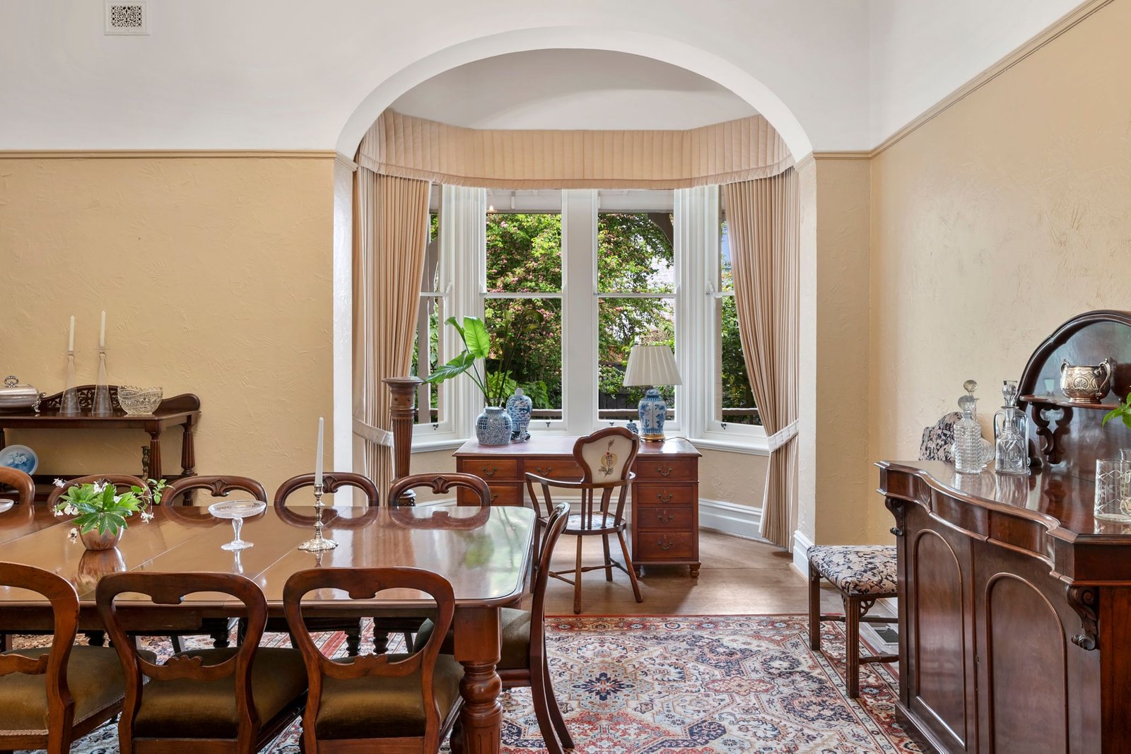 A separate dining room is perfect for large family gatherings and dinner parties and has a lovely view of an additional verandah and the garden through a large bay window.