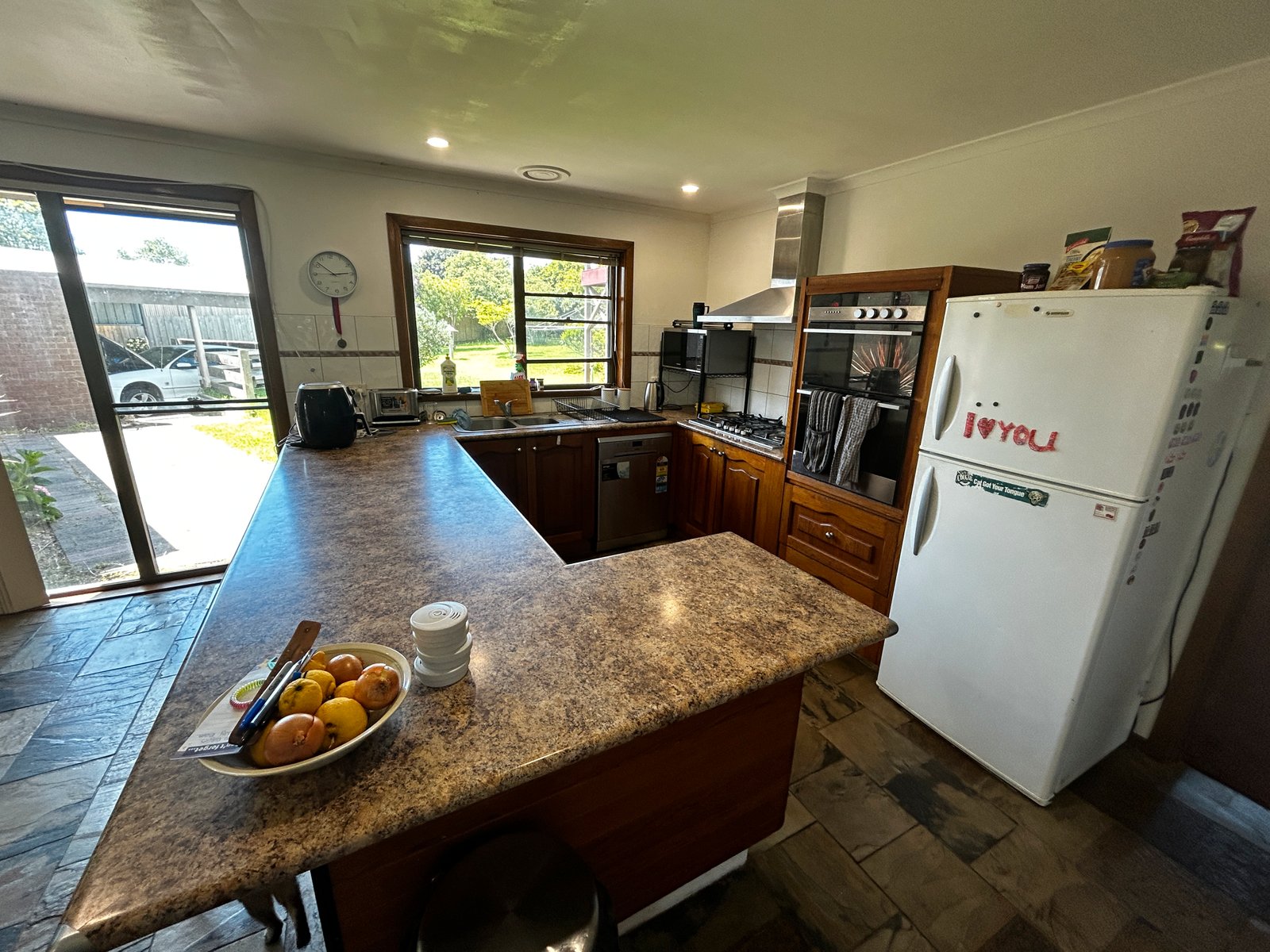 Large open plan kitchen and dining area, with large windows and sliding door to the backyard. Kitchen with plenty of cabinet space, 5 gas burner cooktop, double gas wall ovens, dishwasher, and small gas heater.
