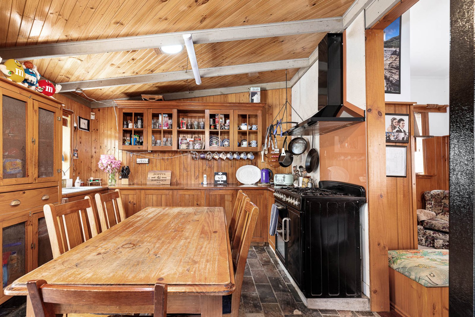 The country style kitchen is a good size and features an impressive Euromaid oven. It also boasts ample bench and storage space with timber cupboards and a feature timber lined ceiling.