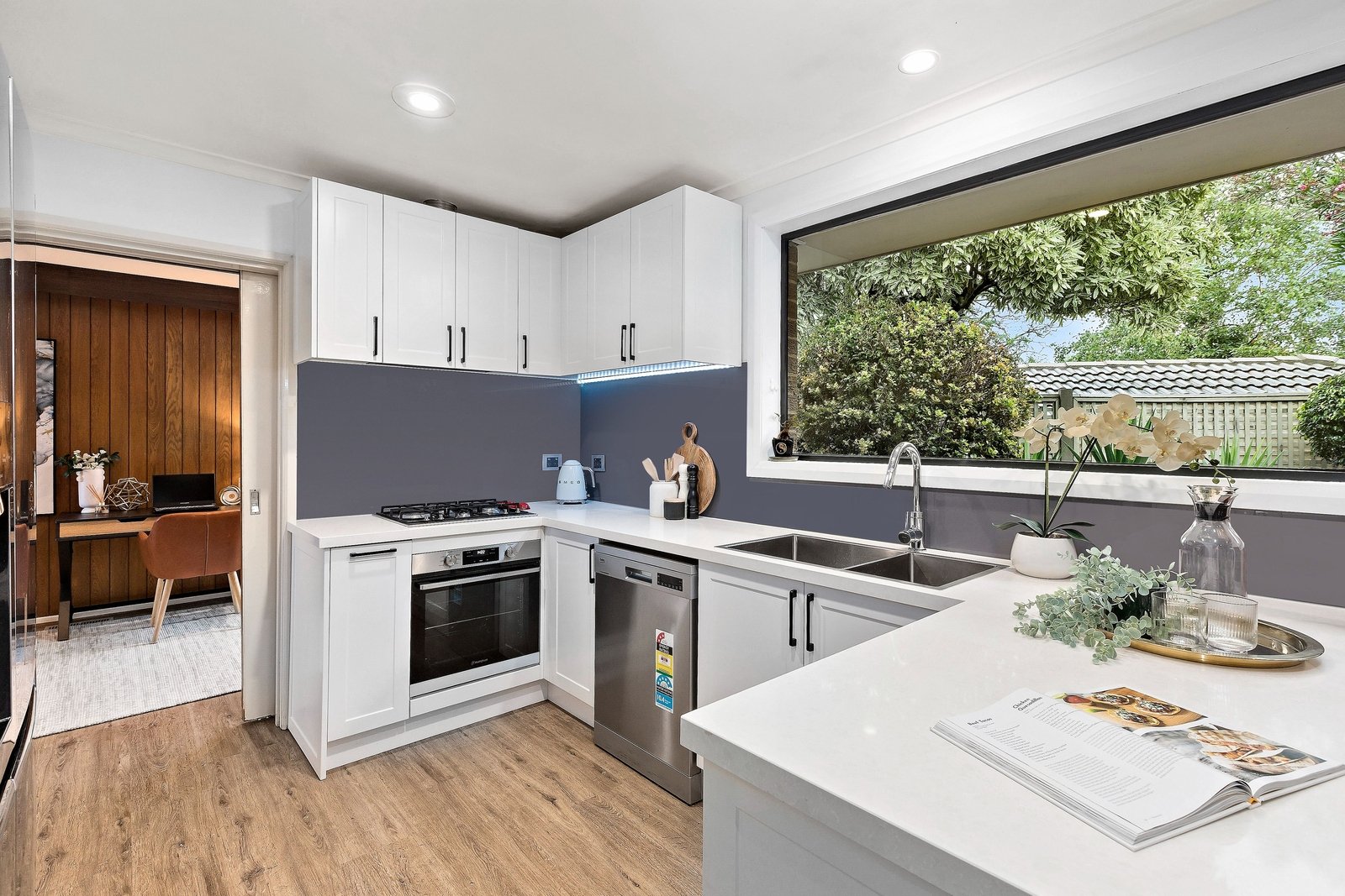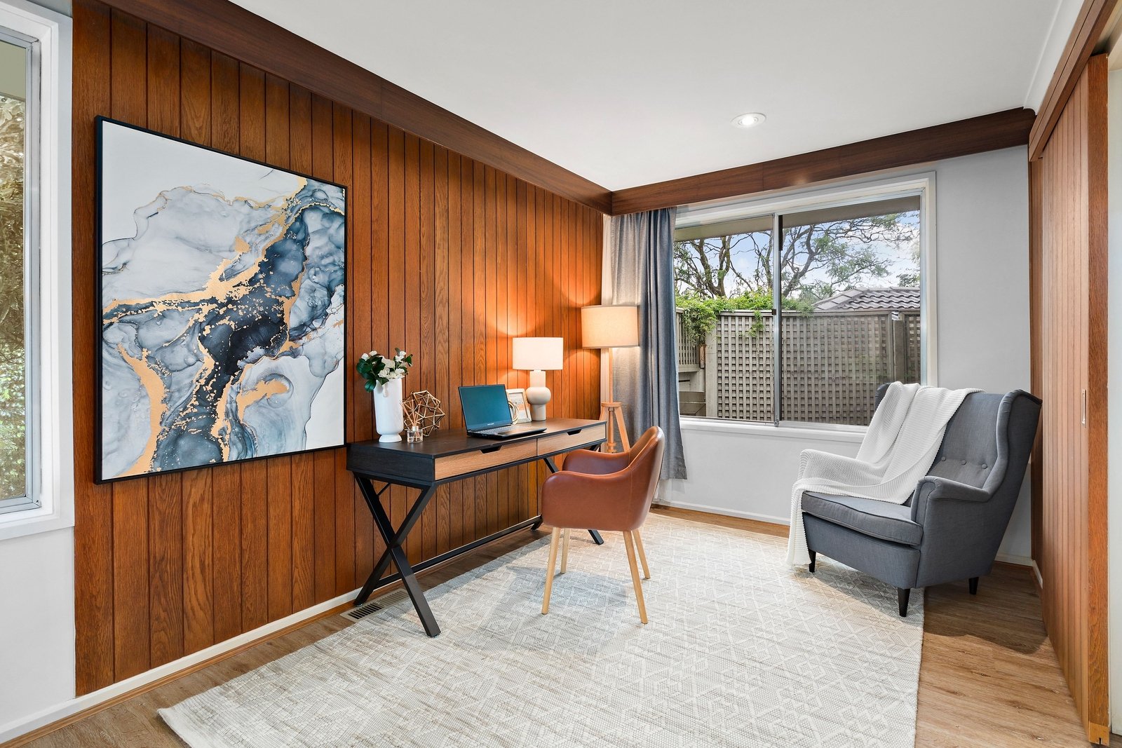 This smart renovation blends a fresh new kitchen, bathrooms and flooring with the home’s charming mid-century timber feature walls.