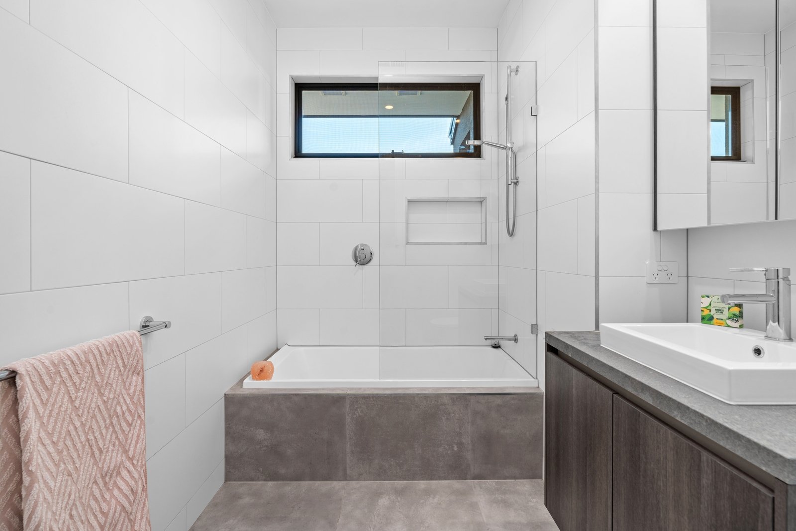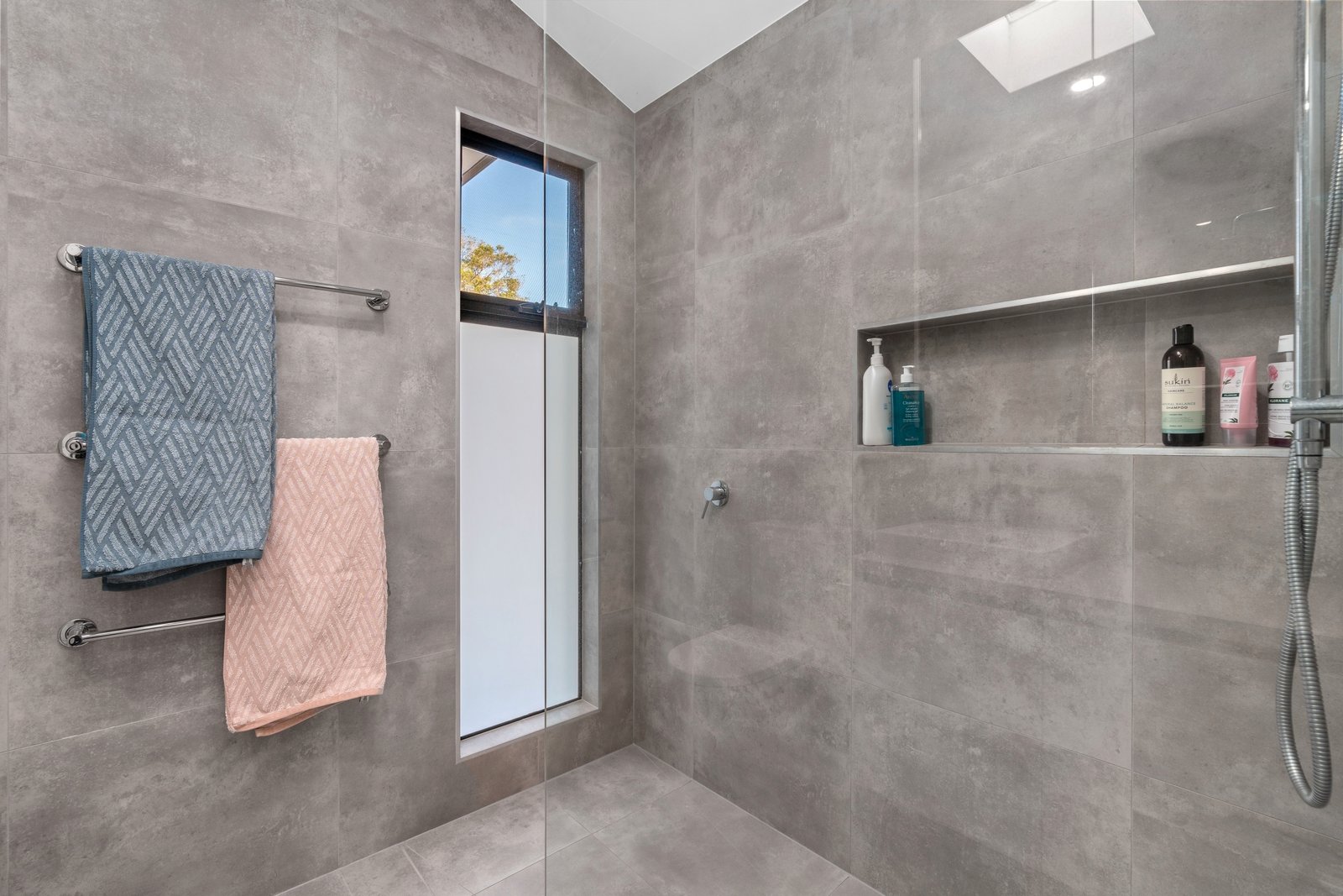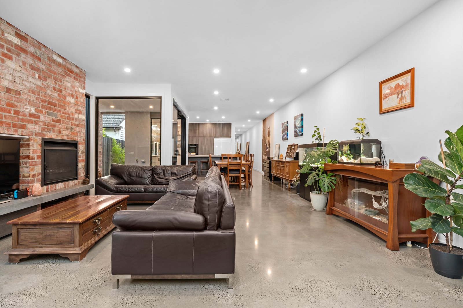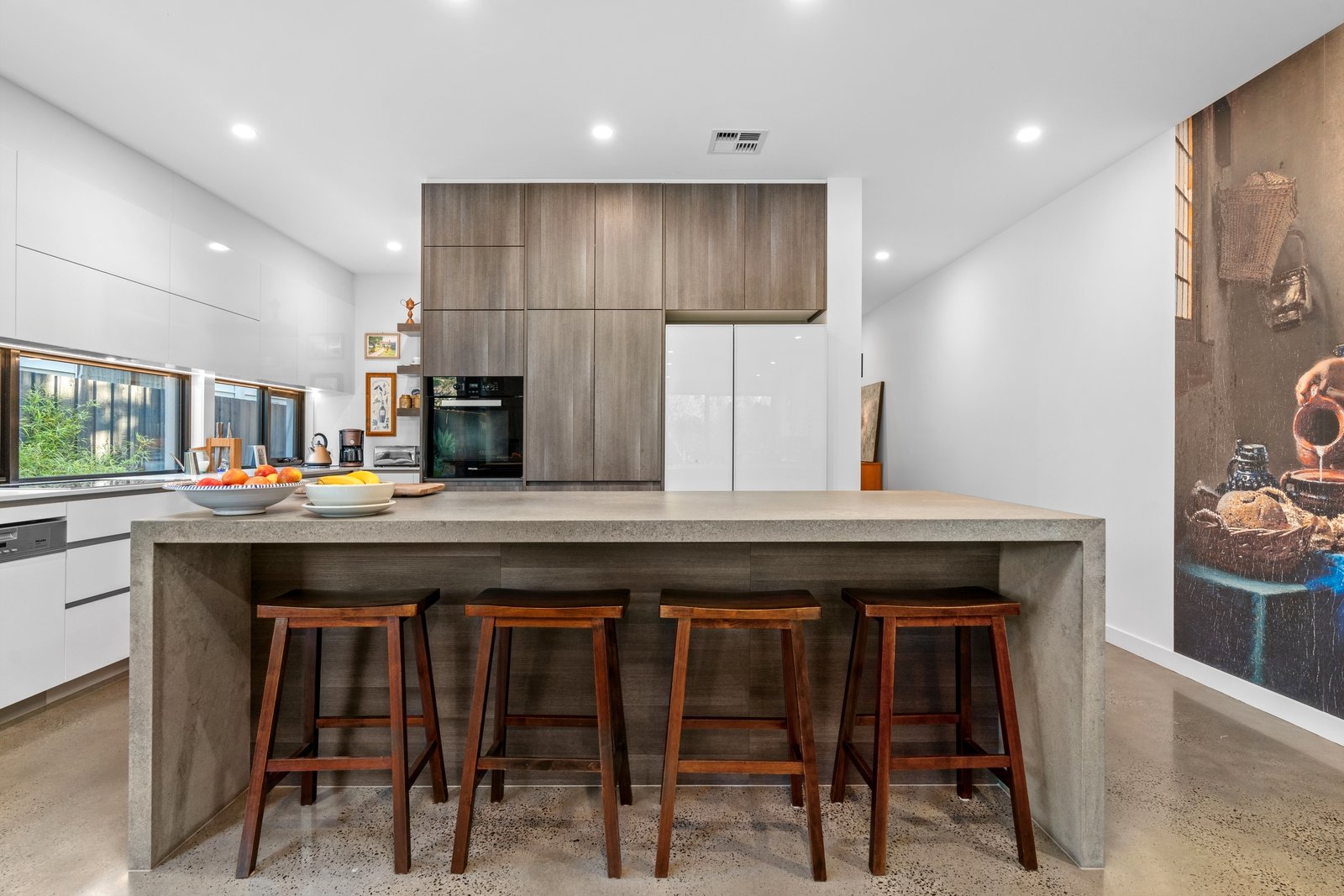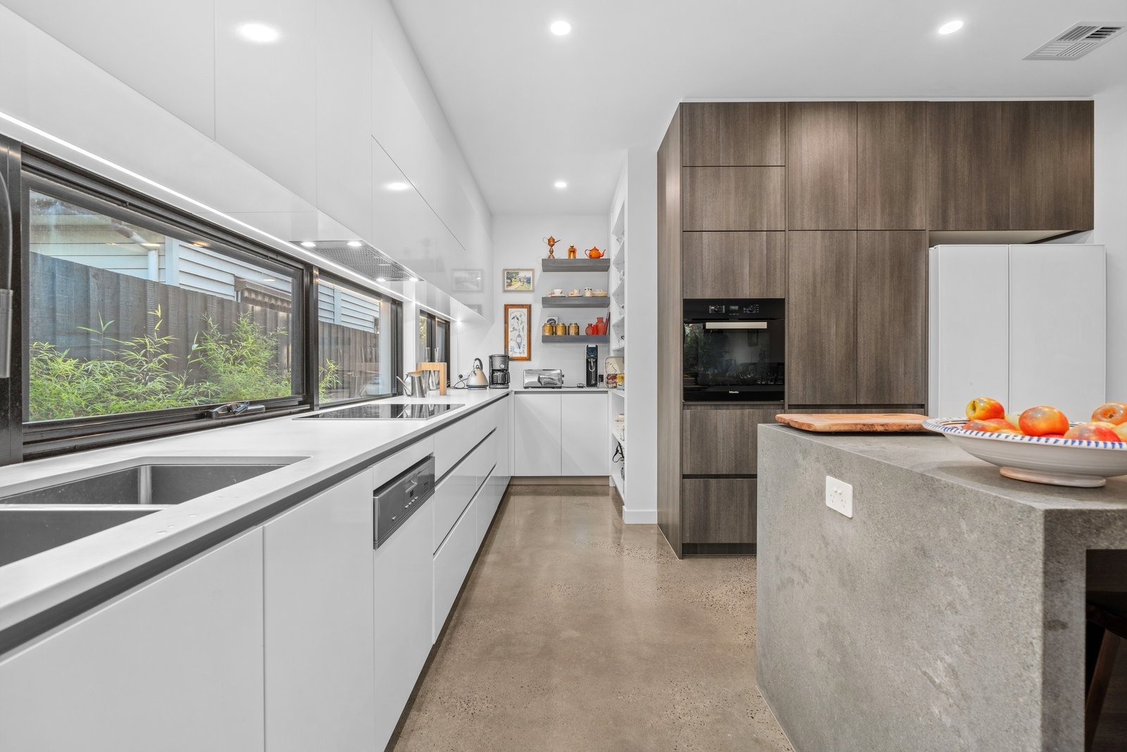 Showcasing clever design at every turn with an extended butler’s pantry area for the elite Miele appliance kitchen (with induction cooktop, semi-integrated dishwasher and pyrolytic oven), the home is cleverly curated with polished-concrete floors matched to concrete-style stone benchtops (waterfalling in the kitchen, and floating in the hearth), custom cabinetry including fitted robes, and floor-to-ceiling bathroom tiling.