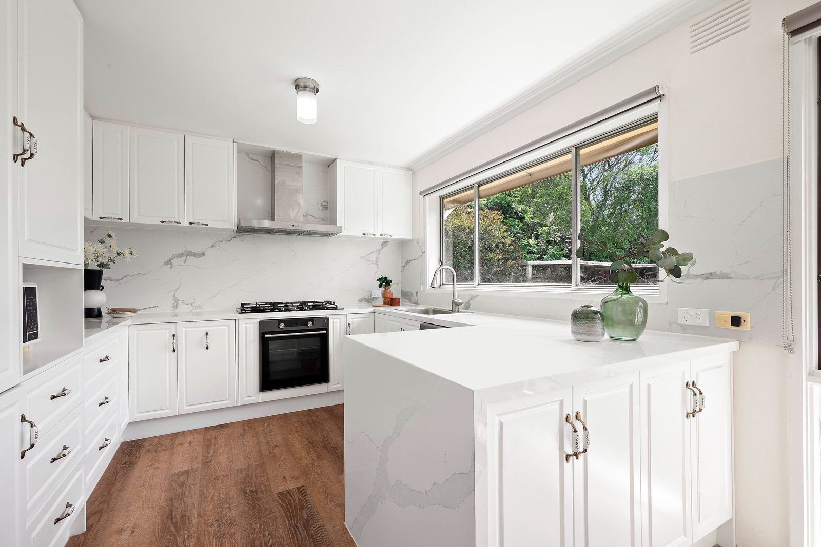 Inside, the home’s stylish updates offer the contemporary elegance of floating floors, and a stylish new marble tiled kitchen appointed with prestige Euro appliances including an Asko steam oven for healthy cooking.
