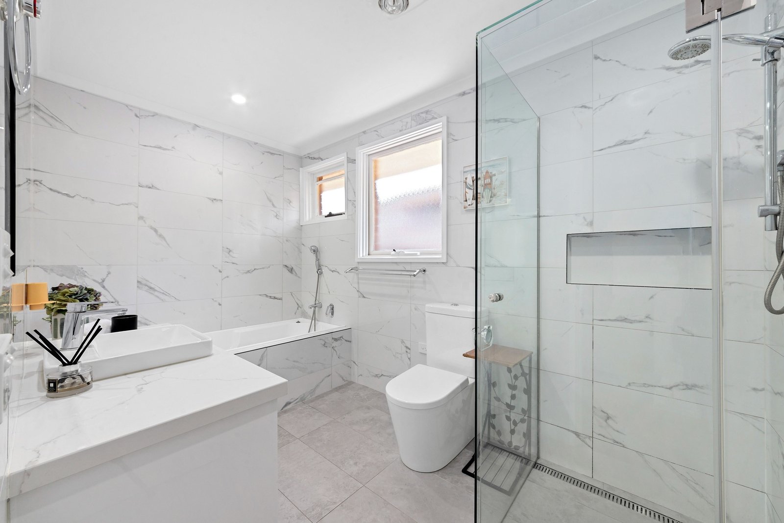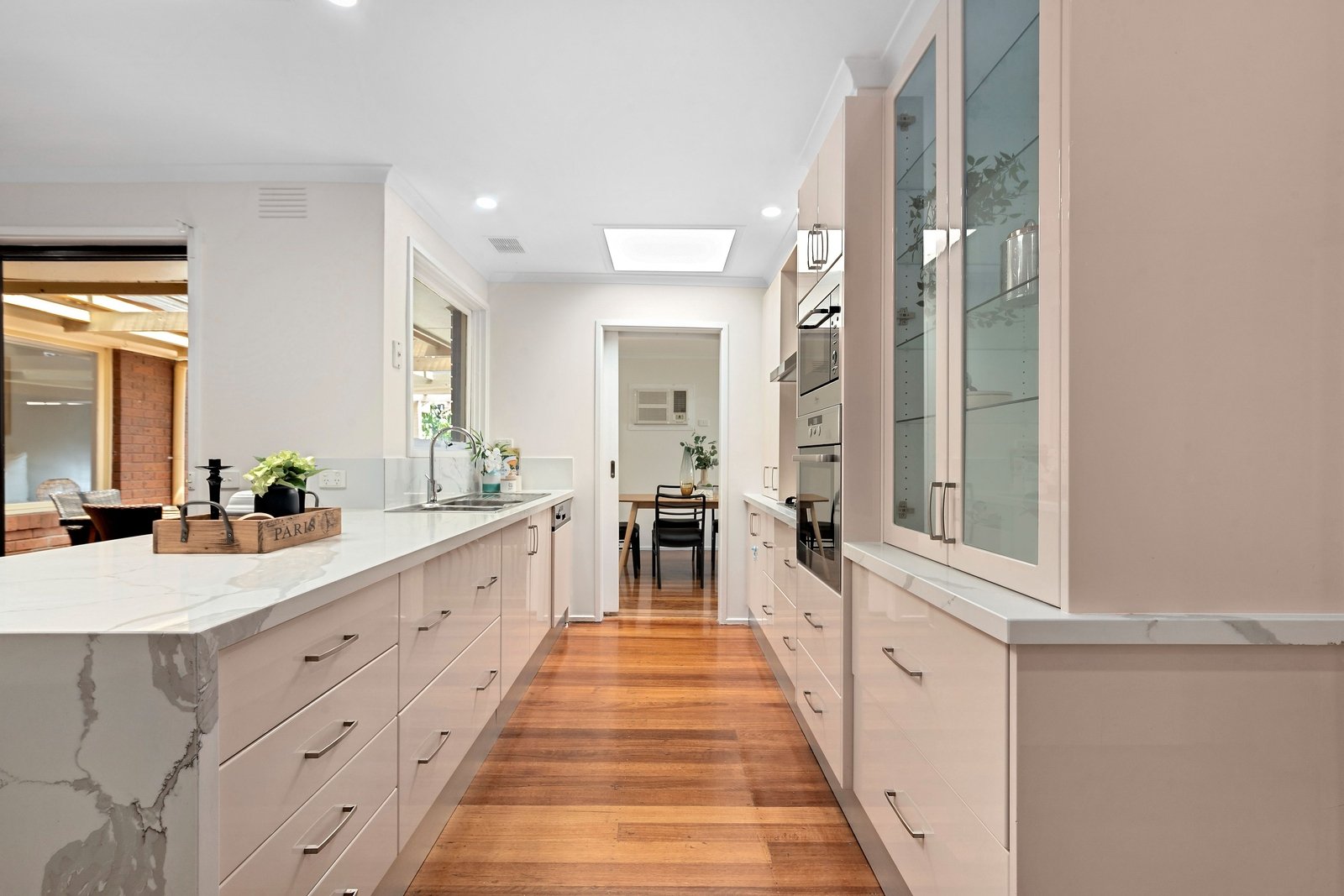 The home’s updates present a timeless look with polished hardwood floors and marble inspired tilework gracing the kitchen and bathrooms, as well as the comfort of ducted heating and split system cooling.