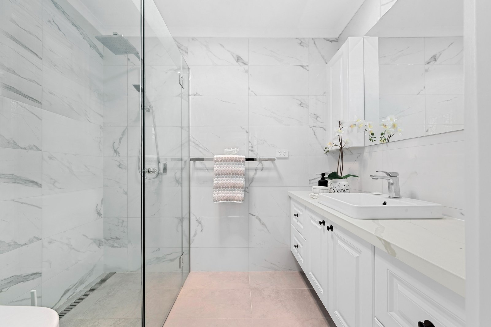Frameless showers bring a clean look to the 2 bathrooms, with a full bath in the family bathroom for children.