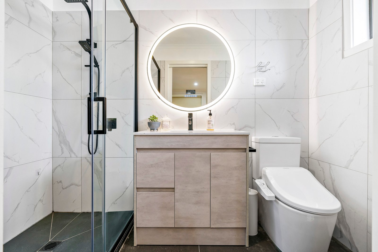 A stunning round touchscreen mirror brings tech smarts to the ensuite, with a shadow box shelf and sliding door completing the contemporary appeal.