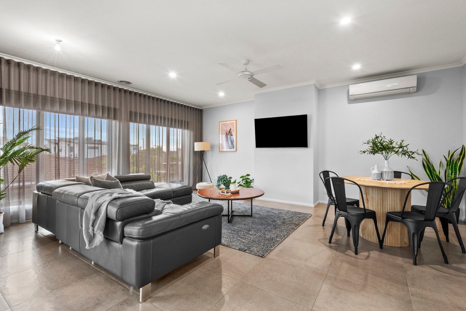 Immaculately presented, the modern façade offers a timeless appeal. Inside, a light contemporary colour palette and neutral accents create a warm and welcoming atmosphere throughout. A wide entry hall leads to the ground floor living, which offers a quiet space to retreat with a tranquil vista of the pool. Ascending to the main living, a spacious open plan layout is revealed, with north facing windows allowing natural light to flow throughout. The high end kitchen features an island bench, stone benchtops, quality Fisher and Paykel appliances including 900mm oven, gas cooktop, dish drawer dishwasher, large butler’s pantry, elegant pendant lighting and bifold servery window to the balcony, which will no doubt impress the keen entertainer. Elegant sheer curtains add an ambient sense of luxury to the dining and living area.