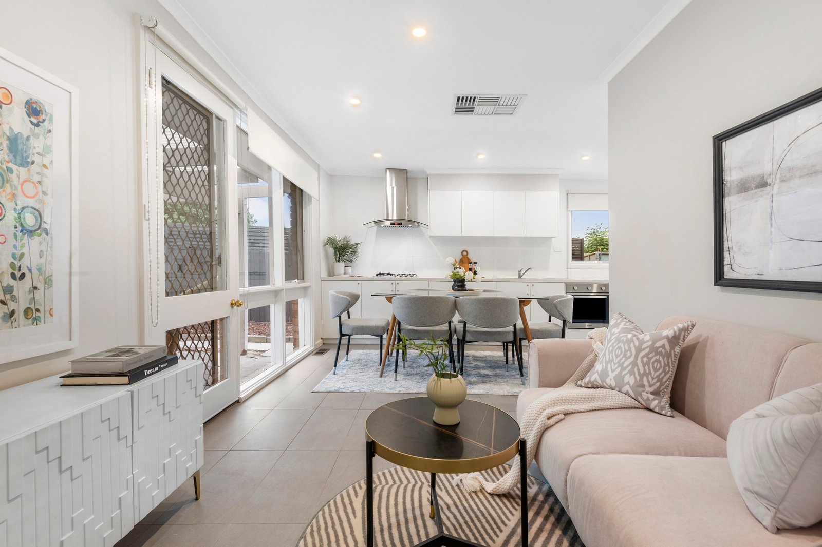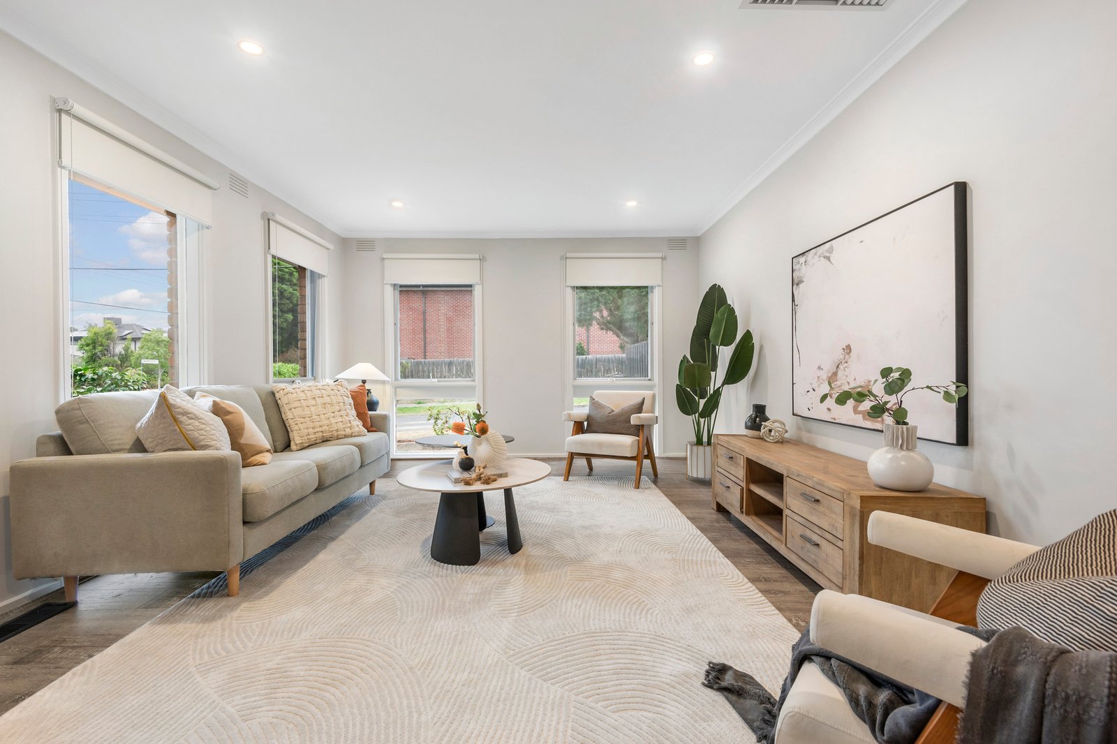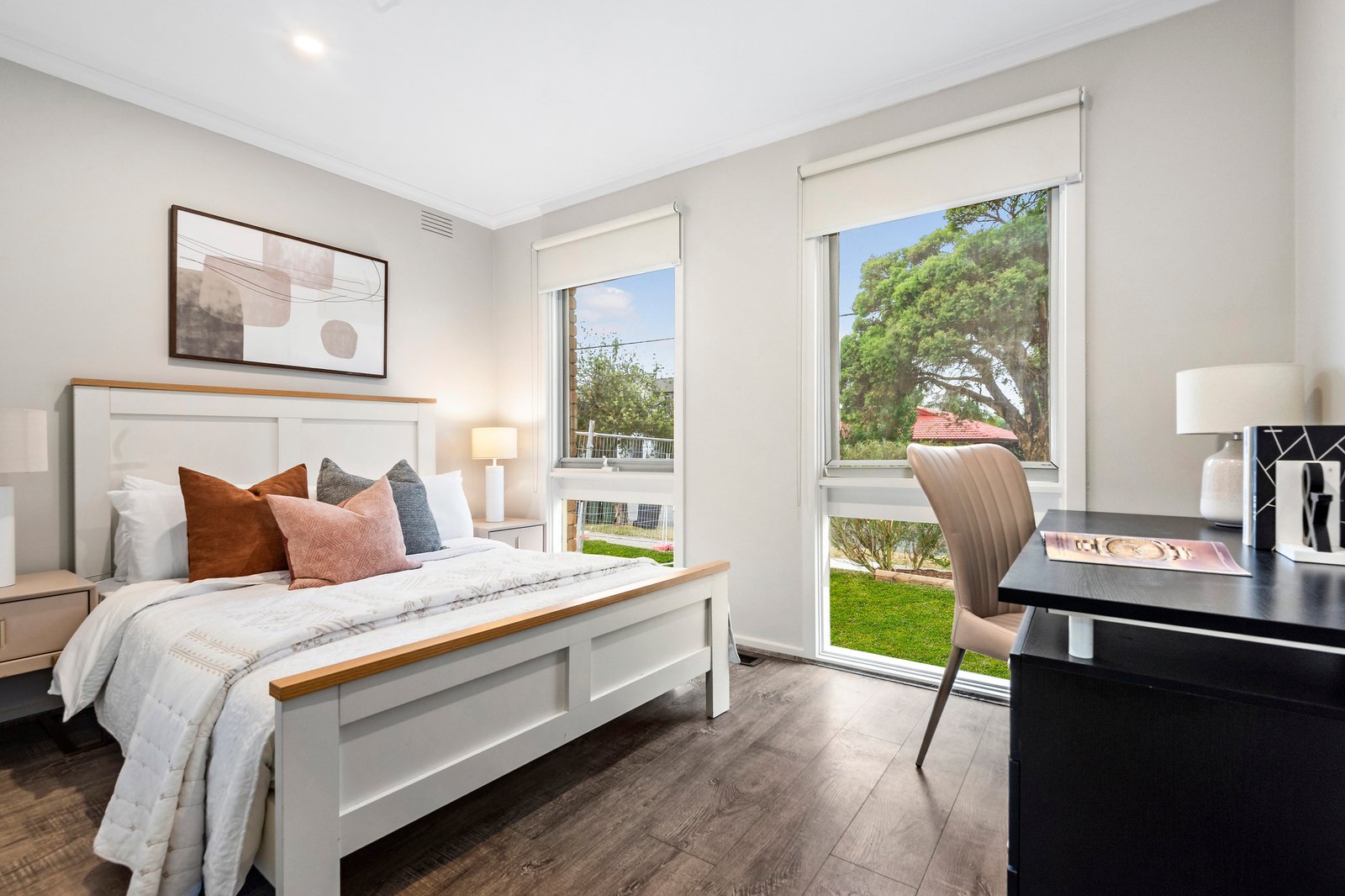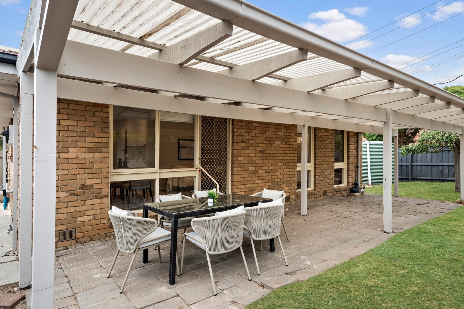 A choice of two living spaces caters for young families, with the main living area overlooking the front patio, and the family room opening to a paved outdoor living space under a pergola.