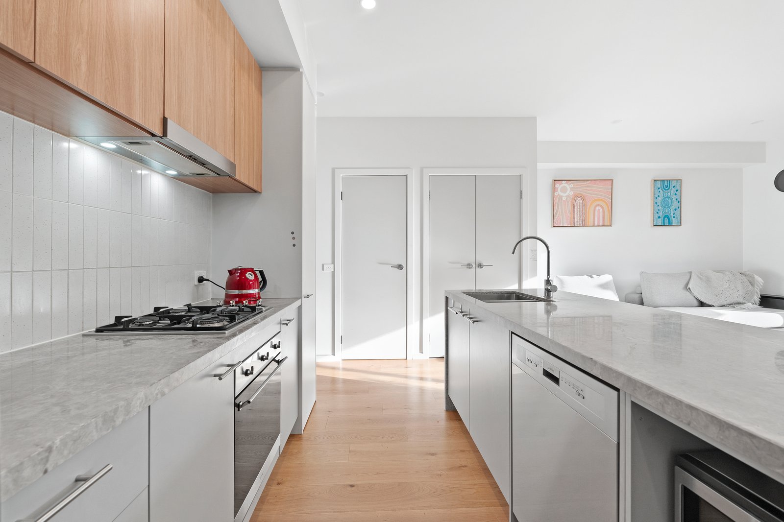 Downstairs, the property features a stunning kitchen, with high-end, as-new appliances and a very appealing contrasting cupboard combination of light grey and timber effect. The island bench provides a central hub with space for seating. The light-coloured walls and woodwork help create a genuine sense of relaxation for the living areas. A European laundry and large under-stair cupboard create ample storage room.