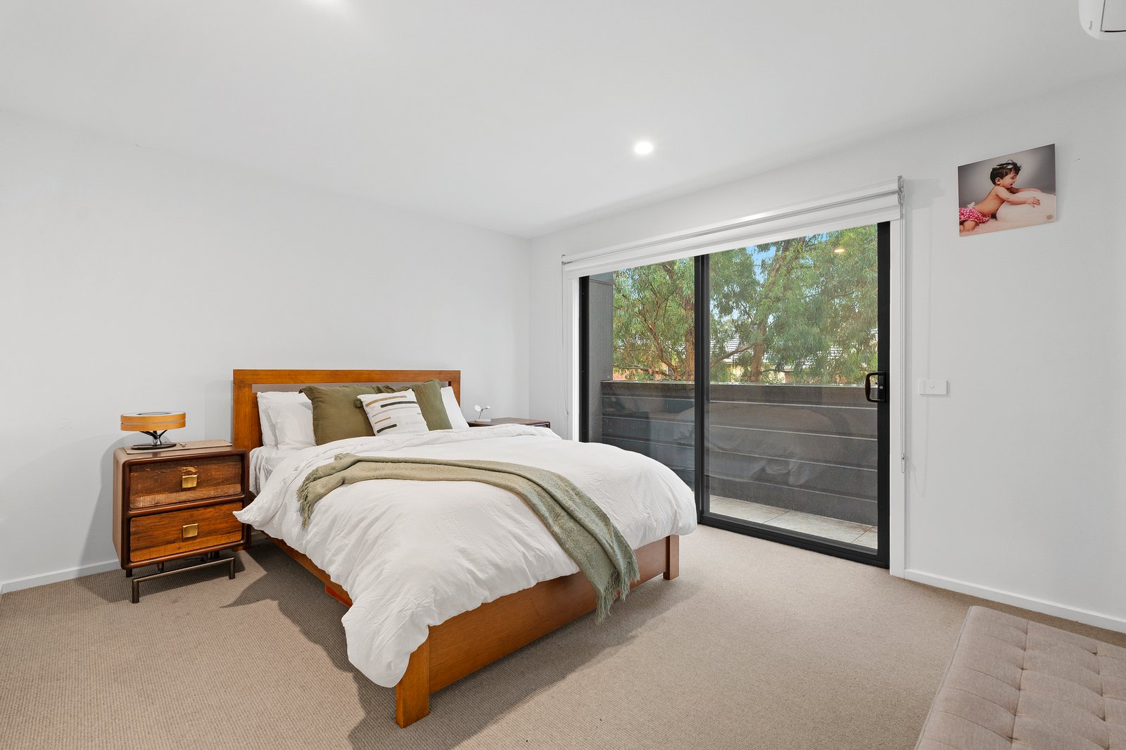The downstairs double bedroom features built-in robe and large sliding doors that opens out to the front courtyard.