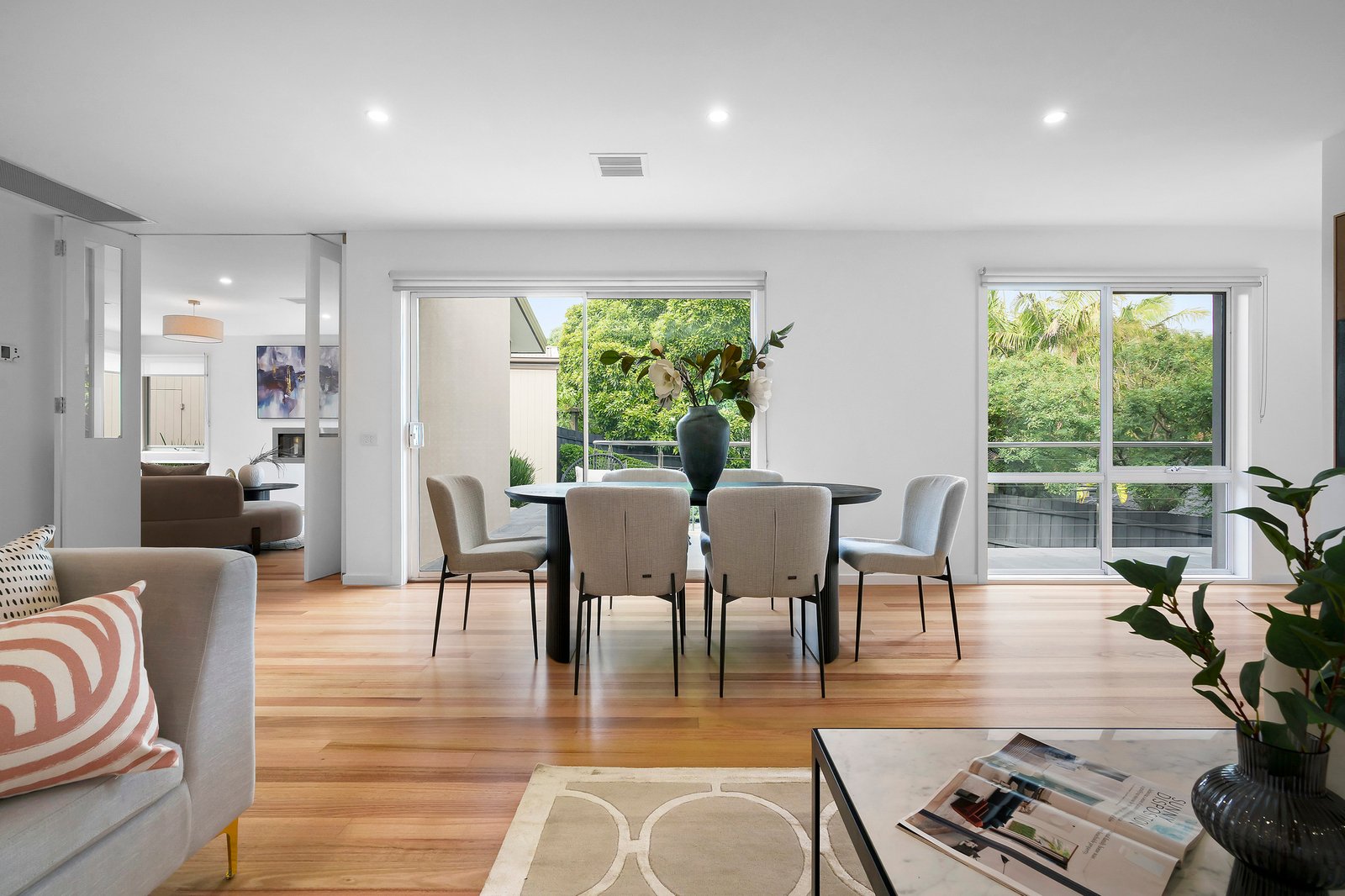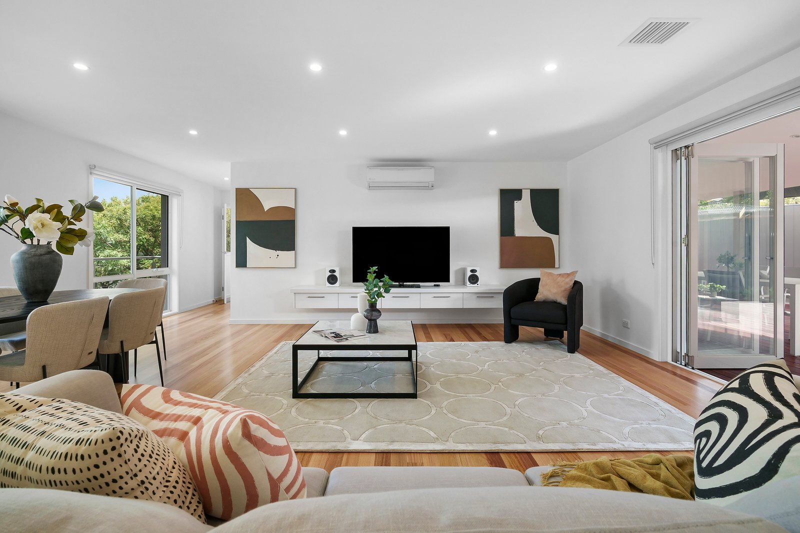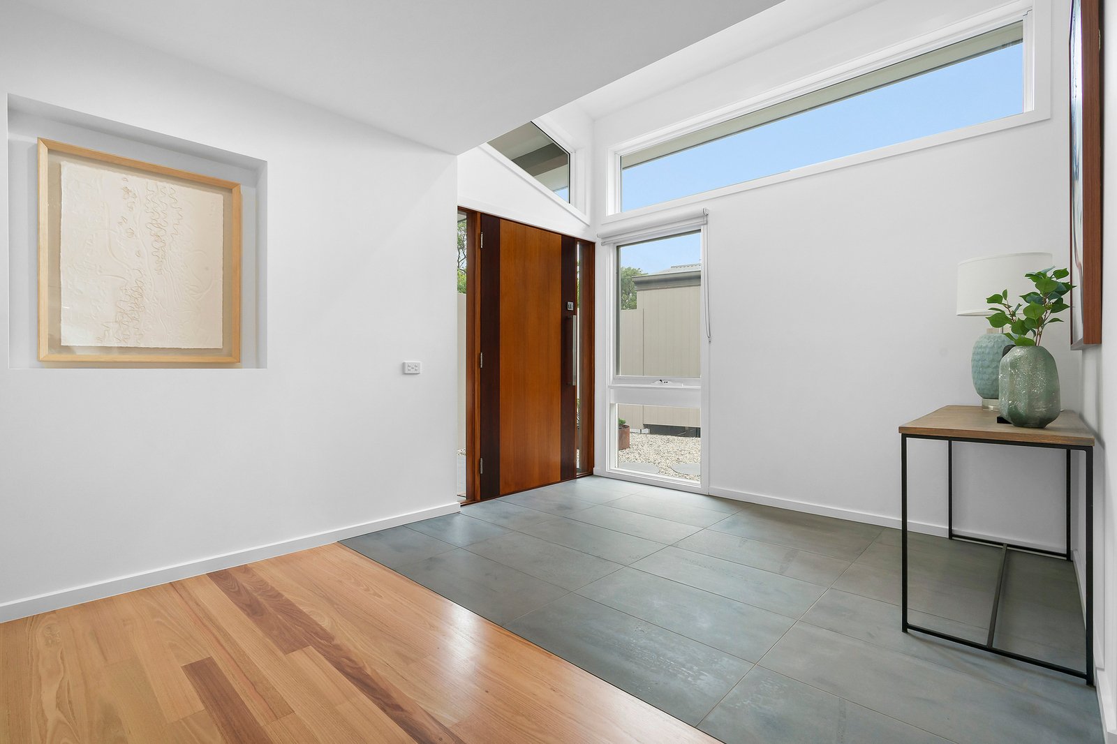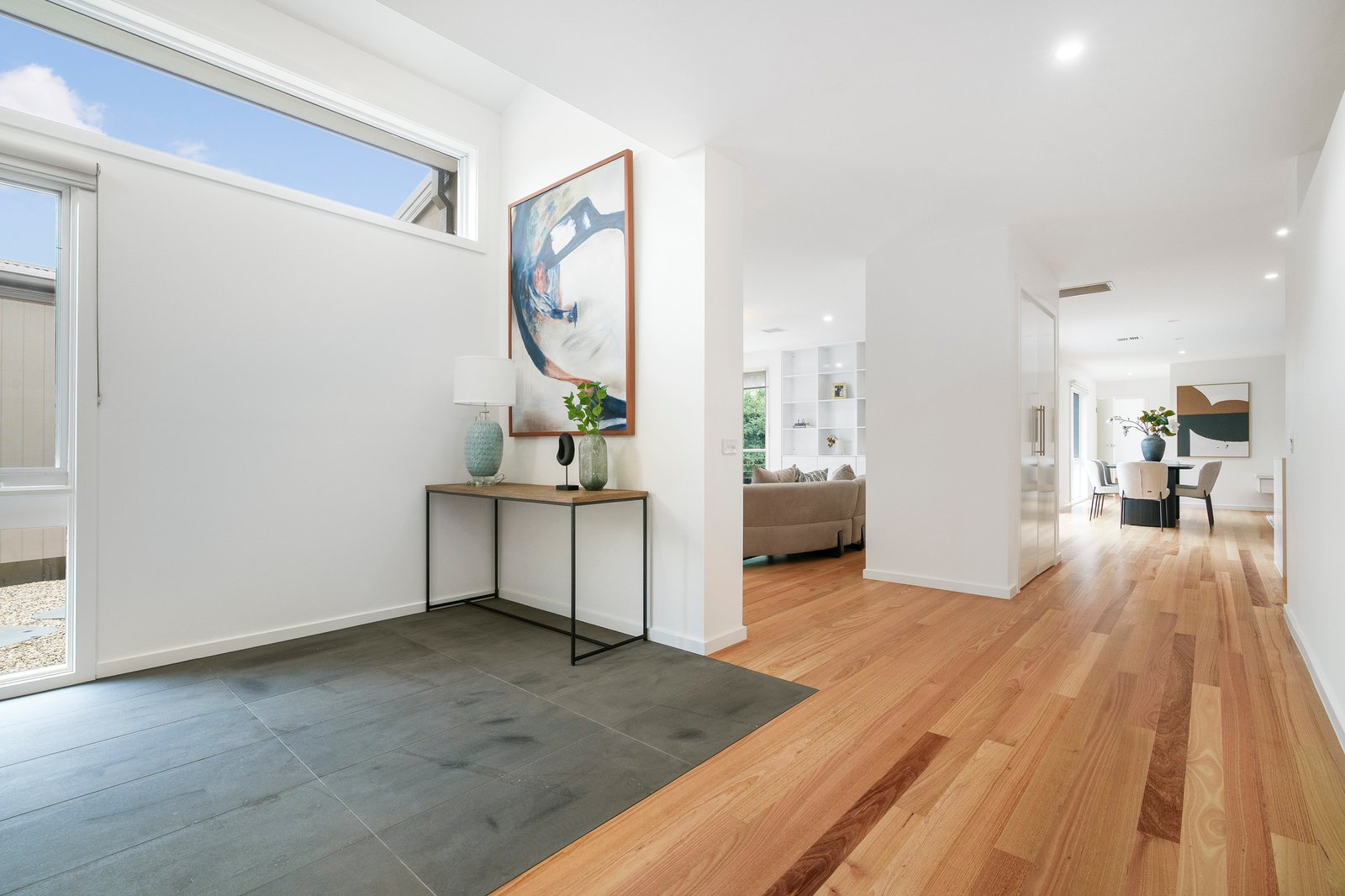 A statement front entry in exposed aggregate and bluestone pavers is matched by spectacular angled ceilings in the home’s entrance hall – with stylish satin finish hardwood floors carrying you across the free-flowing living space.