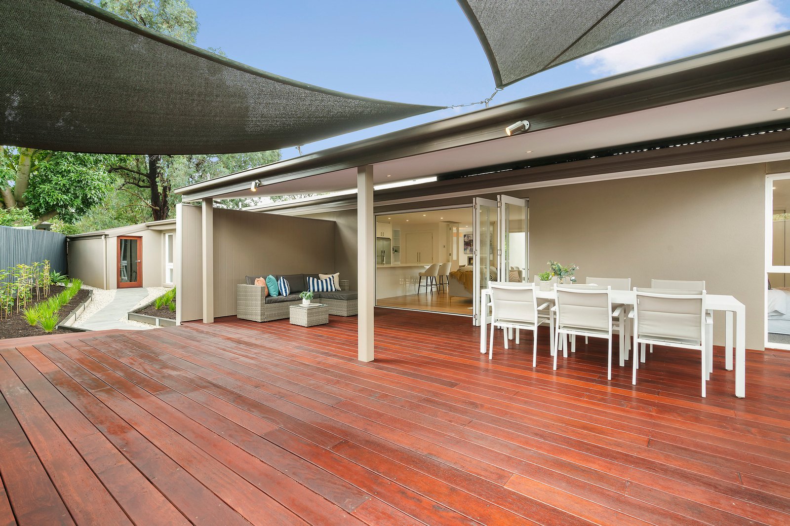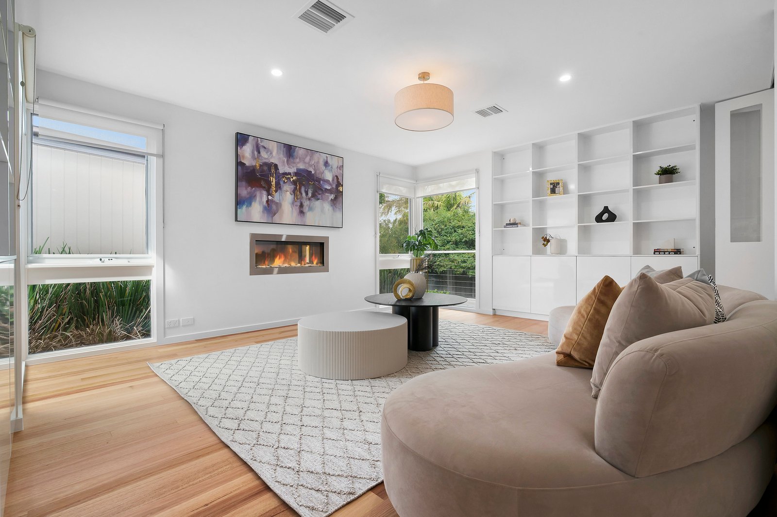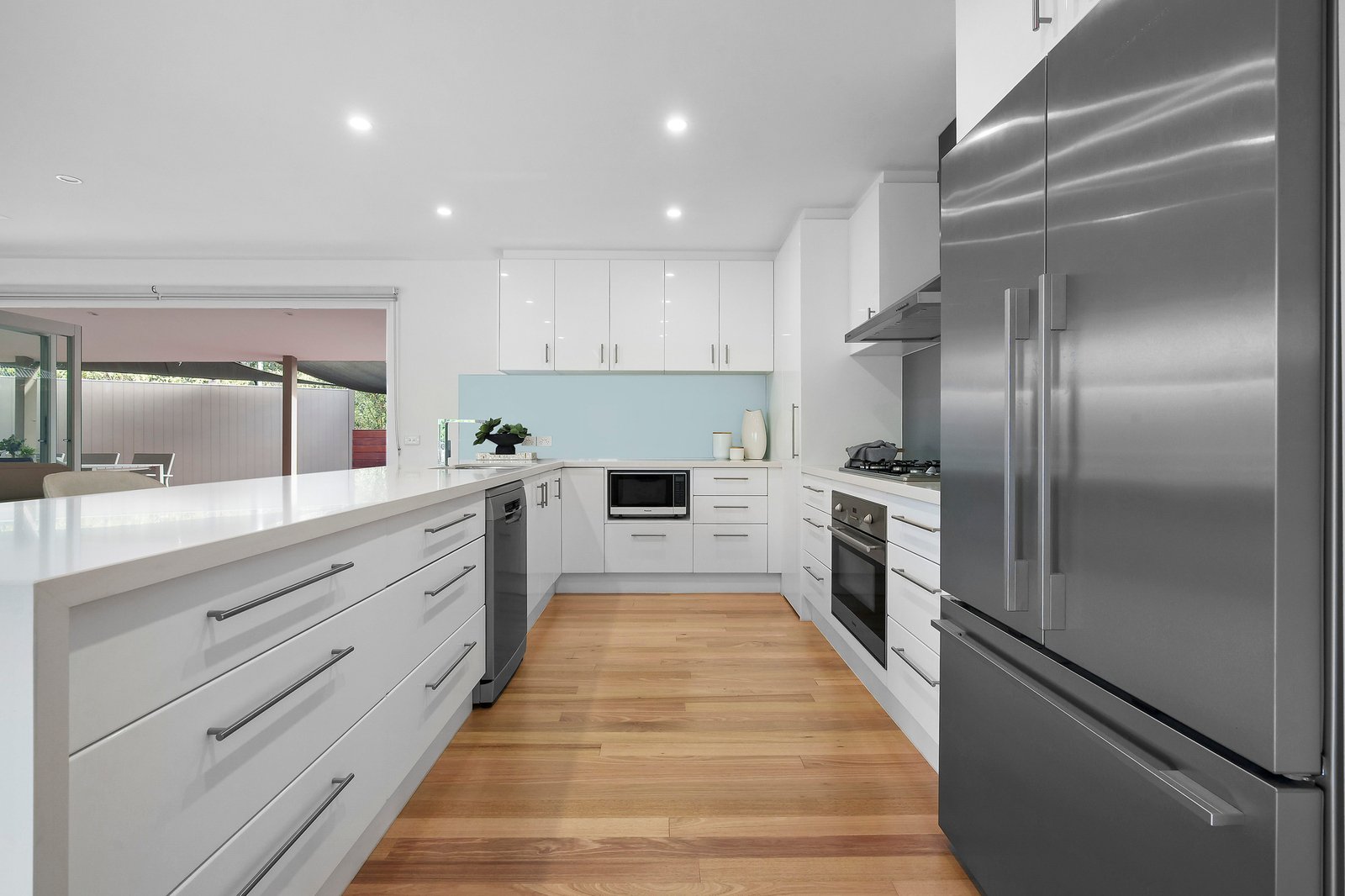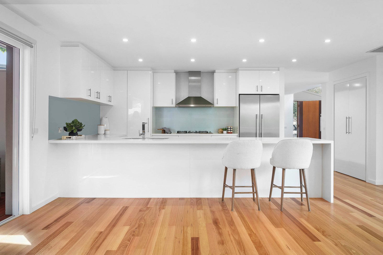 A statement front entry in exposed aggregate and bluestone pavers is matched by spectacular angled ceilings in the home’s entrance hall – with stylish satin finish hardwood floors carrying you across the free-flowing living space.