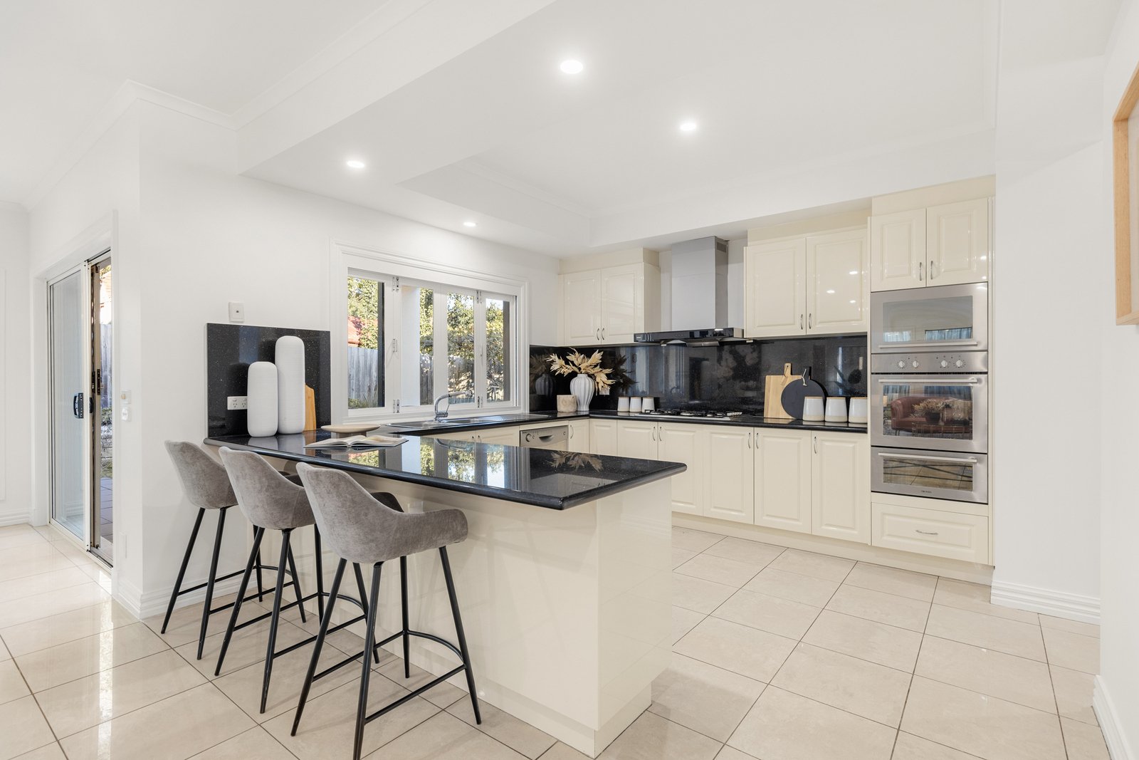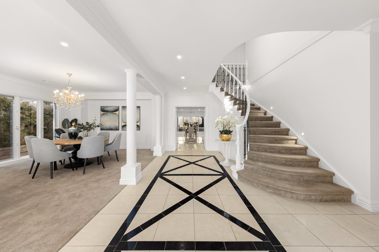 Built on a grand scale in an exclusive pocket, an easy walk from Kew Junction and its vibrant mix of specialty shops and cafes, this distinguished masterpiece displays enduring elegance and a dynamic floorplan that ensures family harmony. Stunning marble flooring in the entry foyer introduces a formal living and dining room with tall columns that accentuate the grandeur, flowing through to a radiant family room, meals zone and a luxurious granite kitchen equipped with stainless-steel appliances, a servery window and a butler’s pantry.