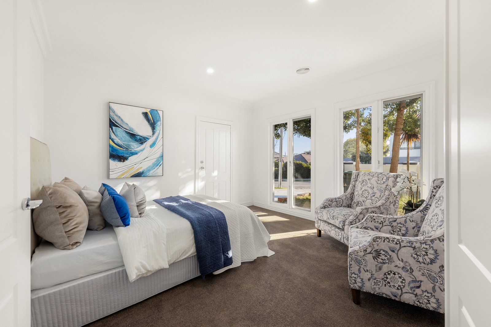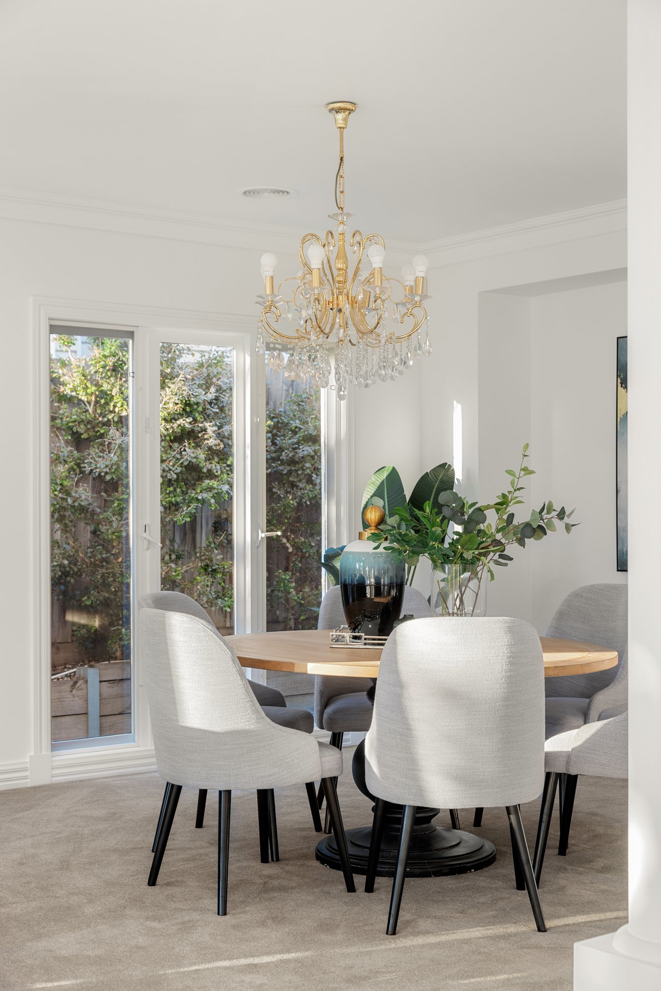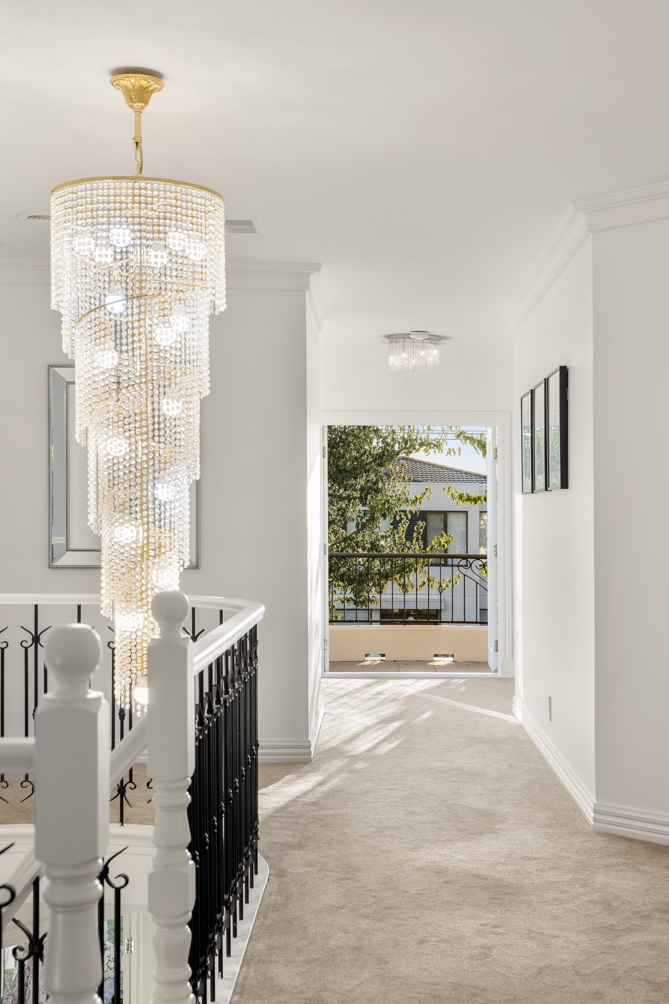 Placed at the rear, a home theatre provides an enjoyable place to watch a movie together on the big screen, while a dedicated ground-floor bedroom with a private bathroom offers versatile accommodation for guests, adult children, or ageing parents. A chandelier-draped staircase takes you upstairs, where you will find the opulent master suite boasting a sitting area flooded in light, a relaxing spa bathroom and walk-in robe.