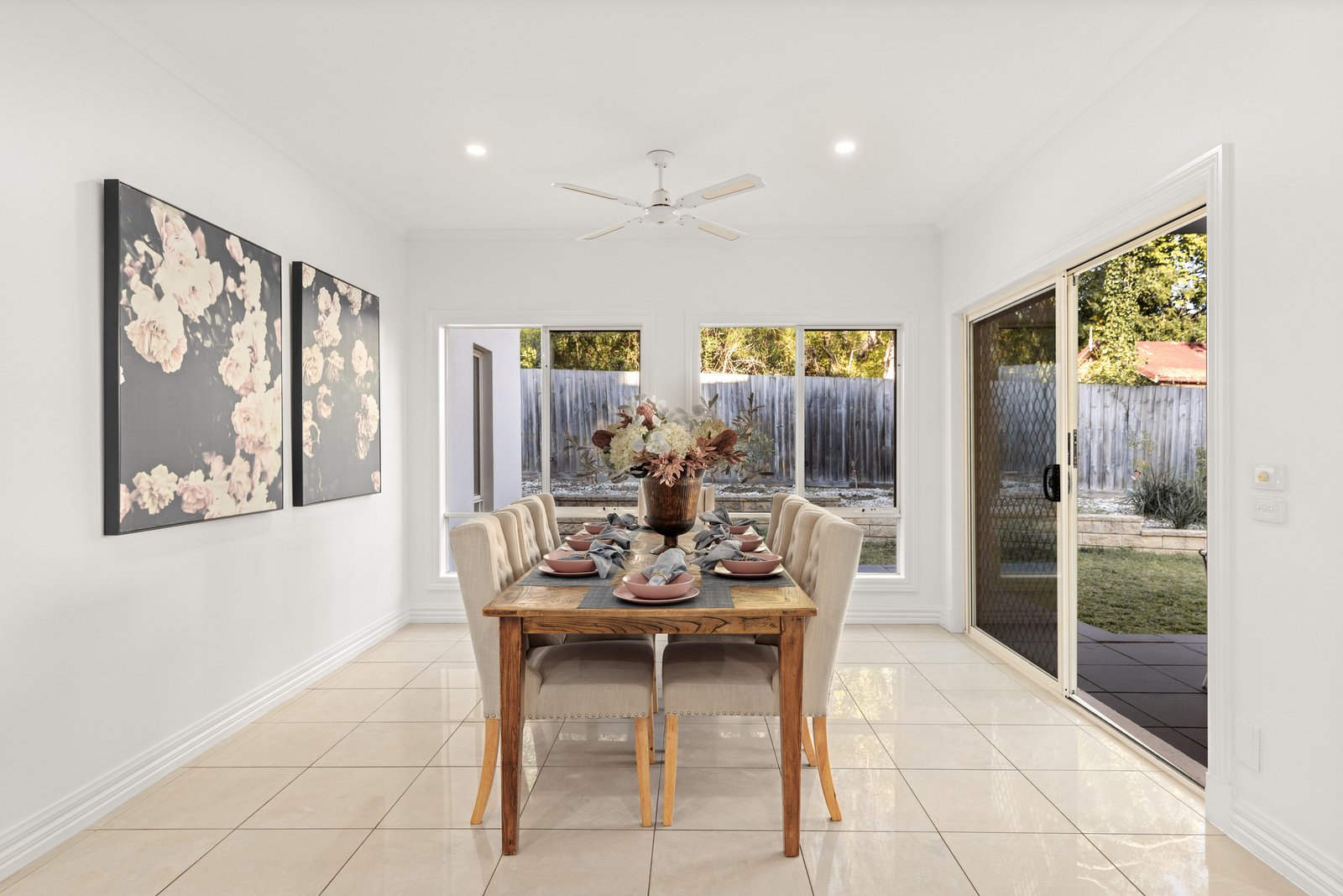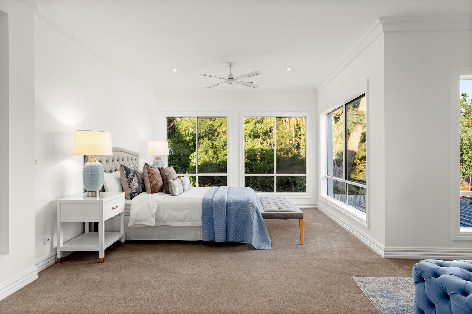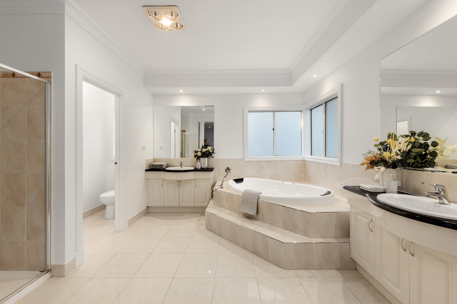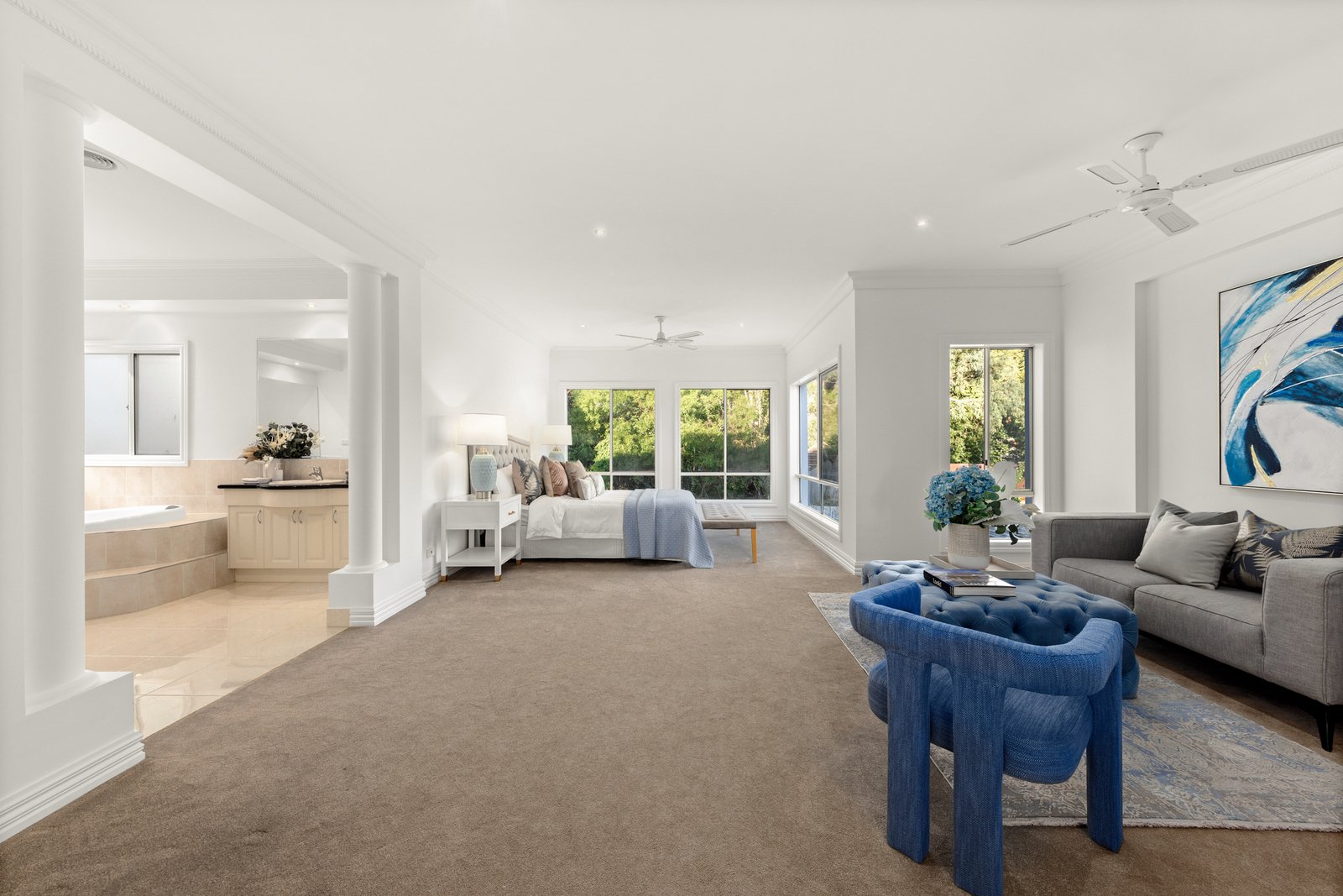 A home office, and four additional robed bedrooms share a modern family bathroom, and a Juliet balcony with treetop views. Outdoors, the secure backyard features a covered alfresco zone can be enjoyed throughout the year, complemented by a large entertainment area, and ample room for family activities.