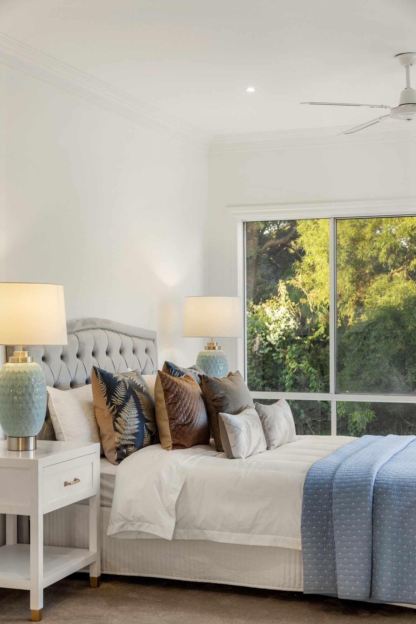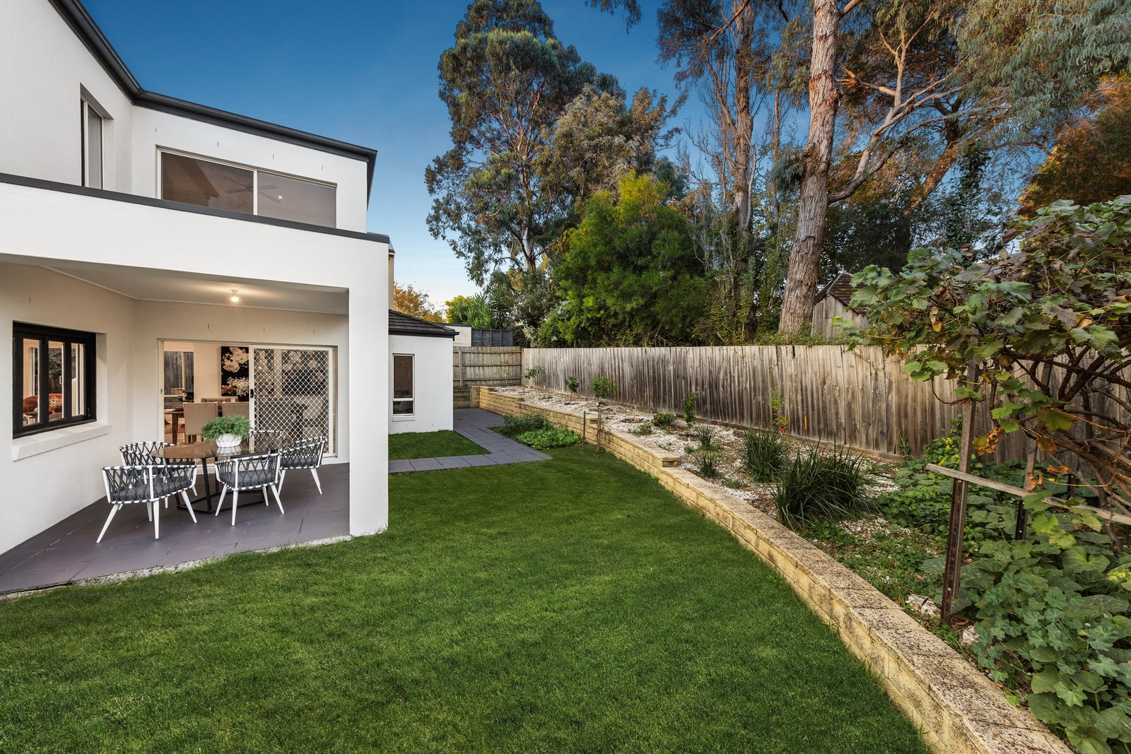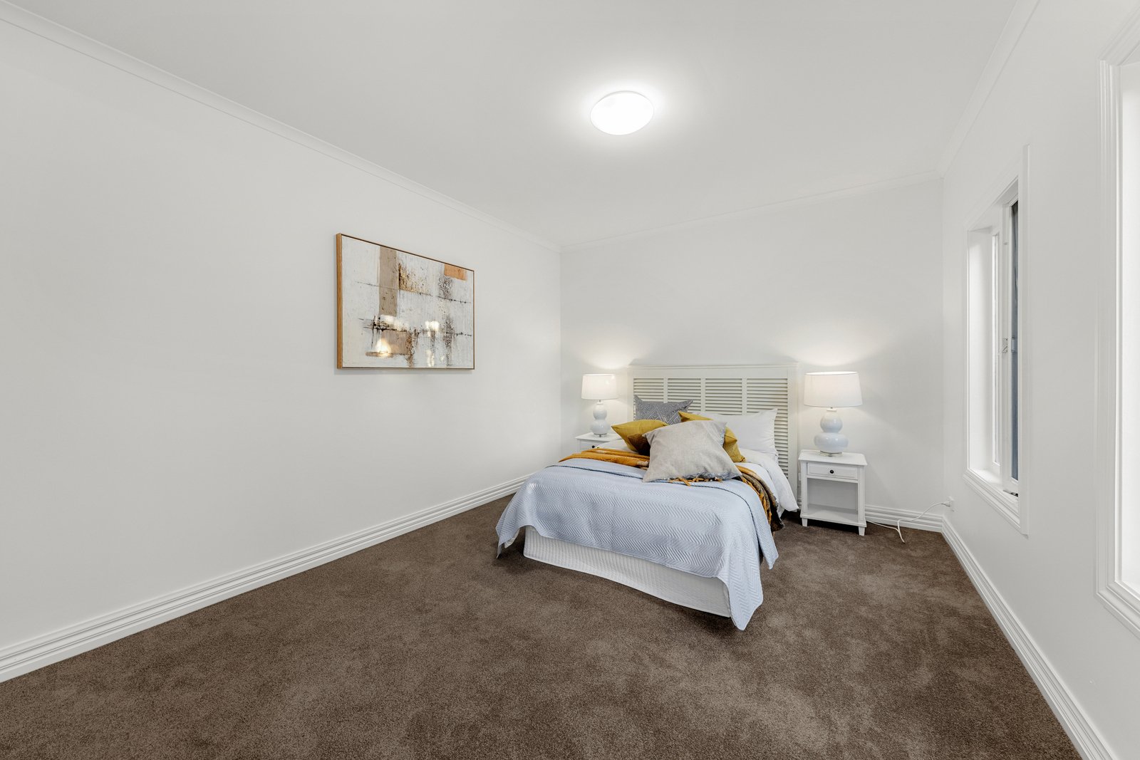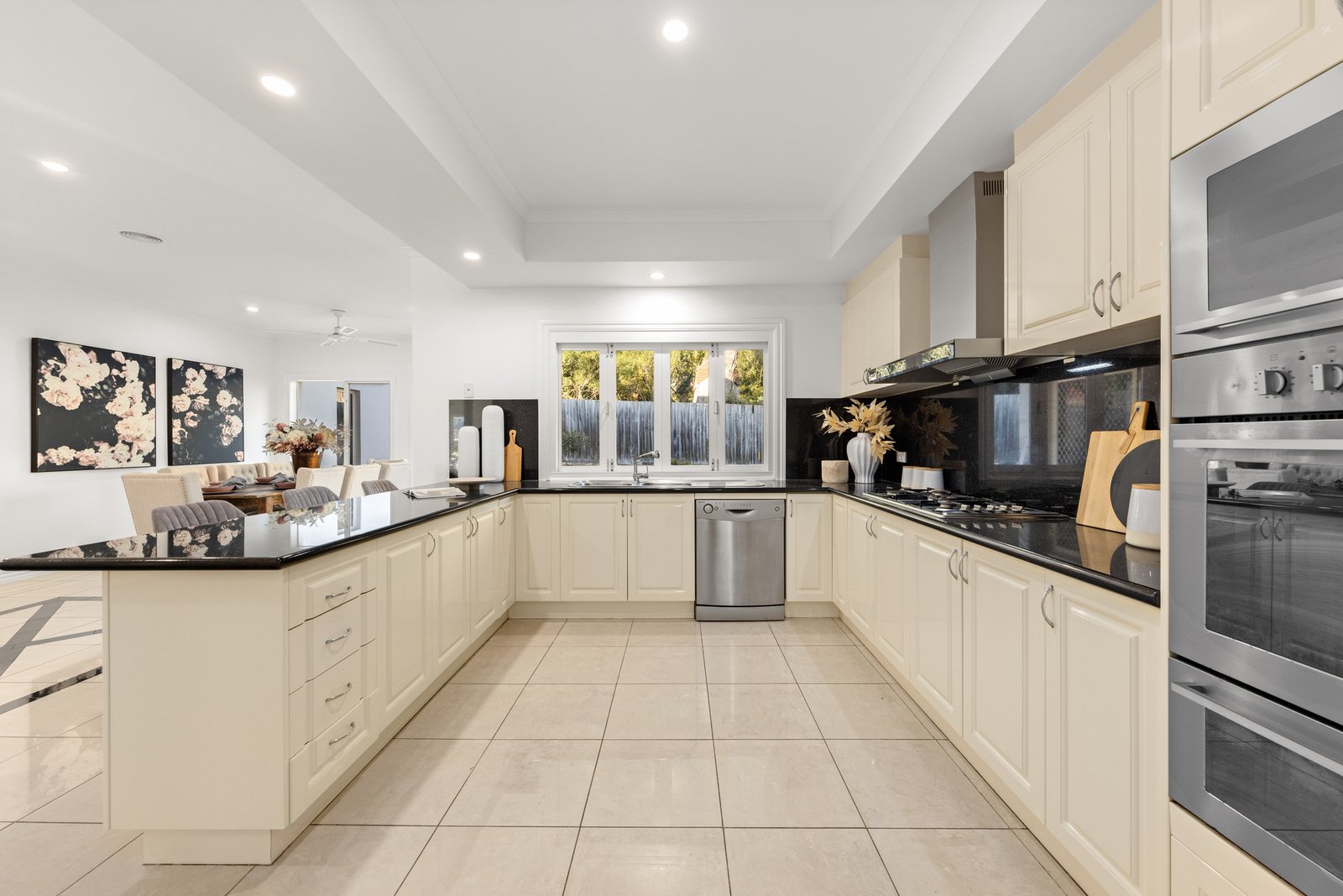 A home office, and four additional robed bedrooms share a modern family bathroom, and a Juliet balcony with treetop views. Outdoors, the secure backyard features a covered alfresco zone can be enjoyed throughout the year, complemented by a large entertainment area, and ample room for family activities.