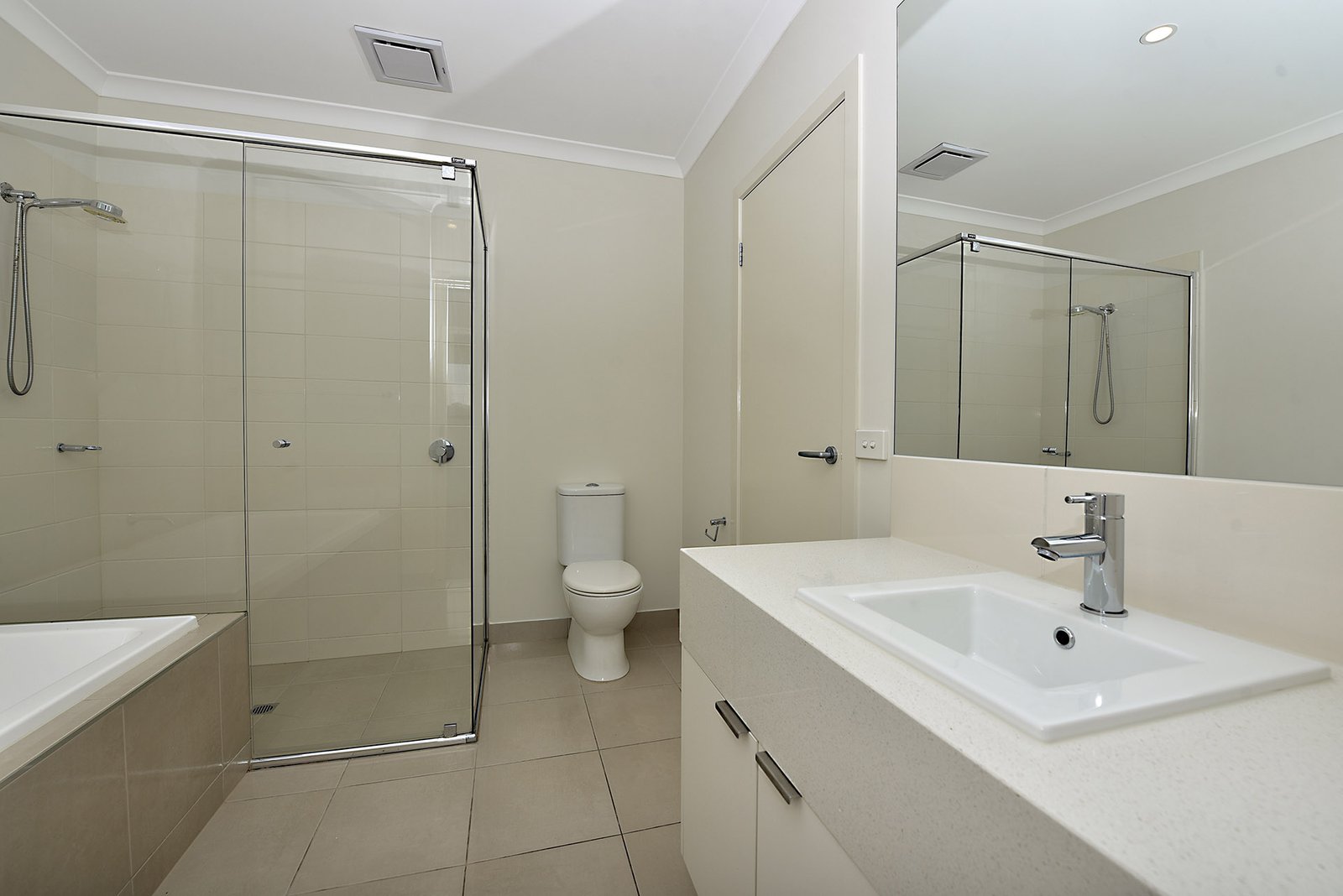 Upstairs includes main bedroom with BIR and balcony overlooking parkland, 2nd bedroom also with BIR, large central bathroom with separate shower and bath.