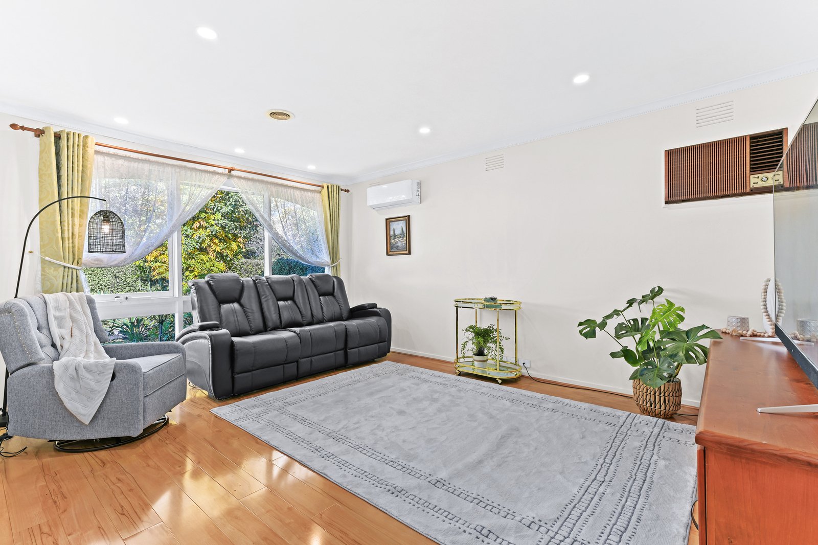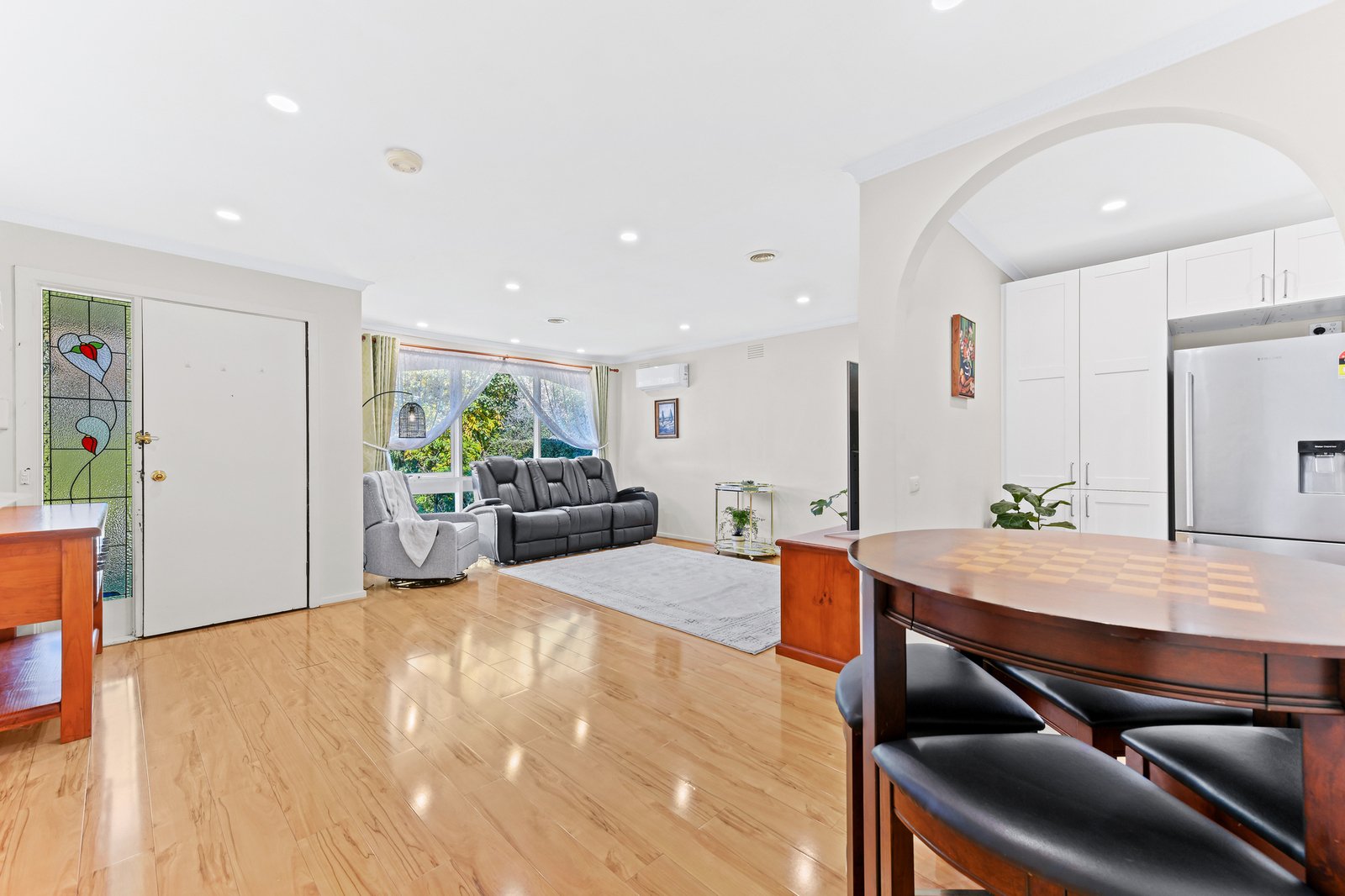 Opening via the screened leadlight door and welcoming porch, the pristine interiors reveal soft warm tones and graceful floating floors, presenting a cosy air-conditioned living room with lush leafy outlooks and a convenient open plan design.