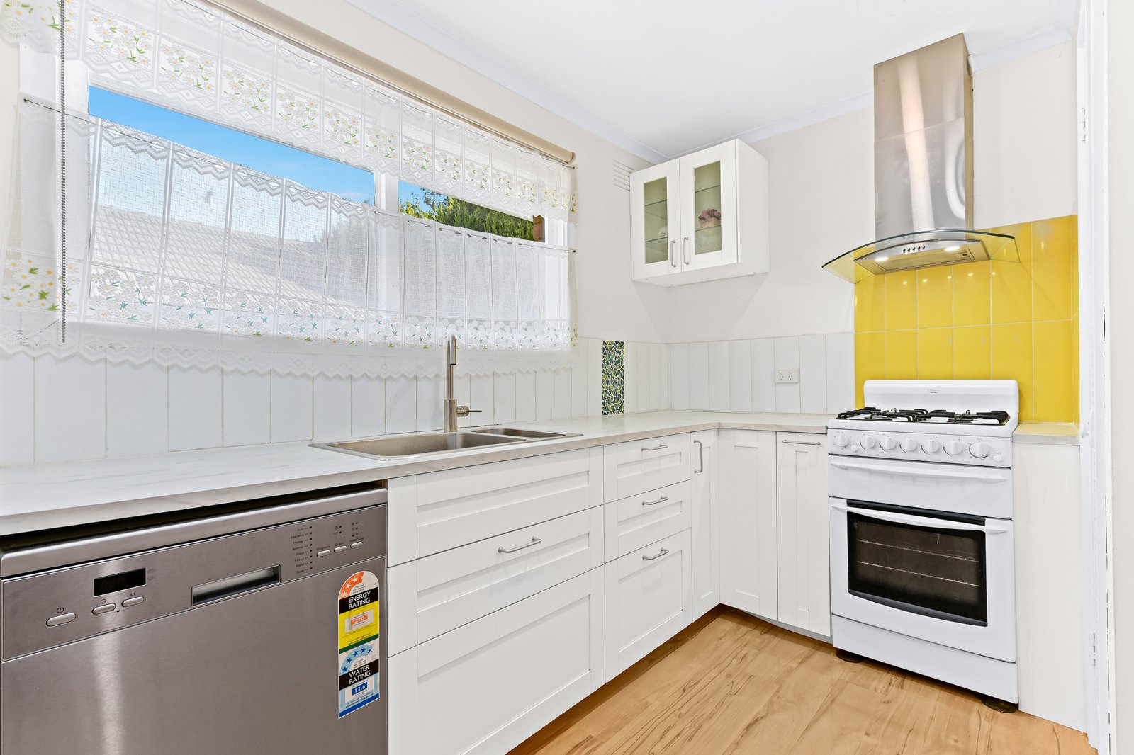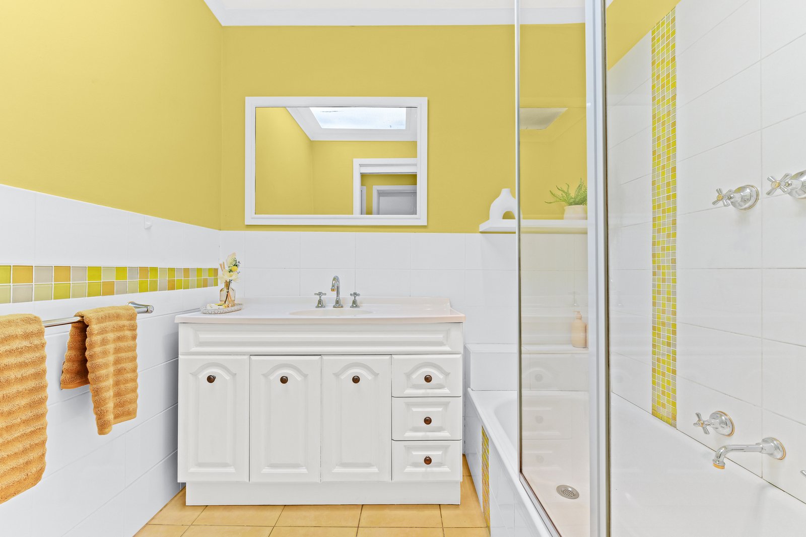 Completing the picture, both bedrooms are generous in size with the addition of built-in robes, while the neat family bathroom includes a shower over the bath and joyful yellow tones that complement glimpses of bright blue sky via the skylight.