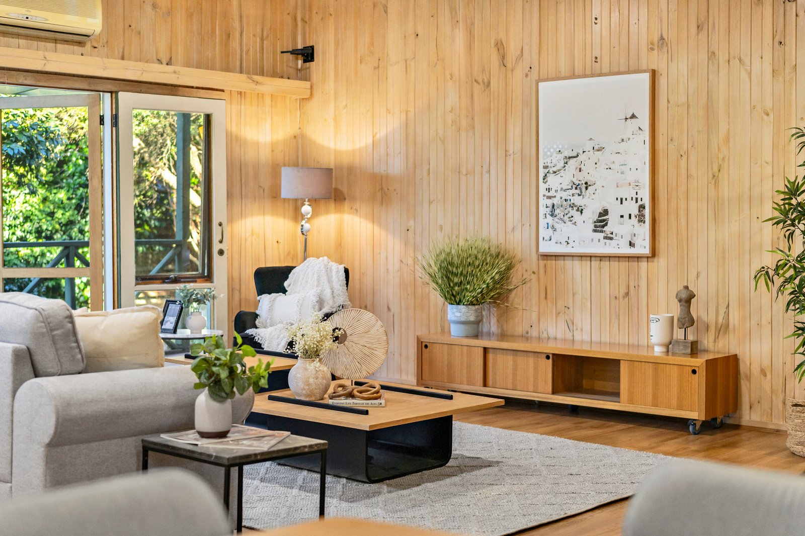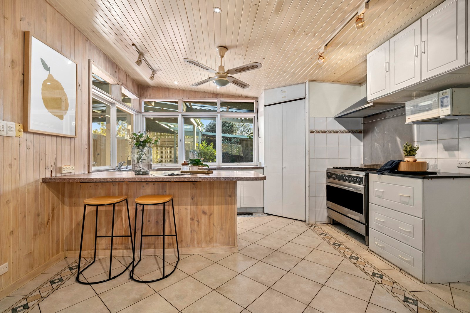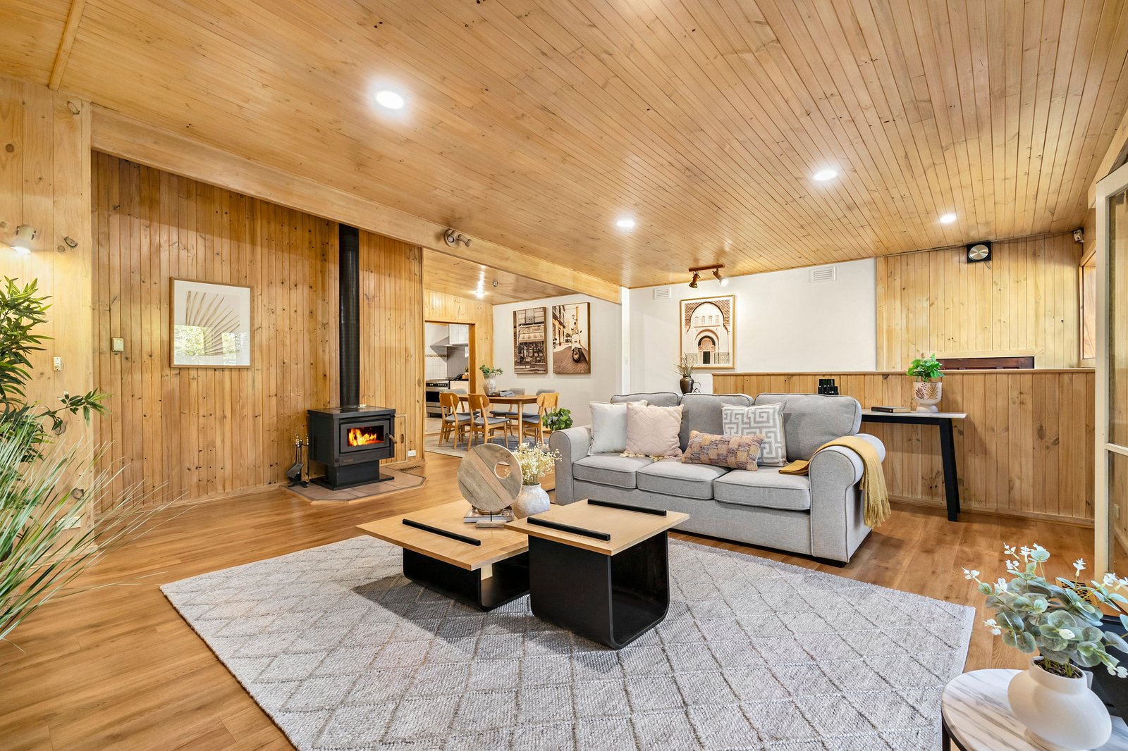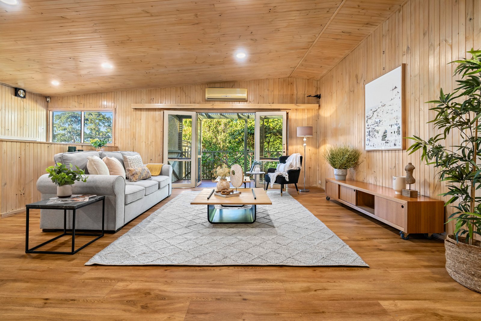 Privately secured behind high fencing and garden screening, the home charms with its unique L-shaped layout – detailed by hybrid floating floors and decorative timber walls for a sense of warm, rustic charm.