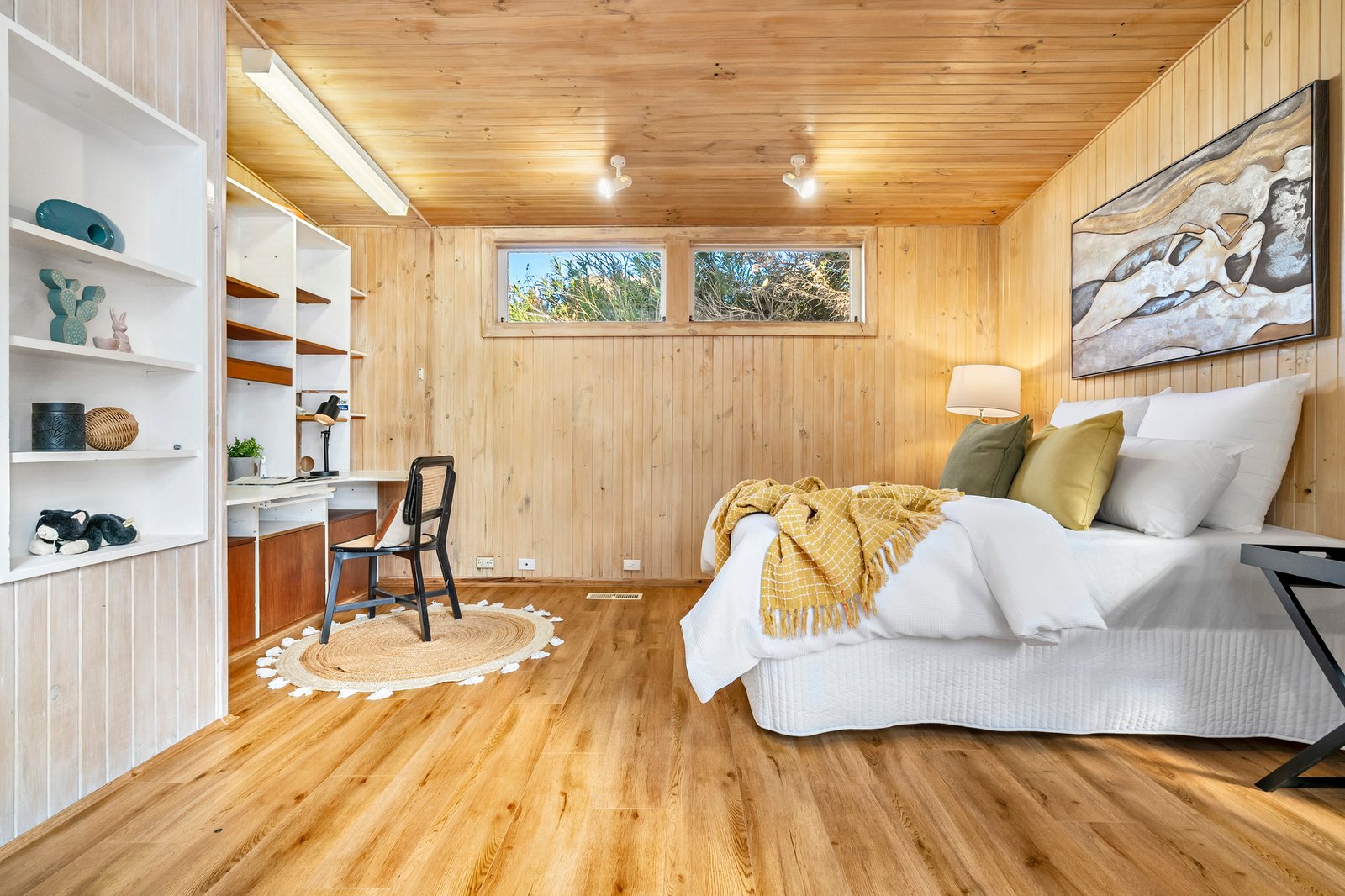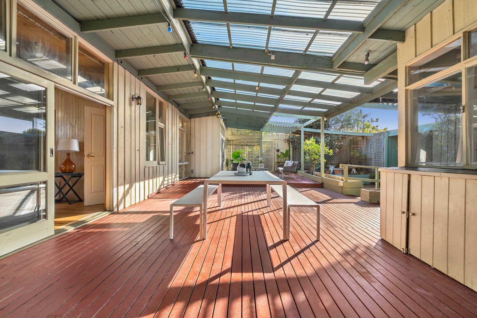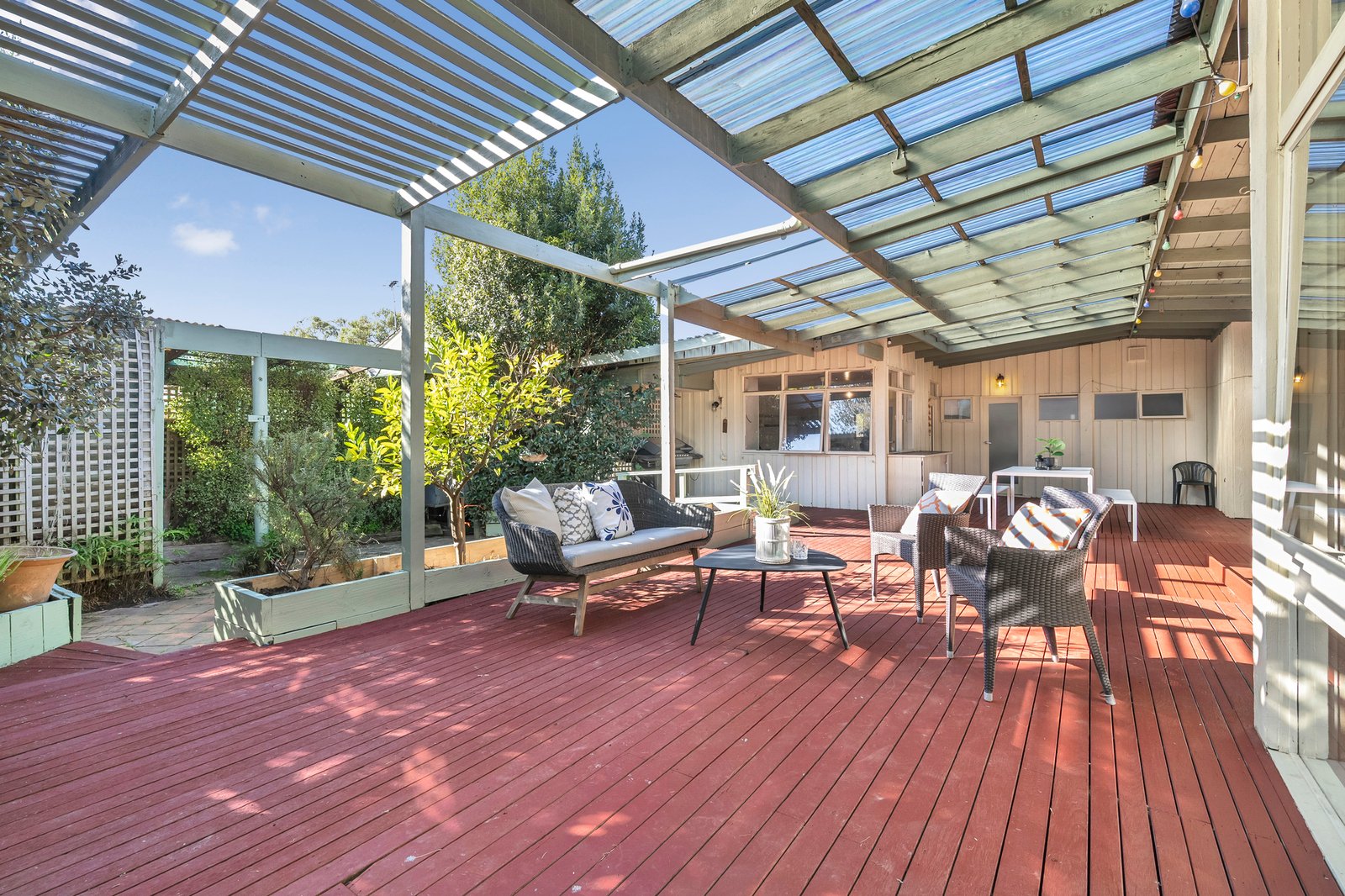 Privately secured behind high fencing and garden screening, the home charms with its unique L-shaped layout – detailed by hybrid floating floors and decorative timber walls for a sense of warm, rustic charm.
