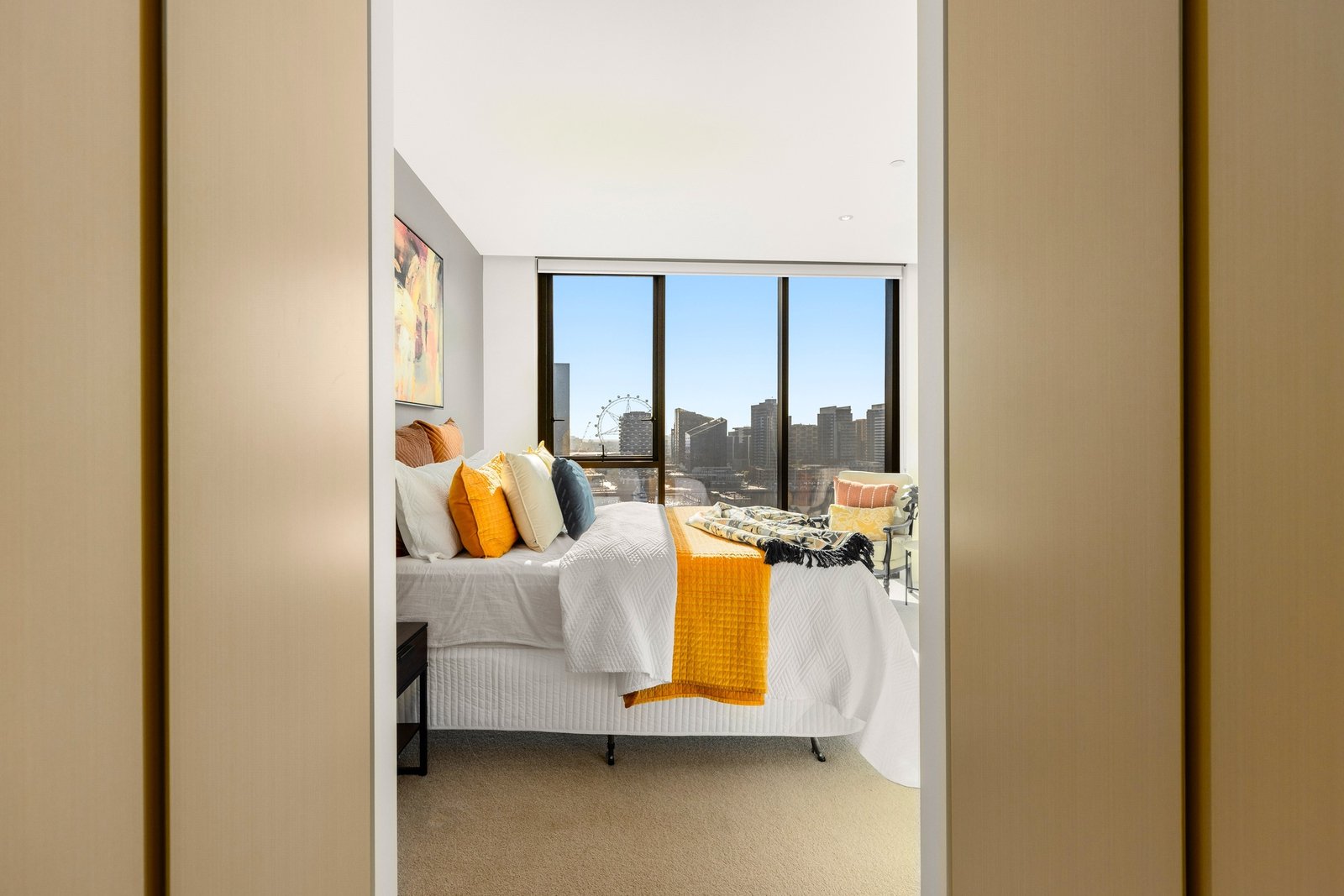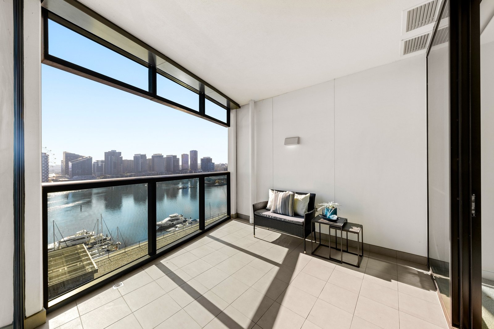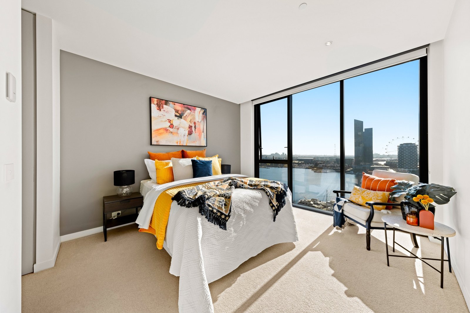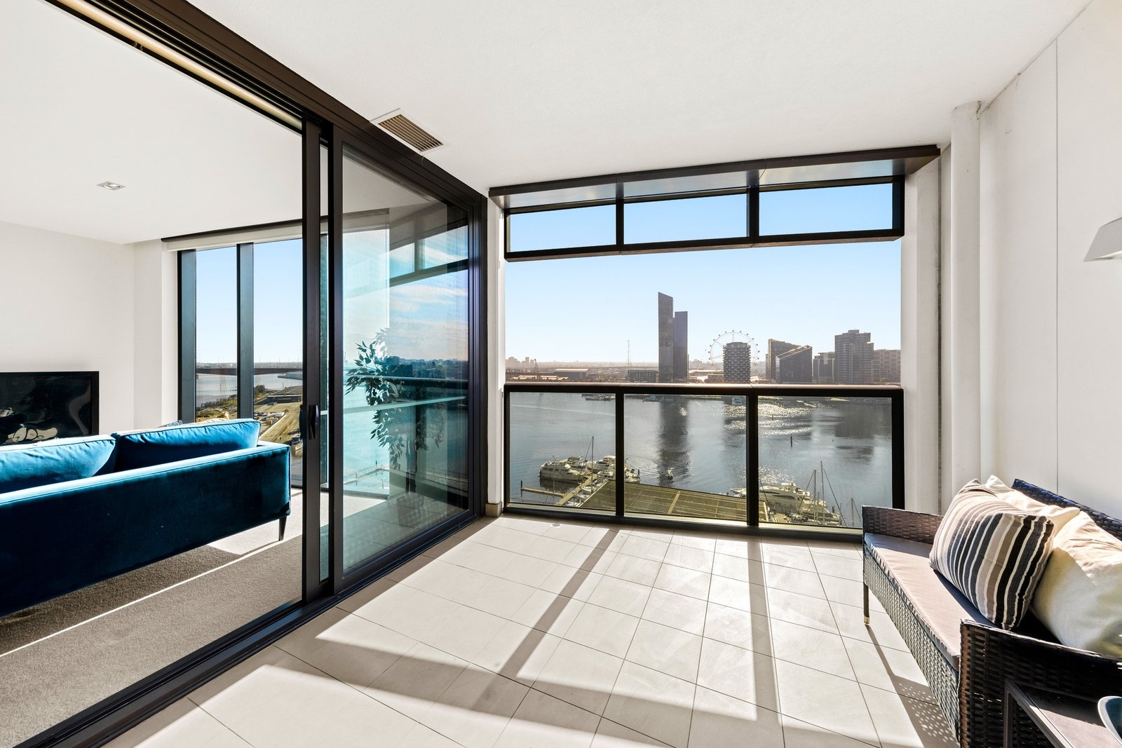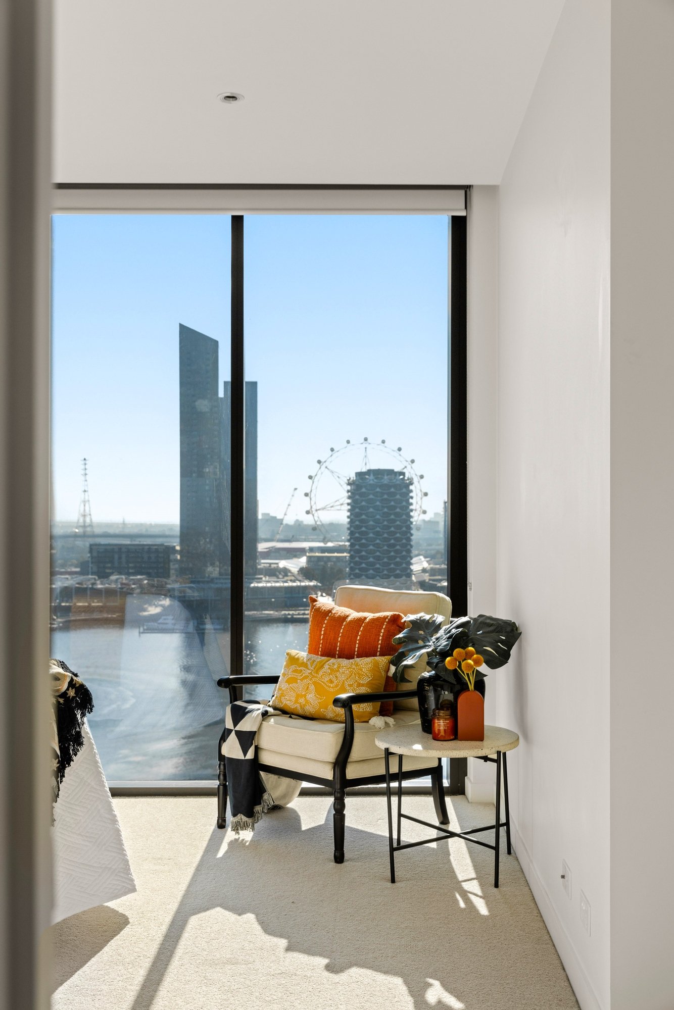 • living area showcases breathtaking water views overlooking the Melbourne Star