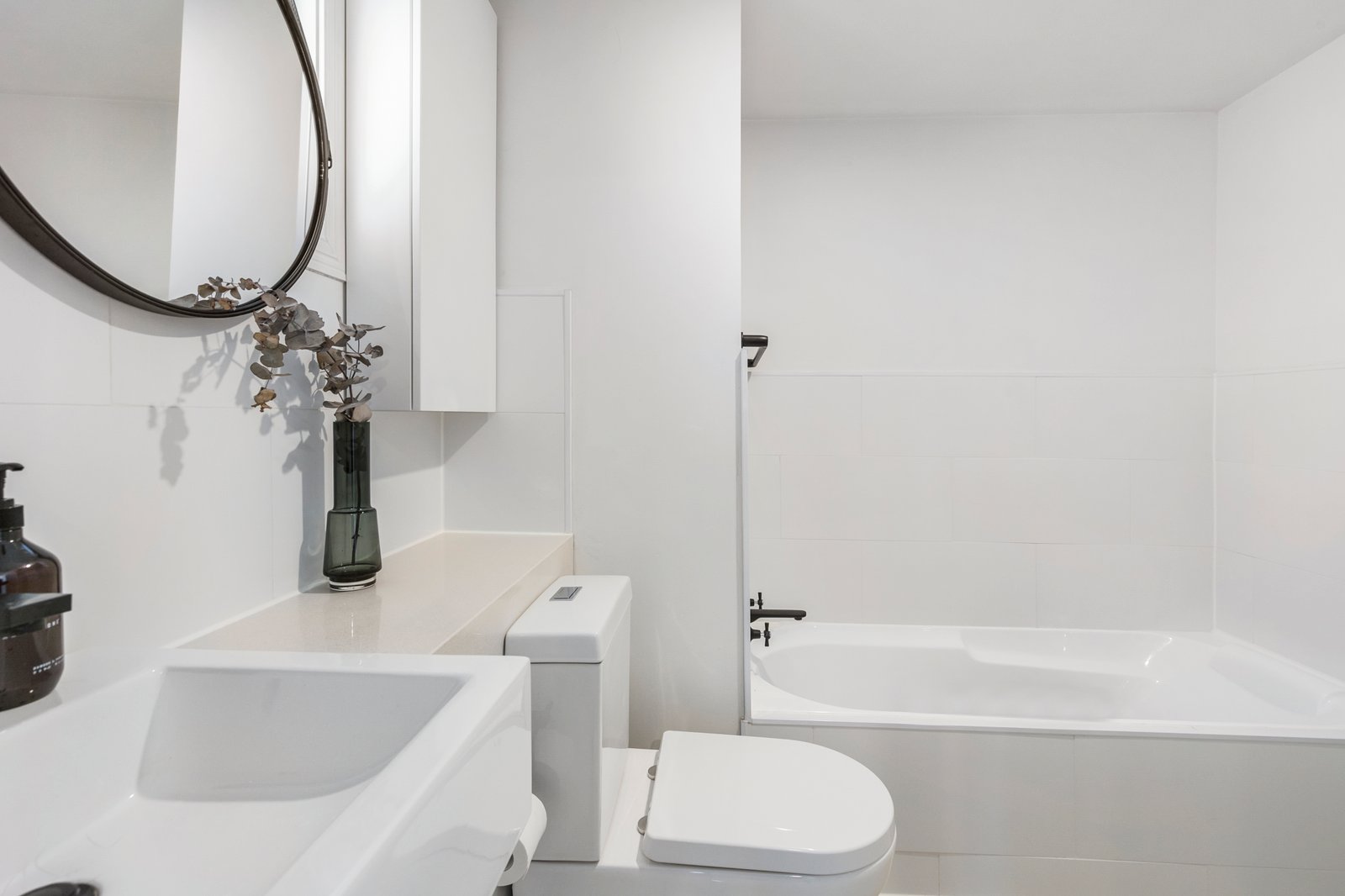 The ground floor bedroom is filled with natural light and has direct access to the downstairs bathroom, making it ideal for guests or anyone who prefers ground floor living. The large master bedroom is located upstairs and offers even more space and privacy, complete with built-in-robes and additional storage across the mezzanine level. The main bathroom includes a luxurious bath, shower, cabinets, and ample storage space, adding a touch of elegance to the space.