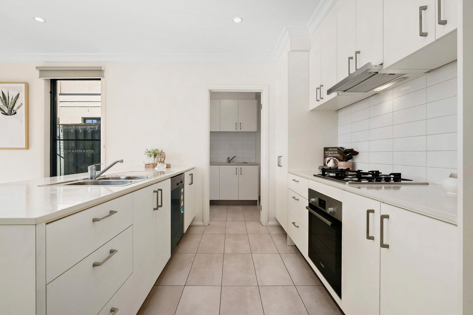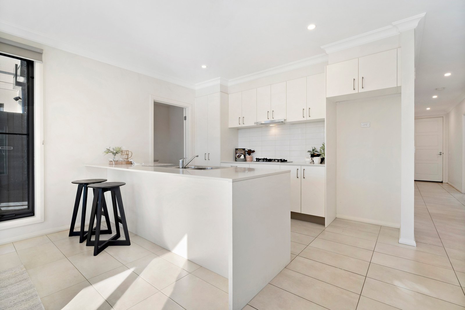 An open plan kitchen frames the main living wing in absolute style, providing lovely natural light for cooking, and premium Bosch appliances including a gas stovetop.