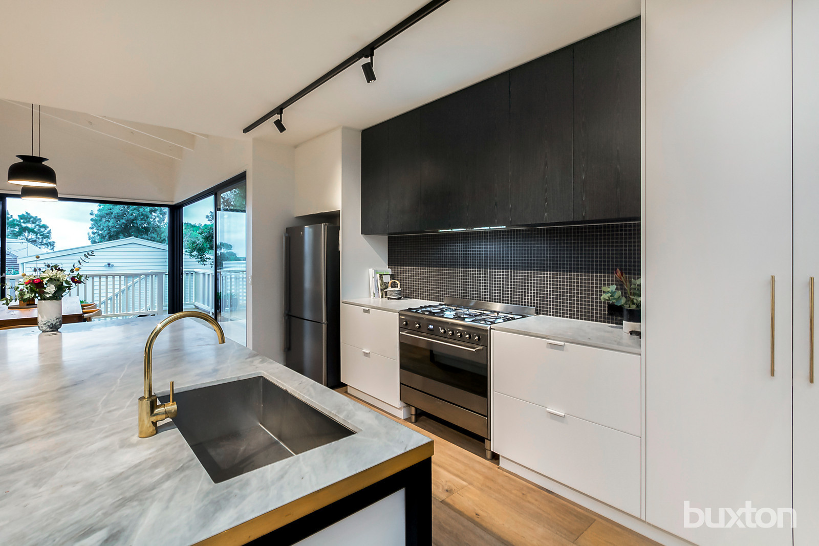 The stunning and functional kitchen includes smeg appliances and beautiful Elba marble bench tops finished with a brass trim.