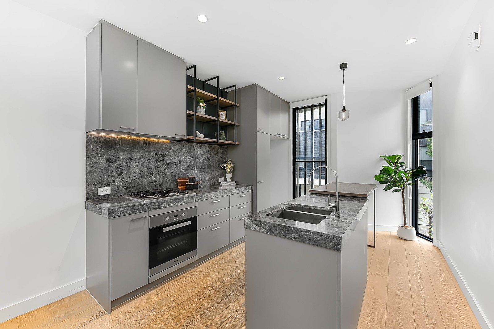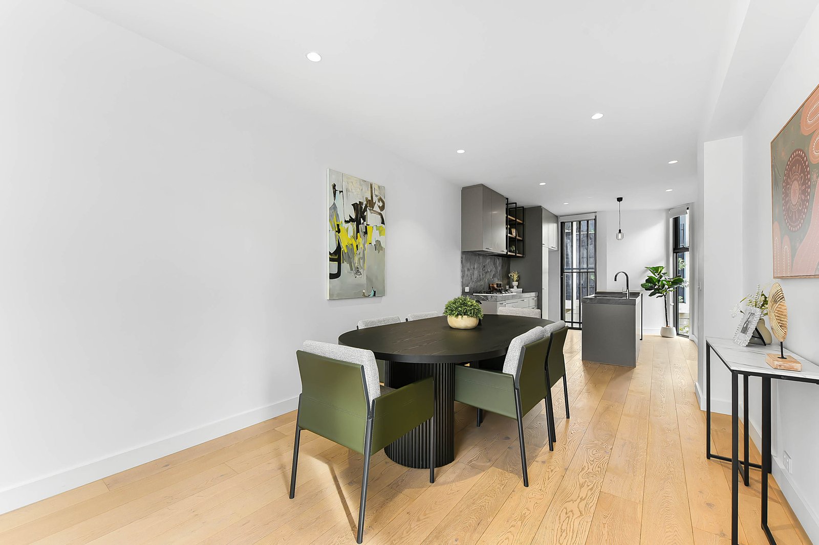 Set across three levels, high square set ceilings, natural light throughout and modern LED downlights enhance the spacious vibe. The laneway access leads to a ground-floor oversized single lock-up garage. The open-plan living and dining area is accentuated by a balcony and full-height glass sliding doors, creating a bright and airy atmosphere. Stunning timber-look floating floorboards and roller blinds add to the modern design, while floating timber tread staircases with LED sidelights punctuate the luxe aesthetic.