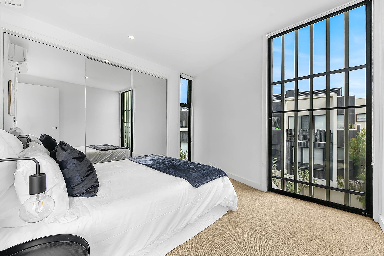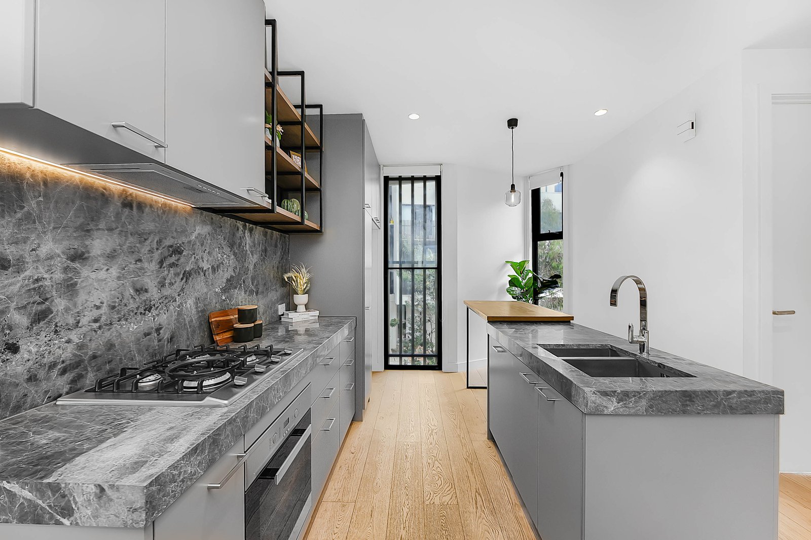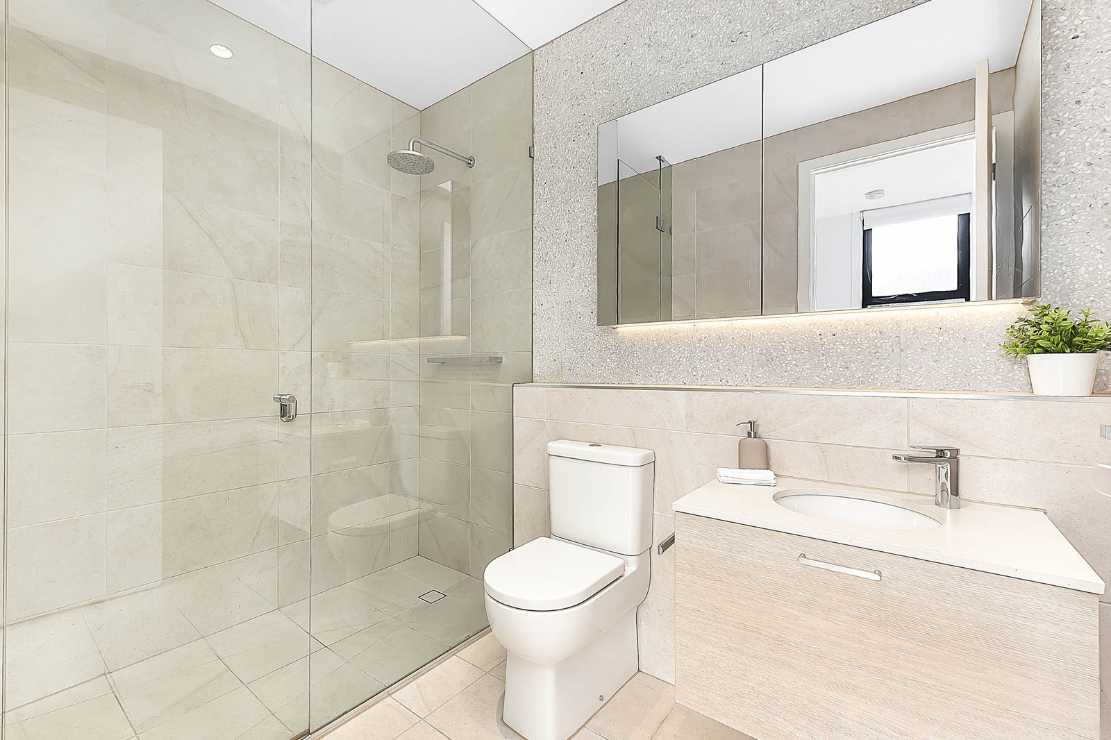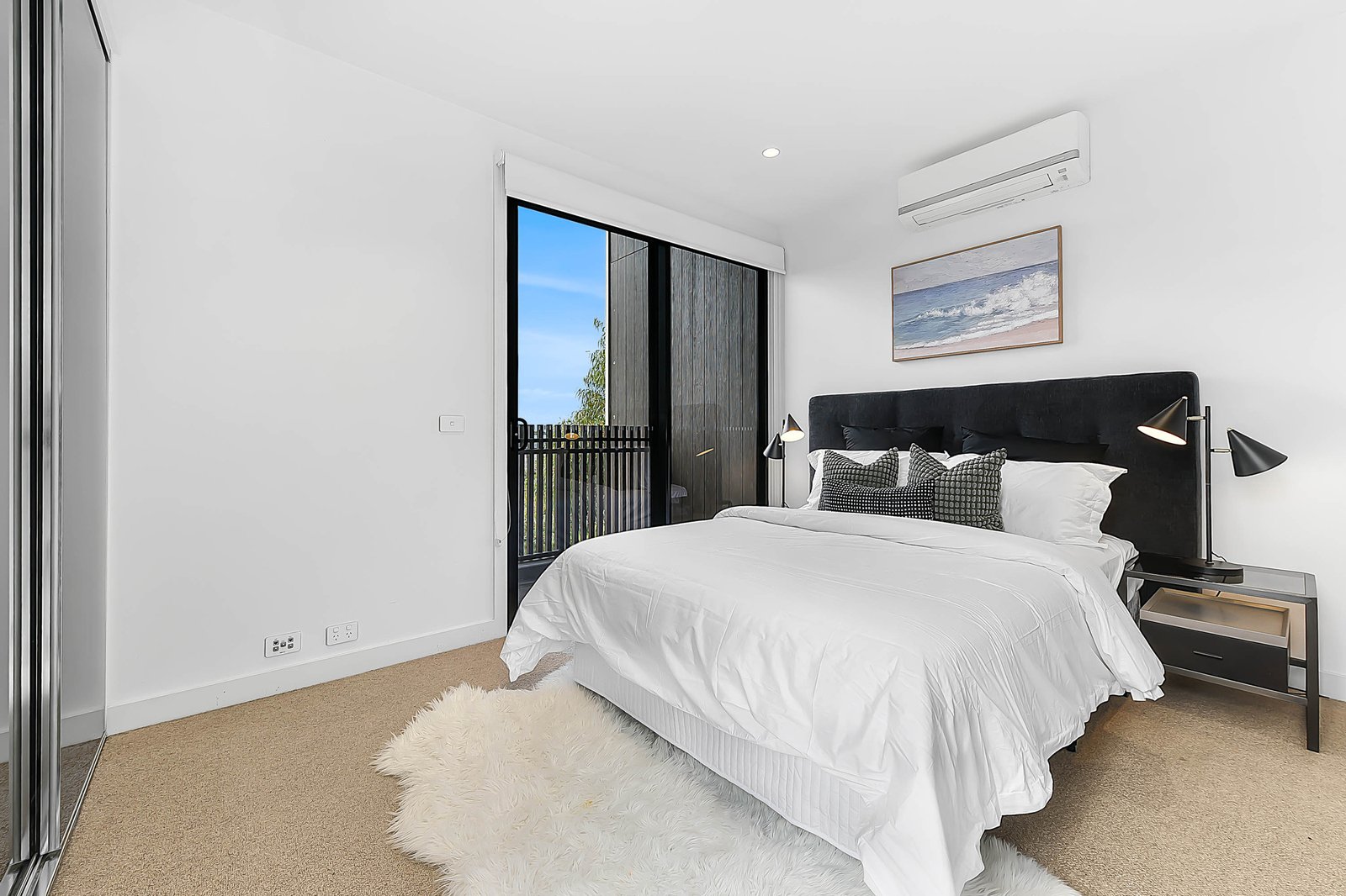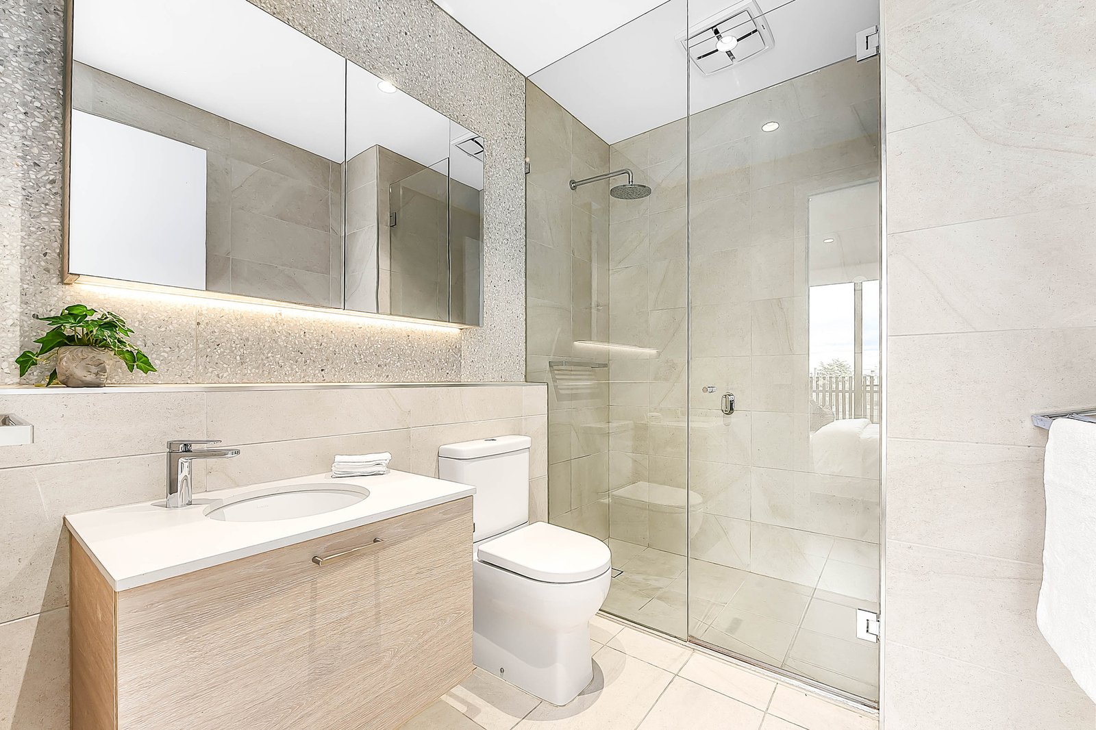The air-conditioned master bedroom features a private balcony, premium carpet and an ensuite. All three bedrooms enjoy built-in robe storage. The bathrooms are luxuriously appointed with terrazzo stone feature walls, full-height wall tiles, LED strip lighting and stone-top vanity units. The main bathroom's fully frameless shower is double width, adding to the luxurious feel.
