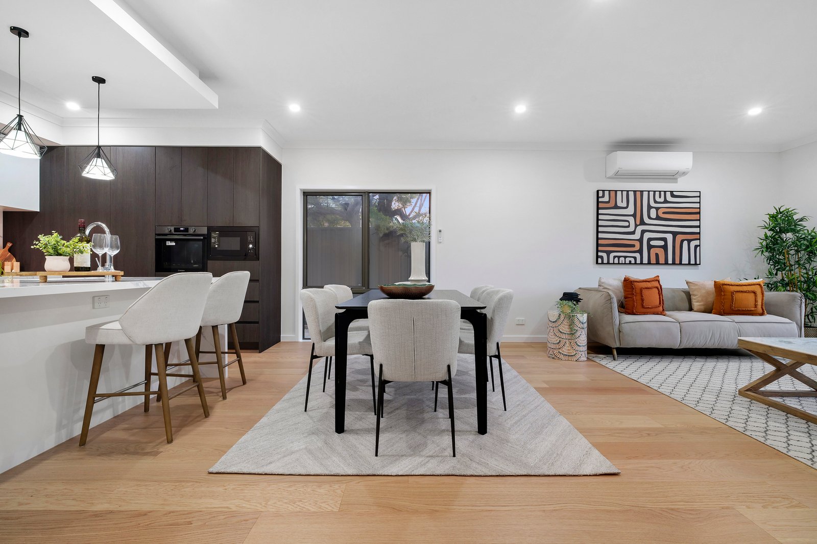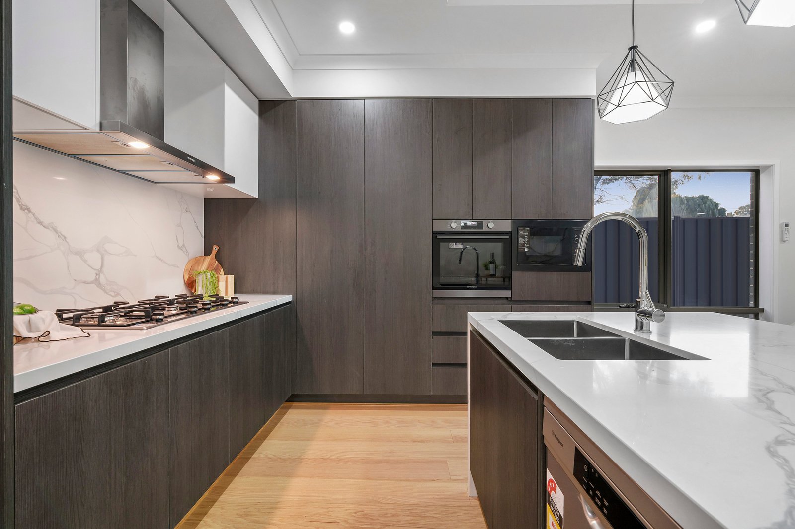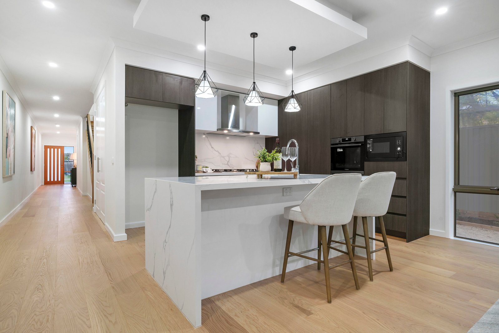 A stylish array of features and finishes makes for a town home that’s completely on trend – perfectly on show in the dark cabinetry and floating ceiling of the striking kitchen, and the statement black bathroom tapware.