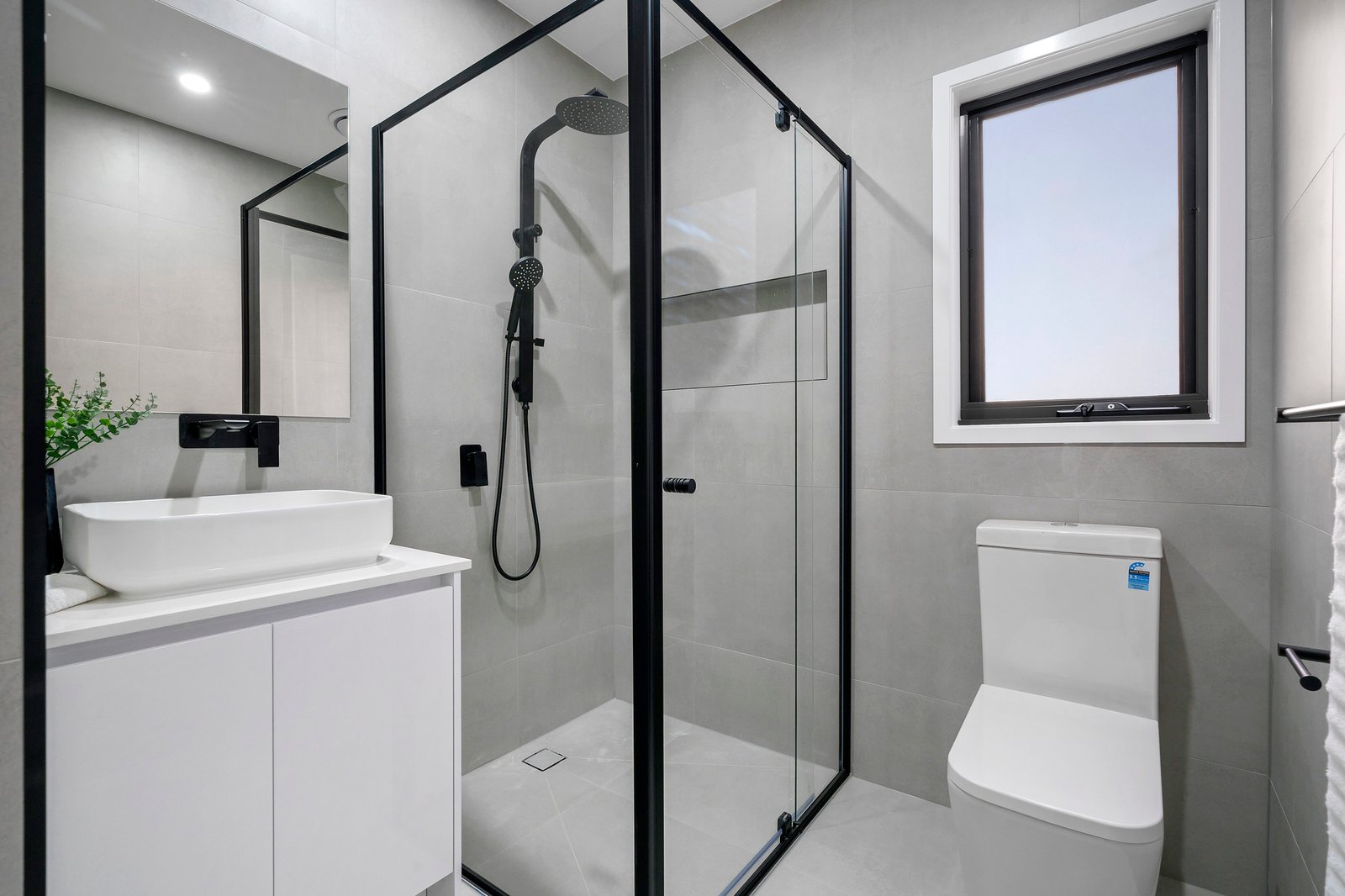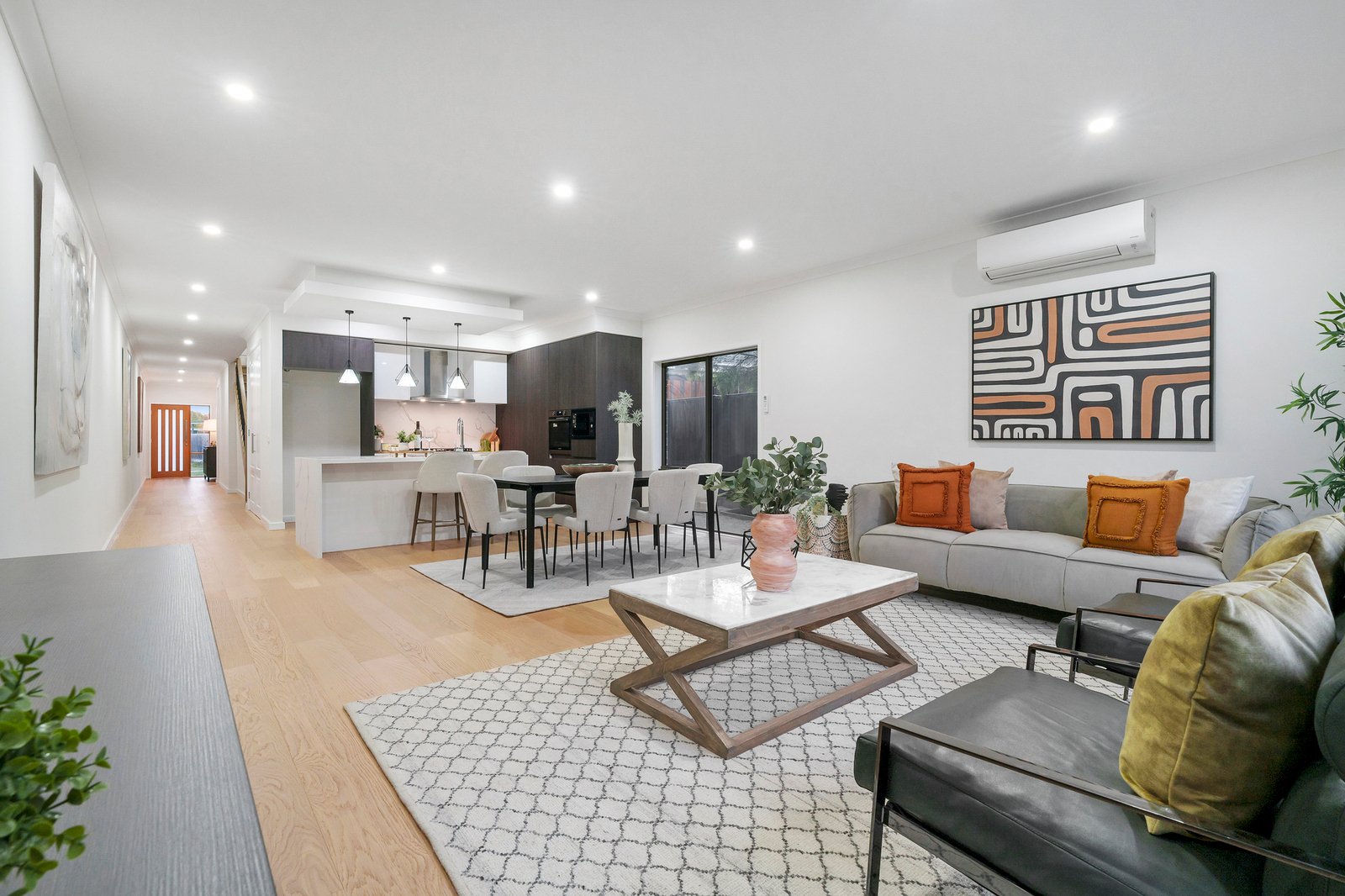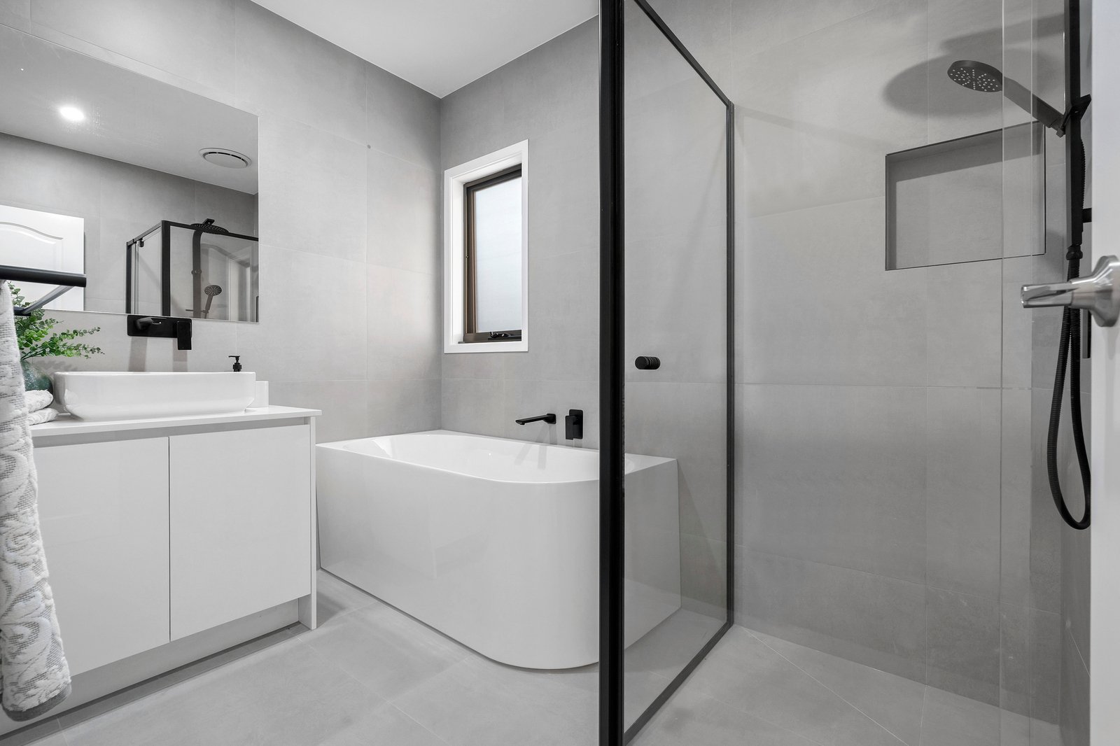 A stylish array of features and finishes makes for a town home that’s completely on trend – perfectly on show in the dark cabinetry and floating ceiling of the striking kitchen, and the statement black bathroom tapware.