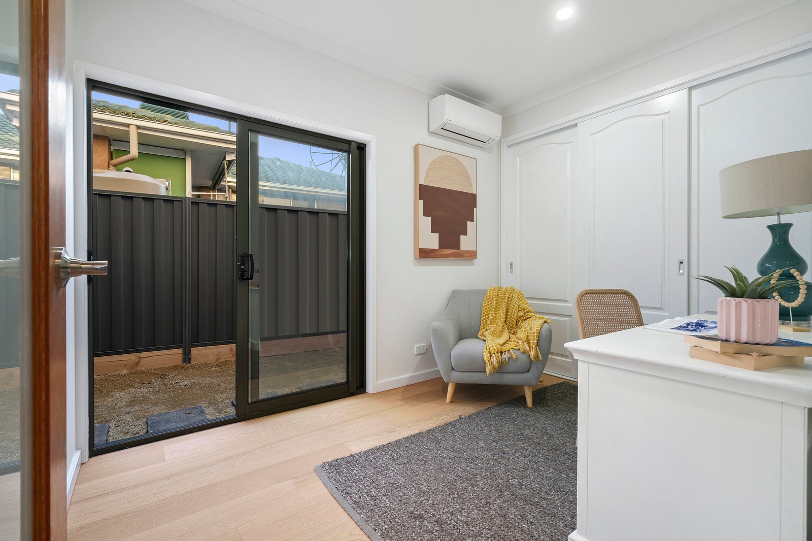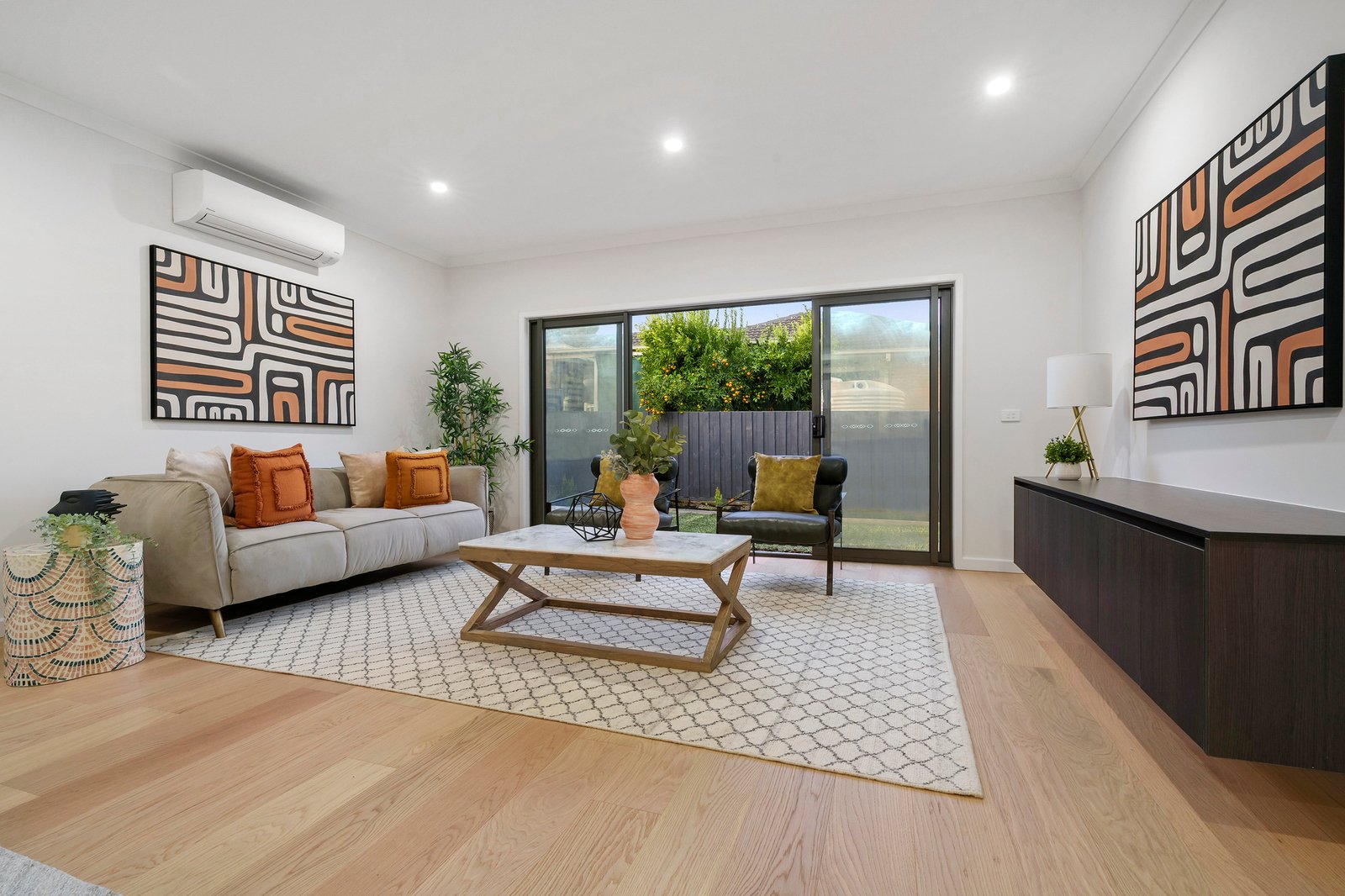 Beautiful natural light creates an inviting family room with a clever built-in low line TV shelf – designed for warm, relaxed indoor-outdoor flow between the north facing living wing and the landscaped garden.