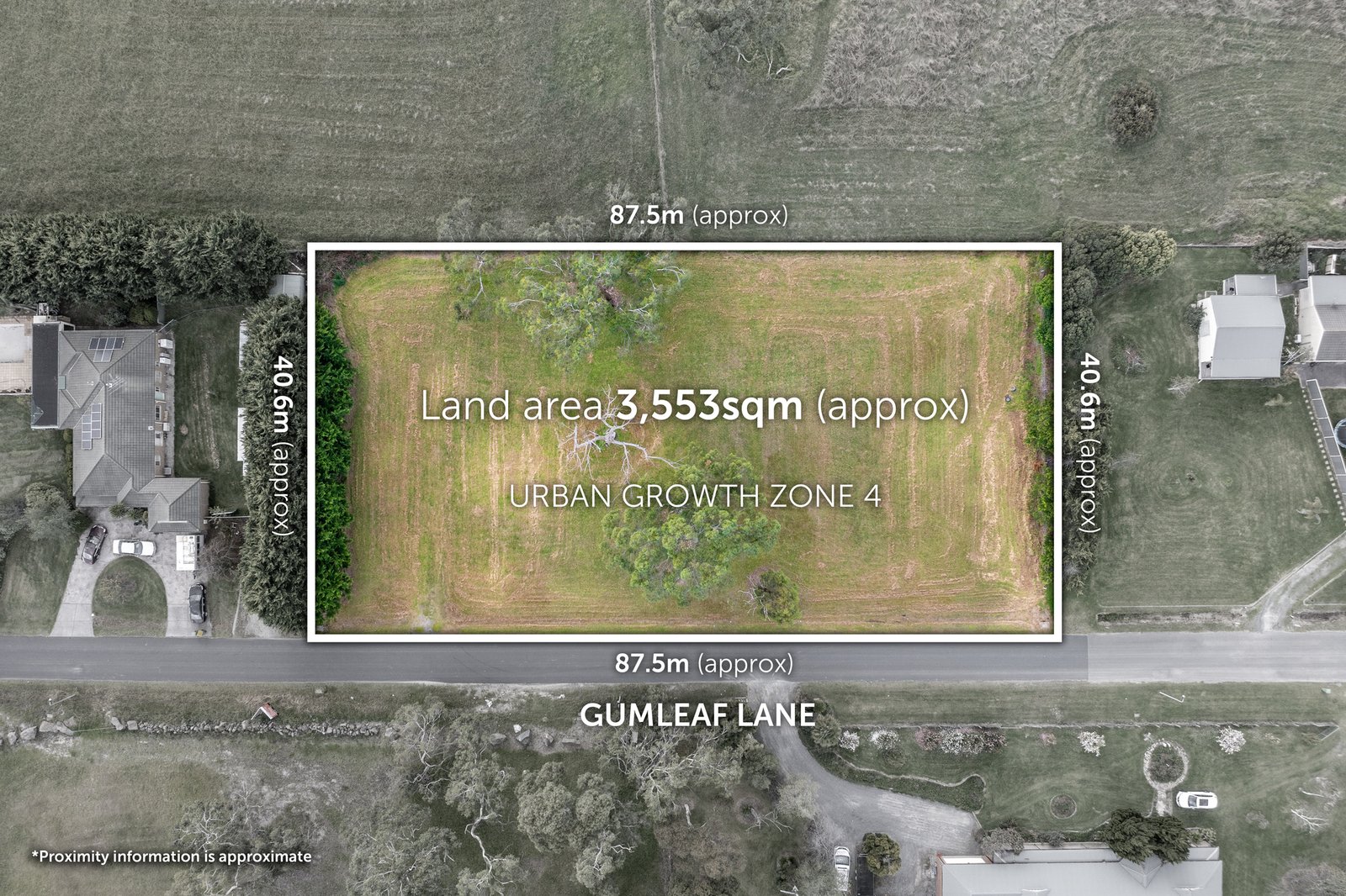 - Shape: Rectangular, with approximately 88m* frontage to Gumleaf Lane and a depth of approximately 40m*, totaling around 3554 sqm.