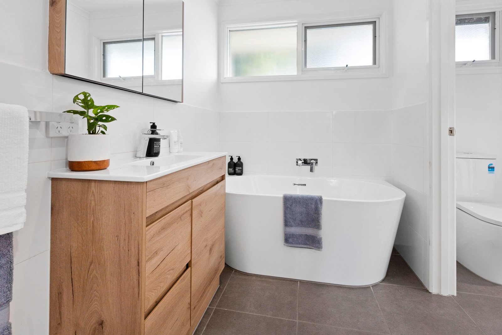 A divinely updated family bathroom boasts a deep bathtub, timber vanity and a two-way toilet, which can also be accessed via the laundry, while all three bedrooms boast built-in robes, roller blinds and plush charcoal carpeting.