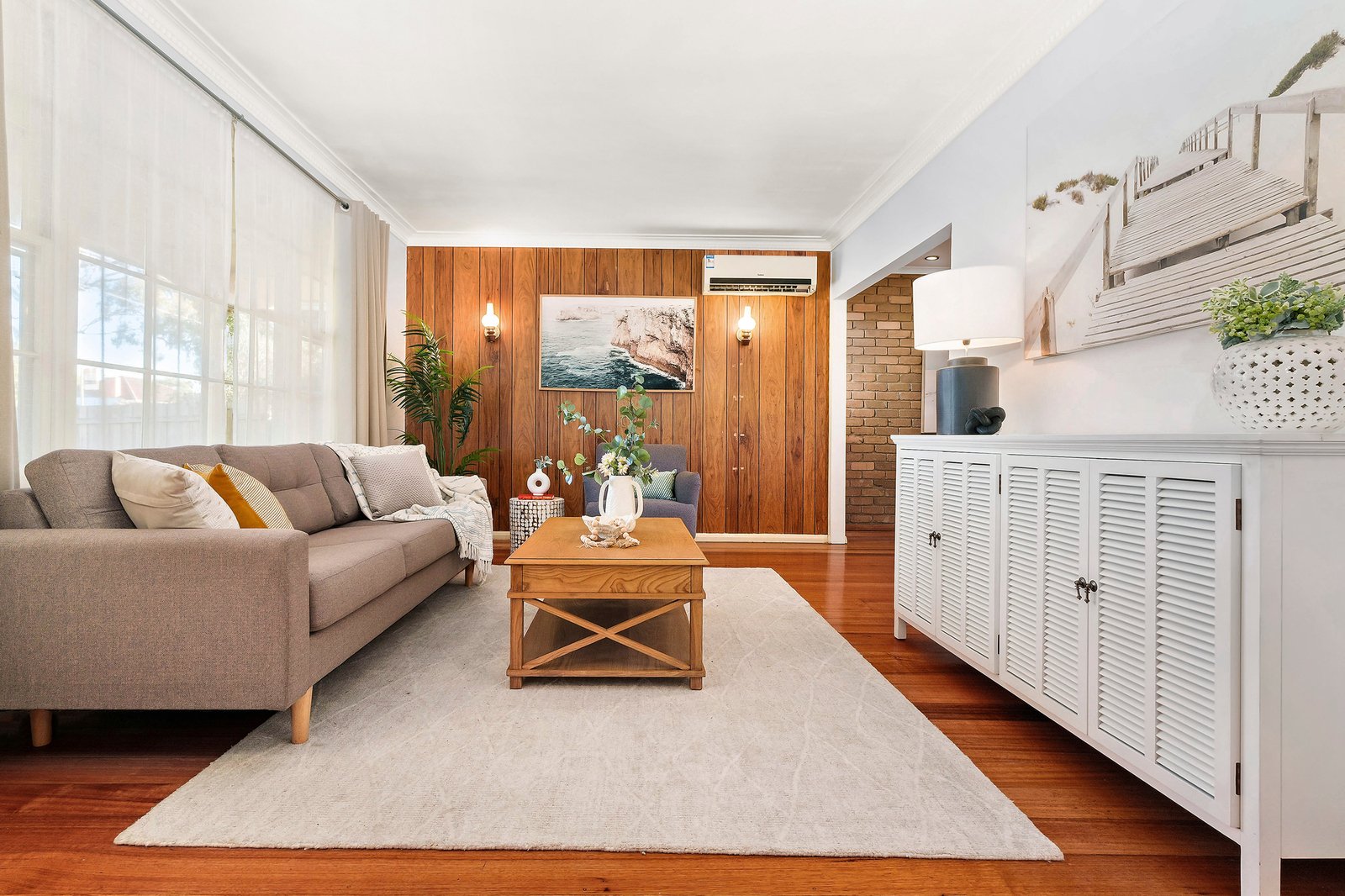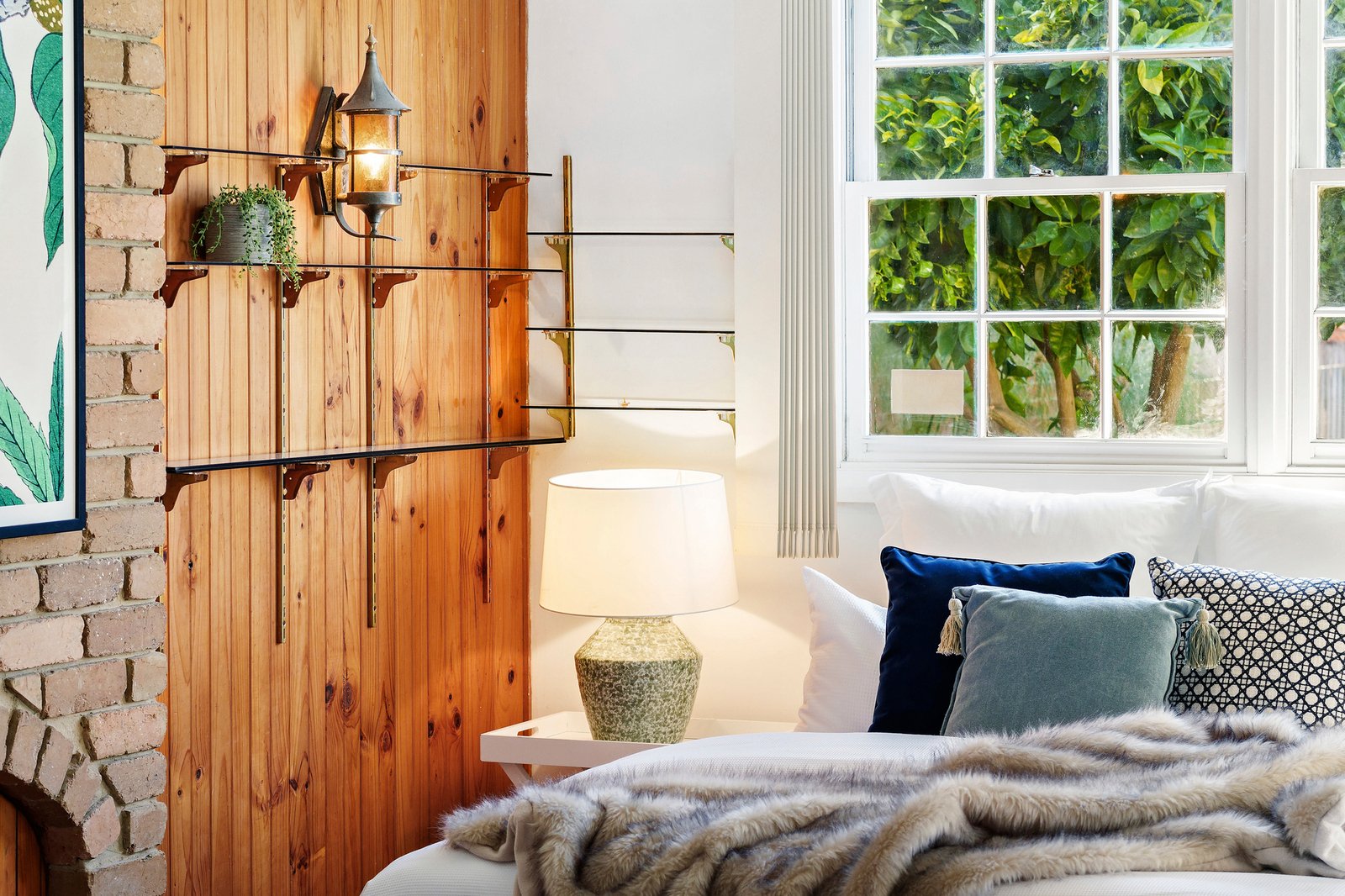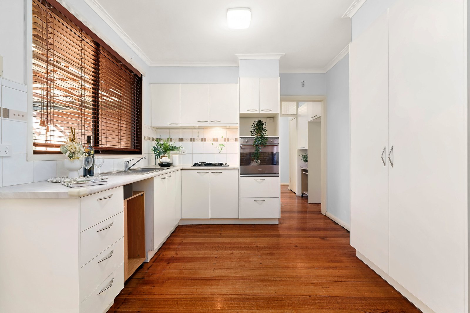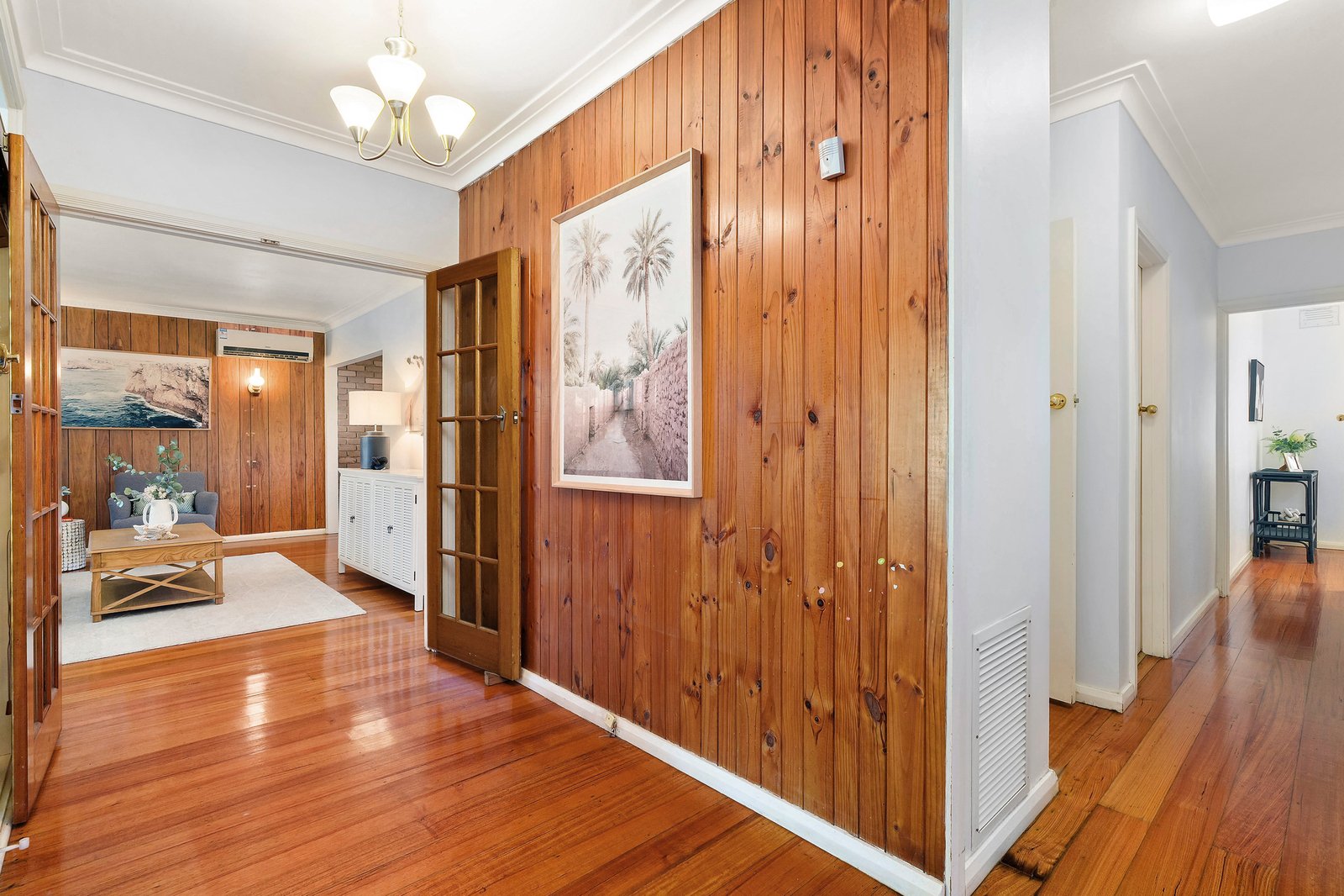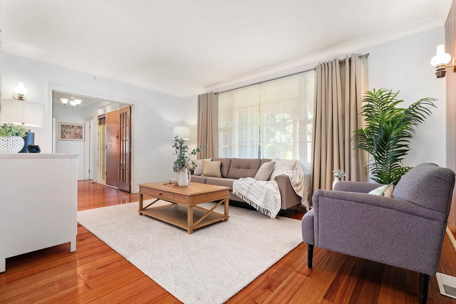 Inside, the home is awash with natural light and detailed by the polished hardwood floors and corniced ceilings of its mid-century era.