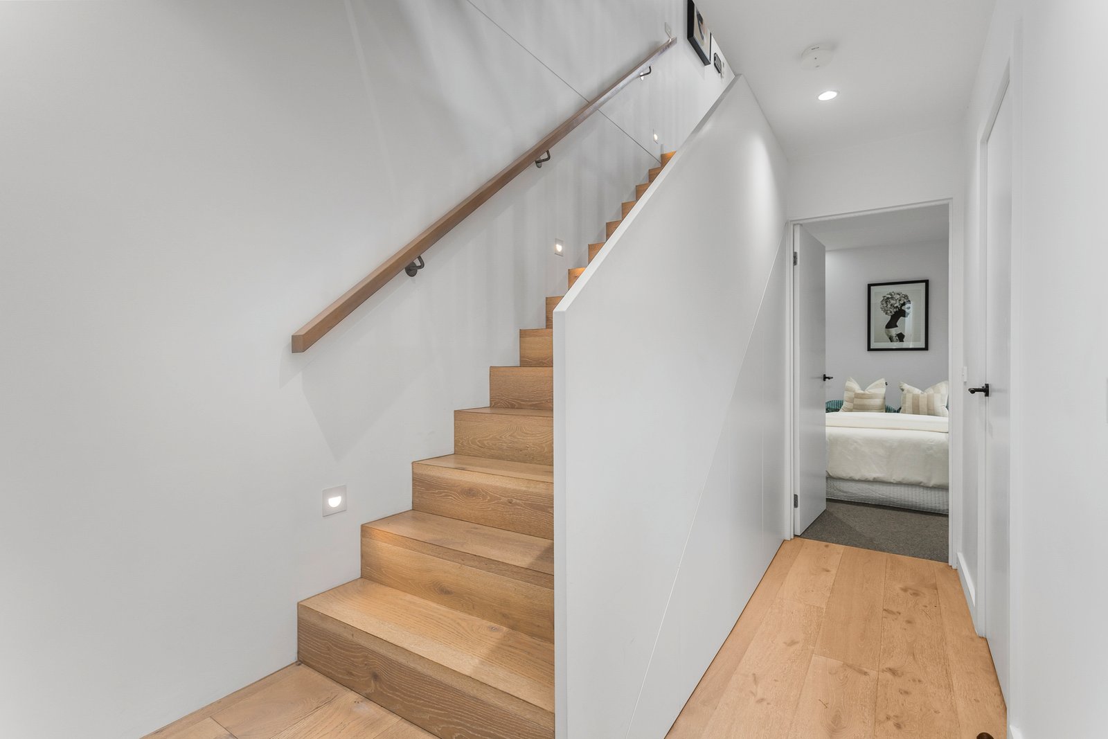 Ascend the stairs to a light-filled oasis, where luxurious living and dining areas showcase wide floorboards and a fabulous ambiance. The stunning kitchen is a chef’s dream, equipped with a Miele stove, oven, and dishwasher, and highlighted by a feature window. Sliding doors from the lounge extend this space to the balcony, perfect for relaxing or entertaining.