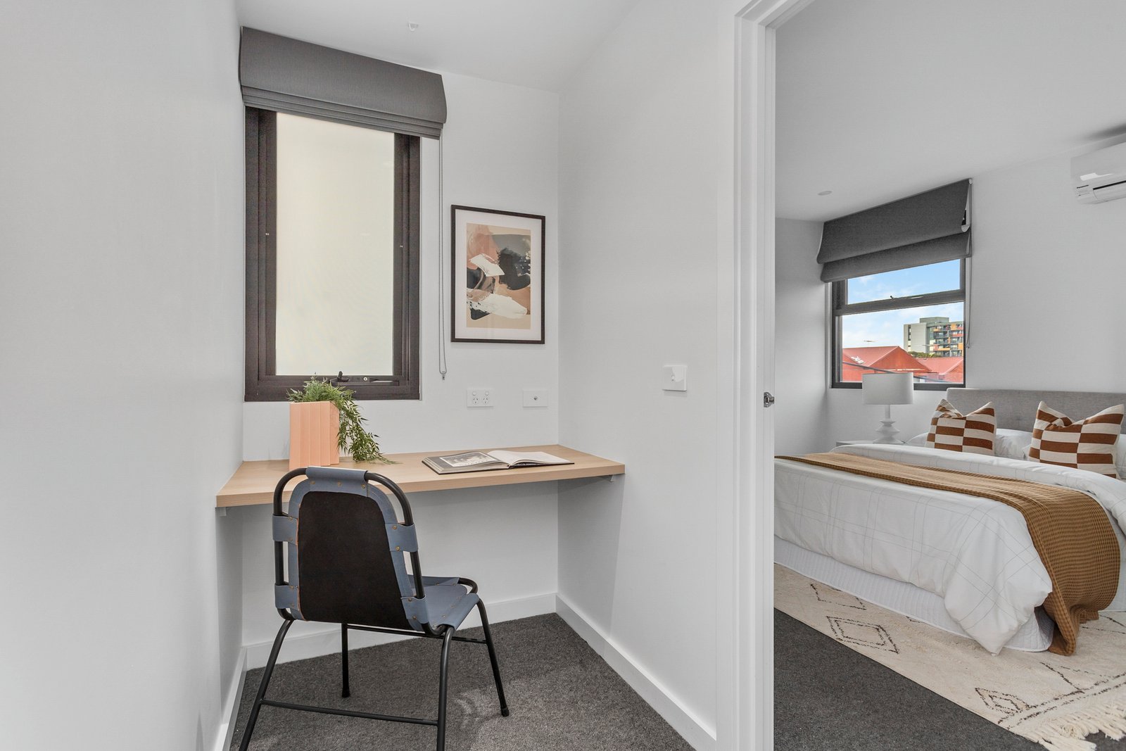 Upon entry, you are greeted by a thoughtfully designed study nook and a spacious bedroom...