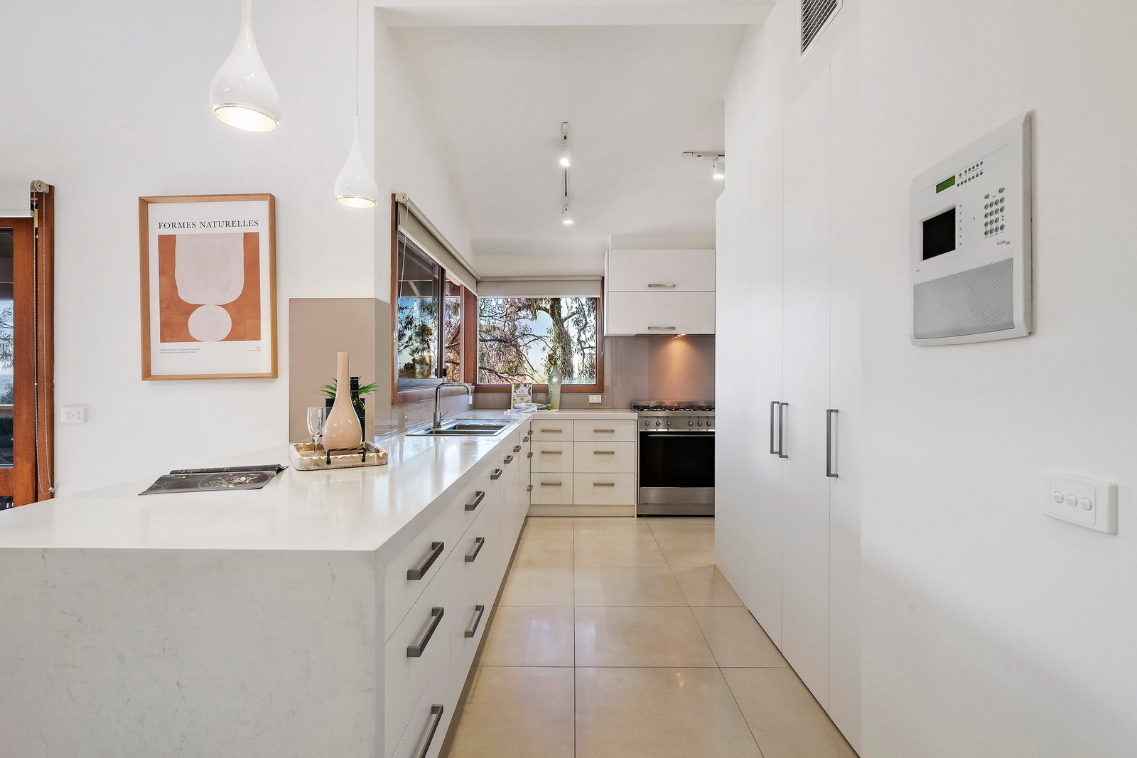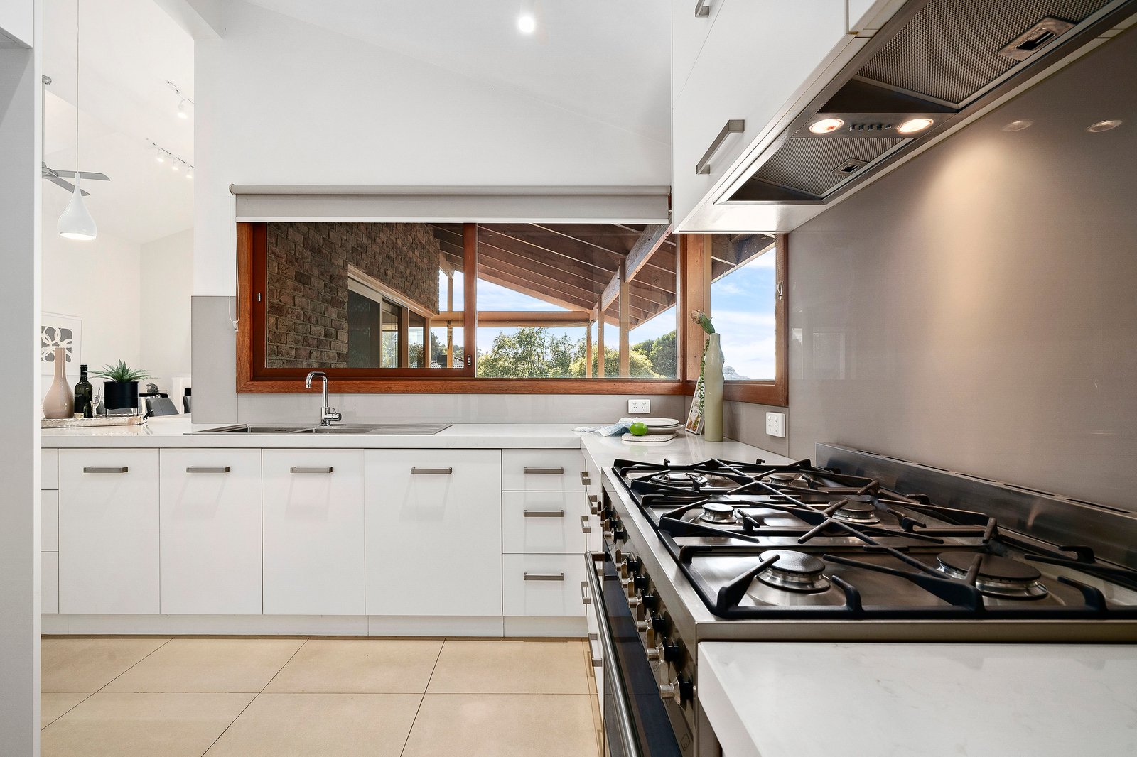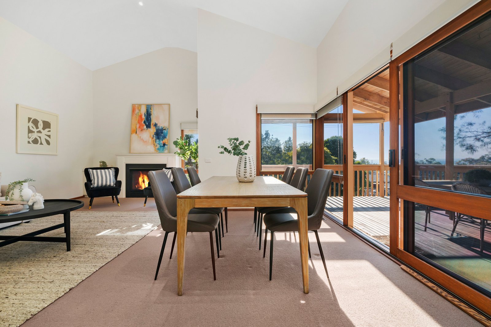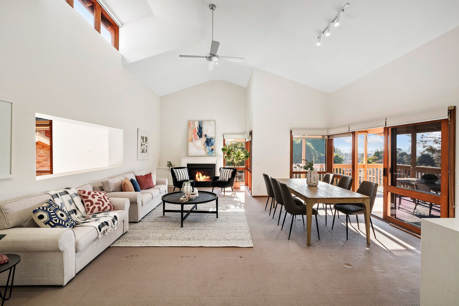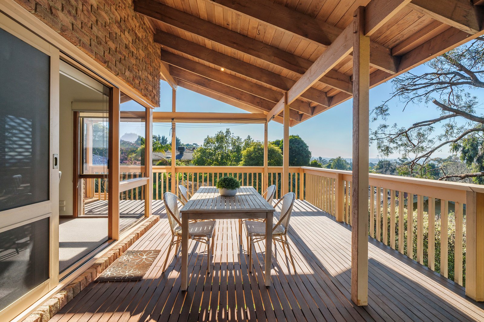 It’s a setting that’s airy and bright, highlighting its elevation at the top end of Jells Road with a spectacular wraparound deck that takes in sweeping views of The Dandenong Ranges.