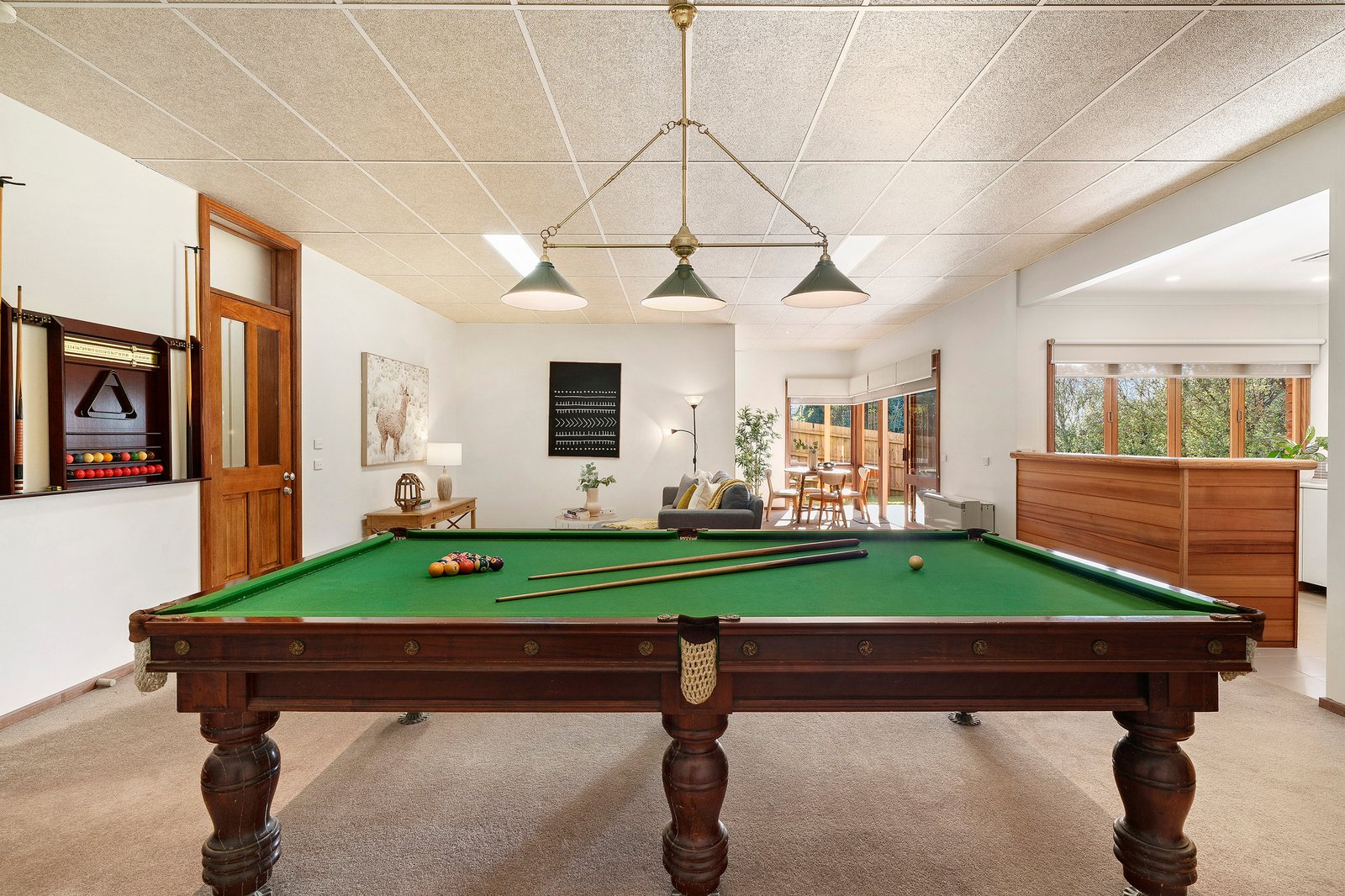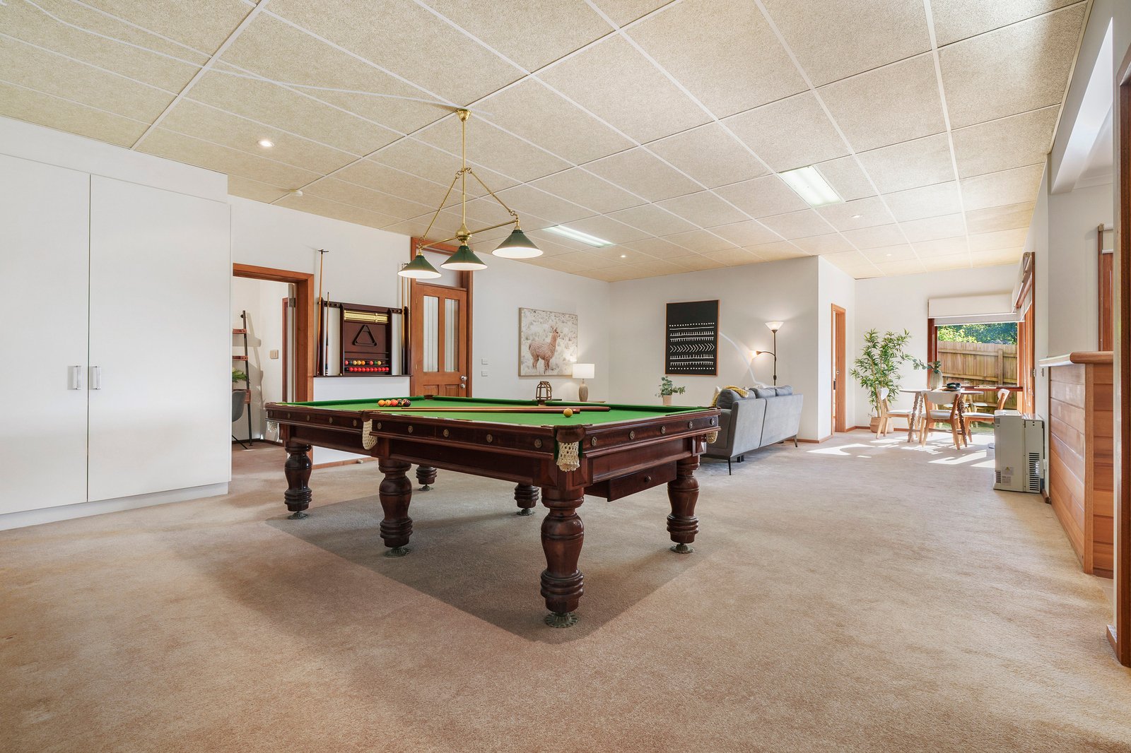 For families wanting intergenerational accommodation, the dual living design offers a fully featured lower-level – for young adults or seniors wanting their own bedroom, bathroom, kitchenette and patio. The lavish rumpus room at its midst doubles as an entertainment parlour – and the billiard table looks so good in there, you might as well keep it.