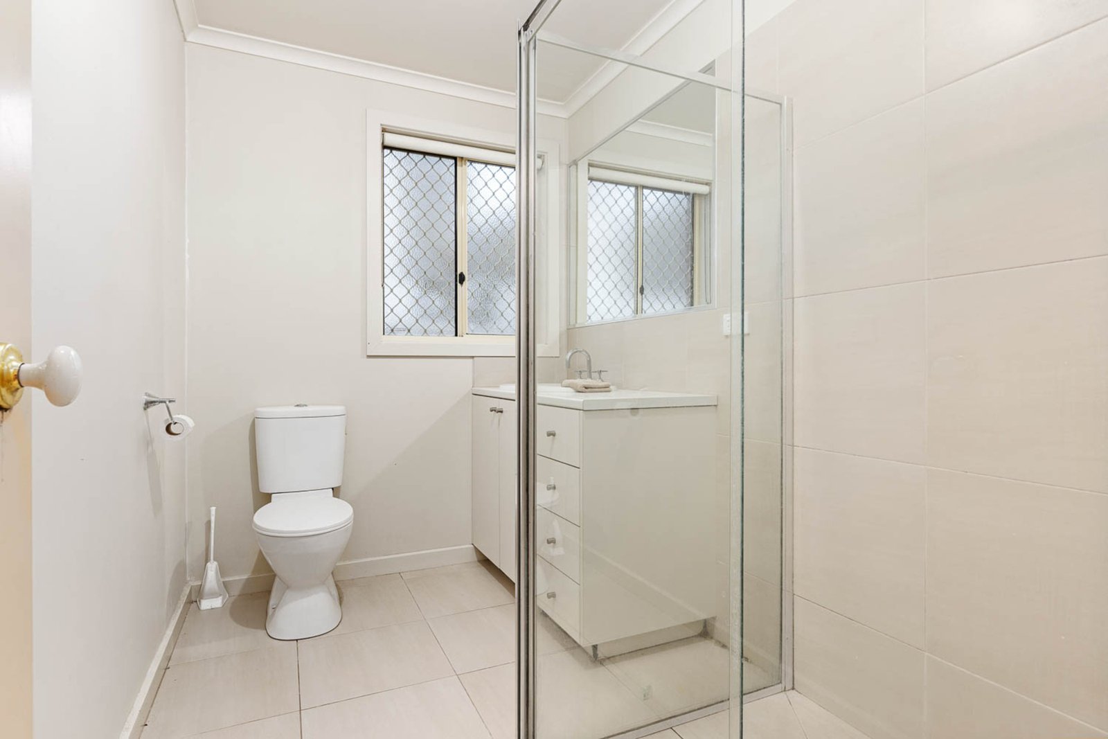 A centrally located bathroom services the home, complete with a shower, vanity, and toilet. This practical layout ensures convenience and ease of use.