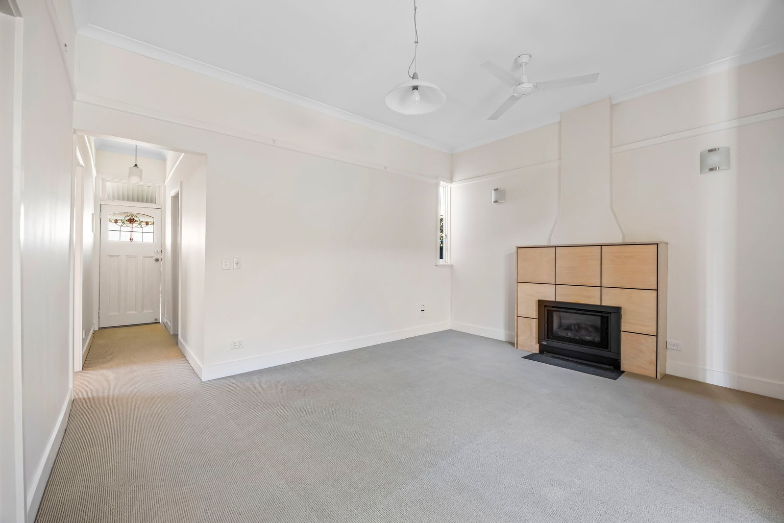 - Living room with gas log fireplace & ceiling fan