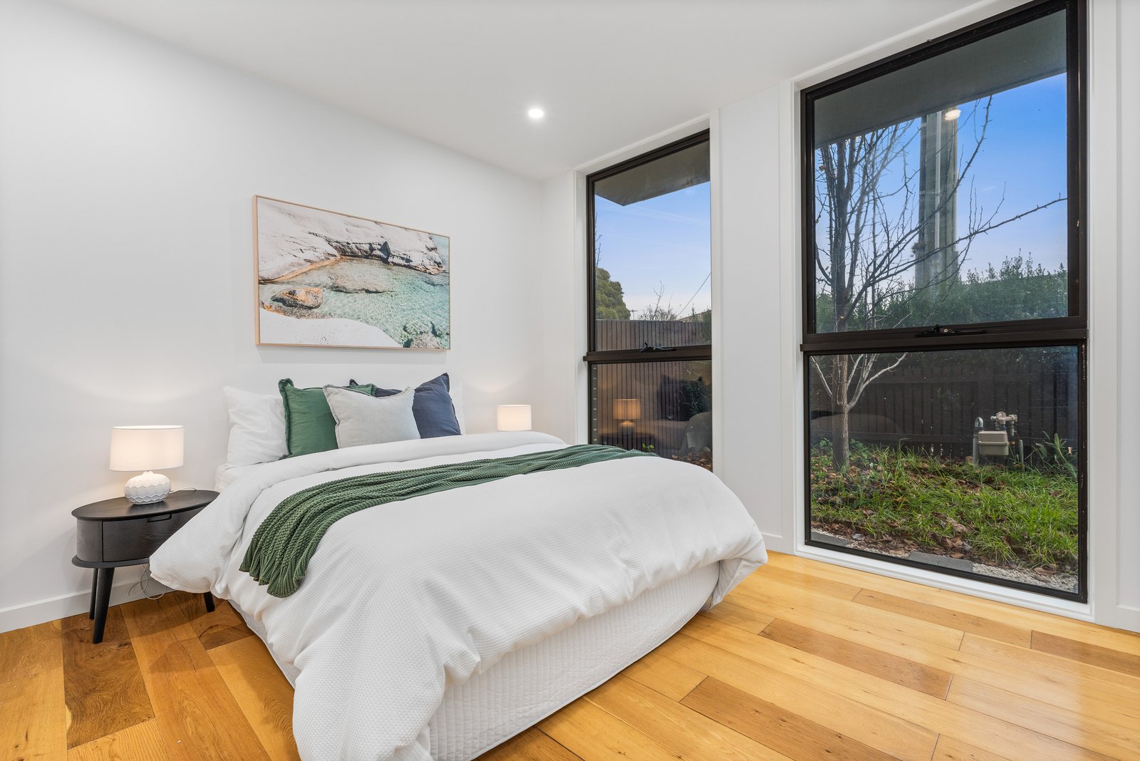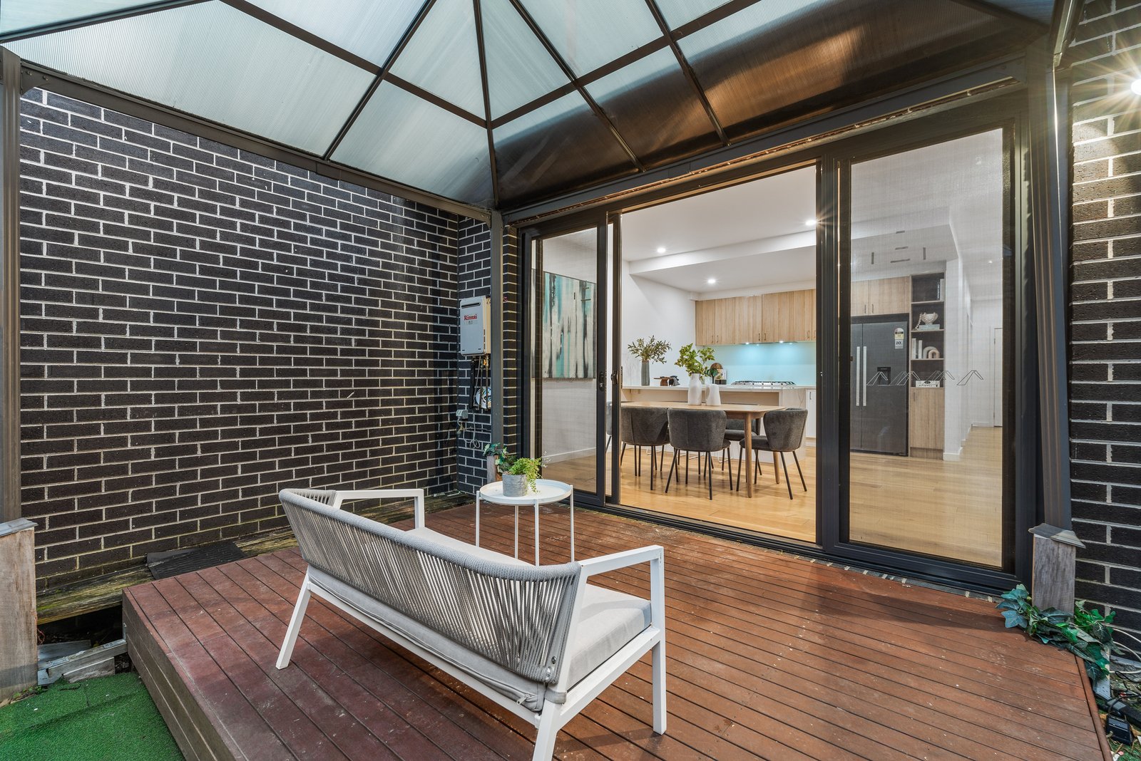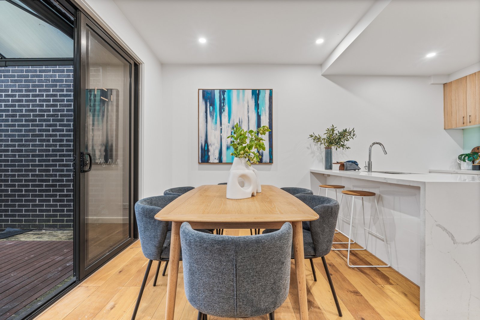 On the ground floor, an open plan living and dining area flows seamlessly to a sunlit timber deck overlooking a private backyard, perfect for family relaxation. A bedroom at the front adds convenience, while the tandem garage includes extra space at the front. The modern kitchen features stone waterfall benchtops, a glass splashback, and high-quality Smeg appliances.