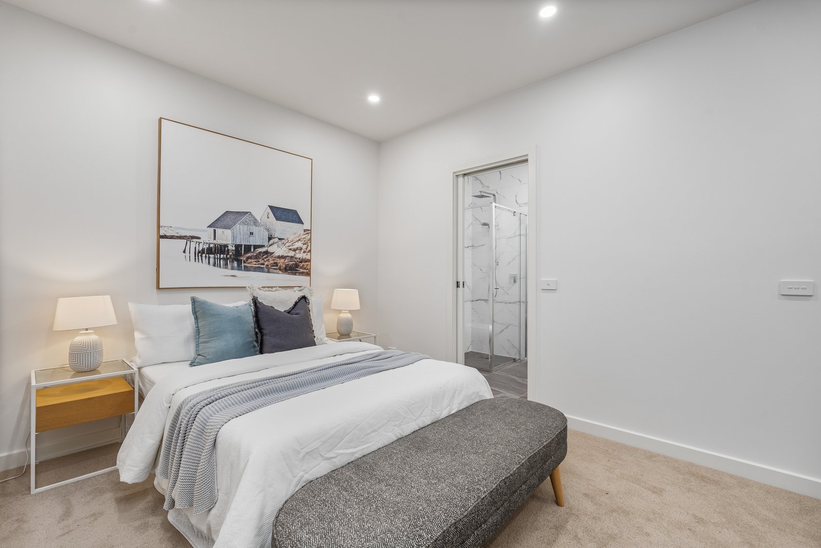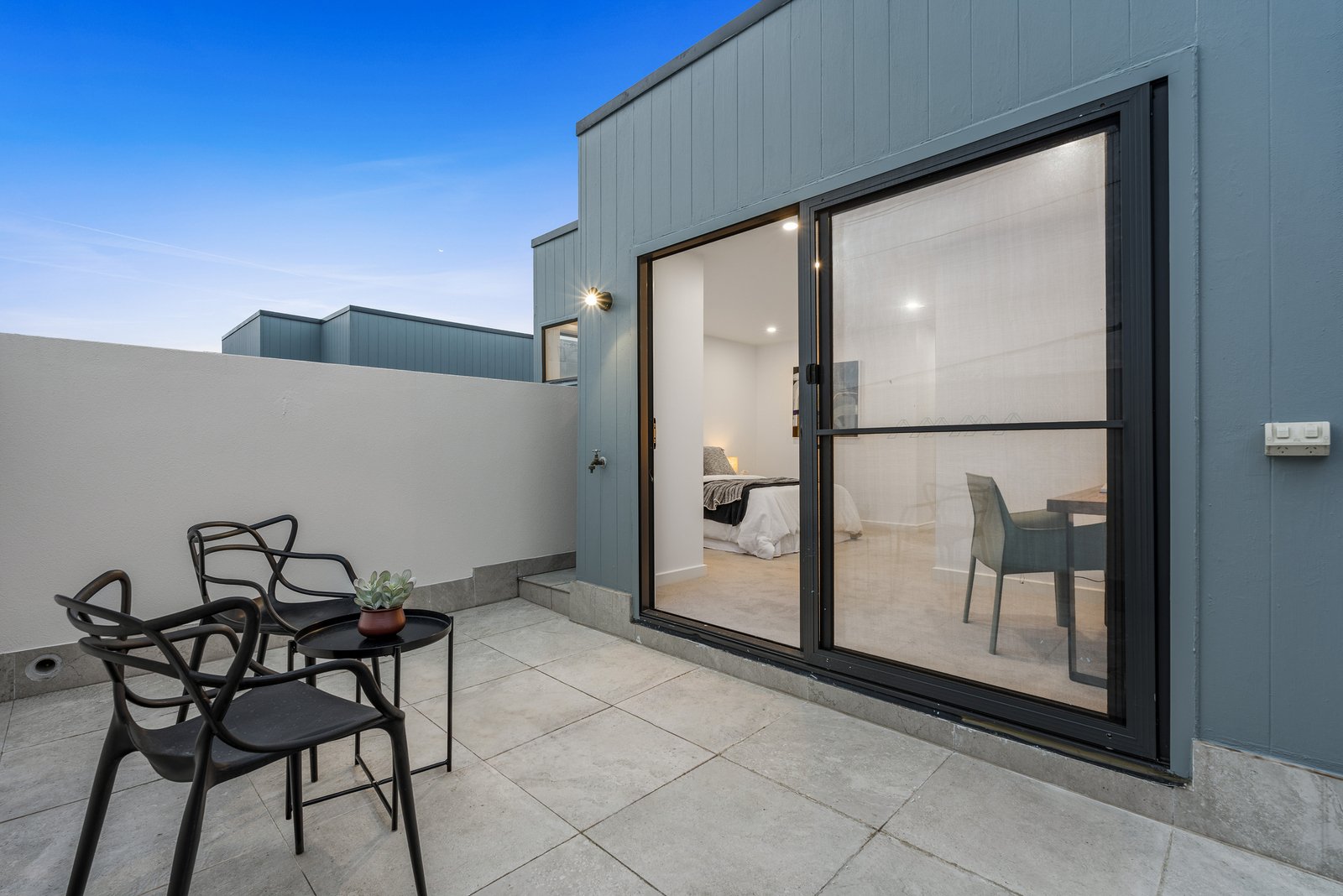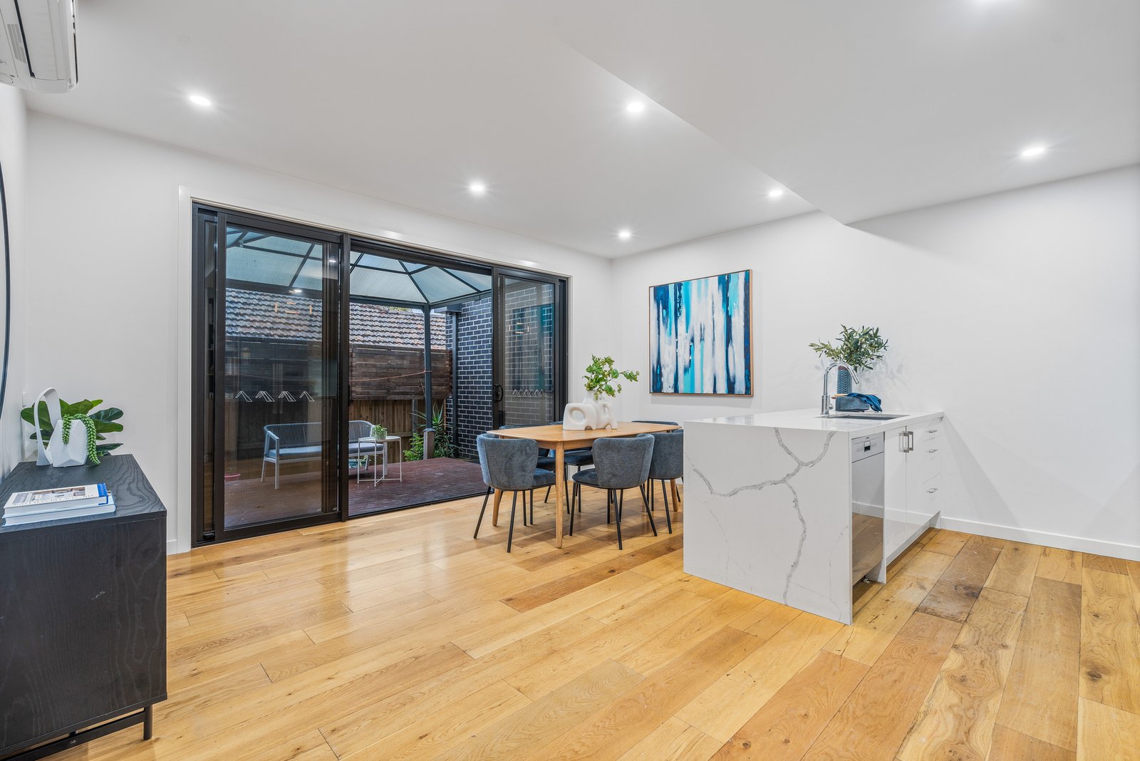 On the ground floor, an open plan living and dining area flows seamlessly to a sunlit timber deck overlooking a private backyard, perfect for family relaxation. A bedroom at the front adds convenience, while the tandem garage includes extra space at the front. The modern kitchen features stone waterfall benchtops, a glass splashback, and high-quality Smeg appliances.