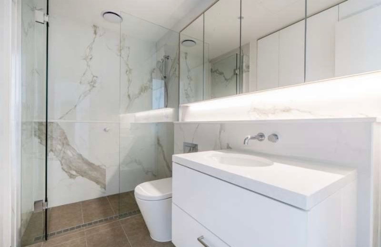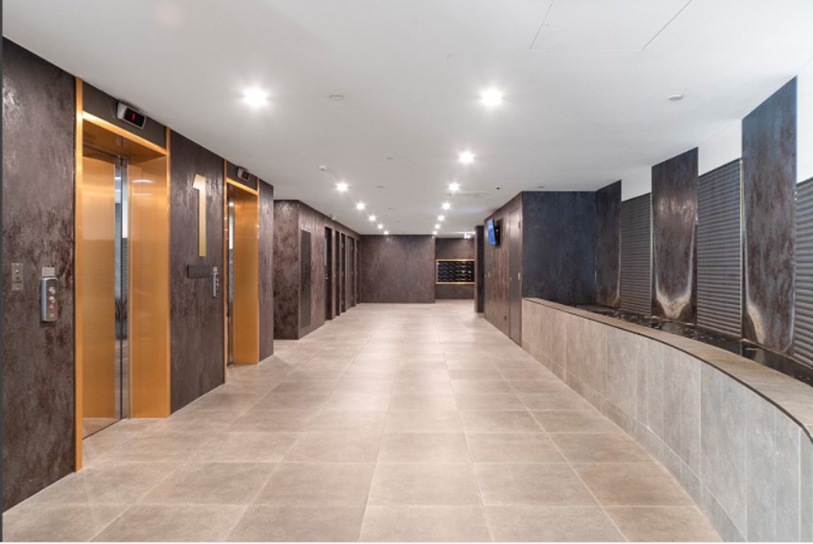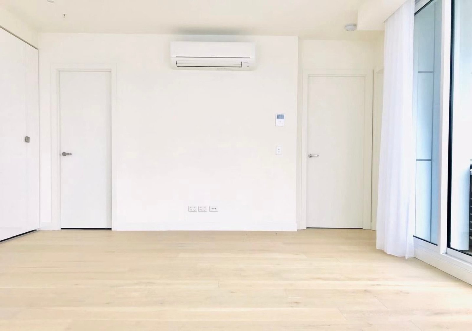 The floor-to-ceiling double-glazed windows also feature zebra blinds for comfort and privacy. The bathrooms offer large vanities and larger-than-average showers, and both bedrooms have generously sized built-in robes.