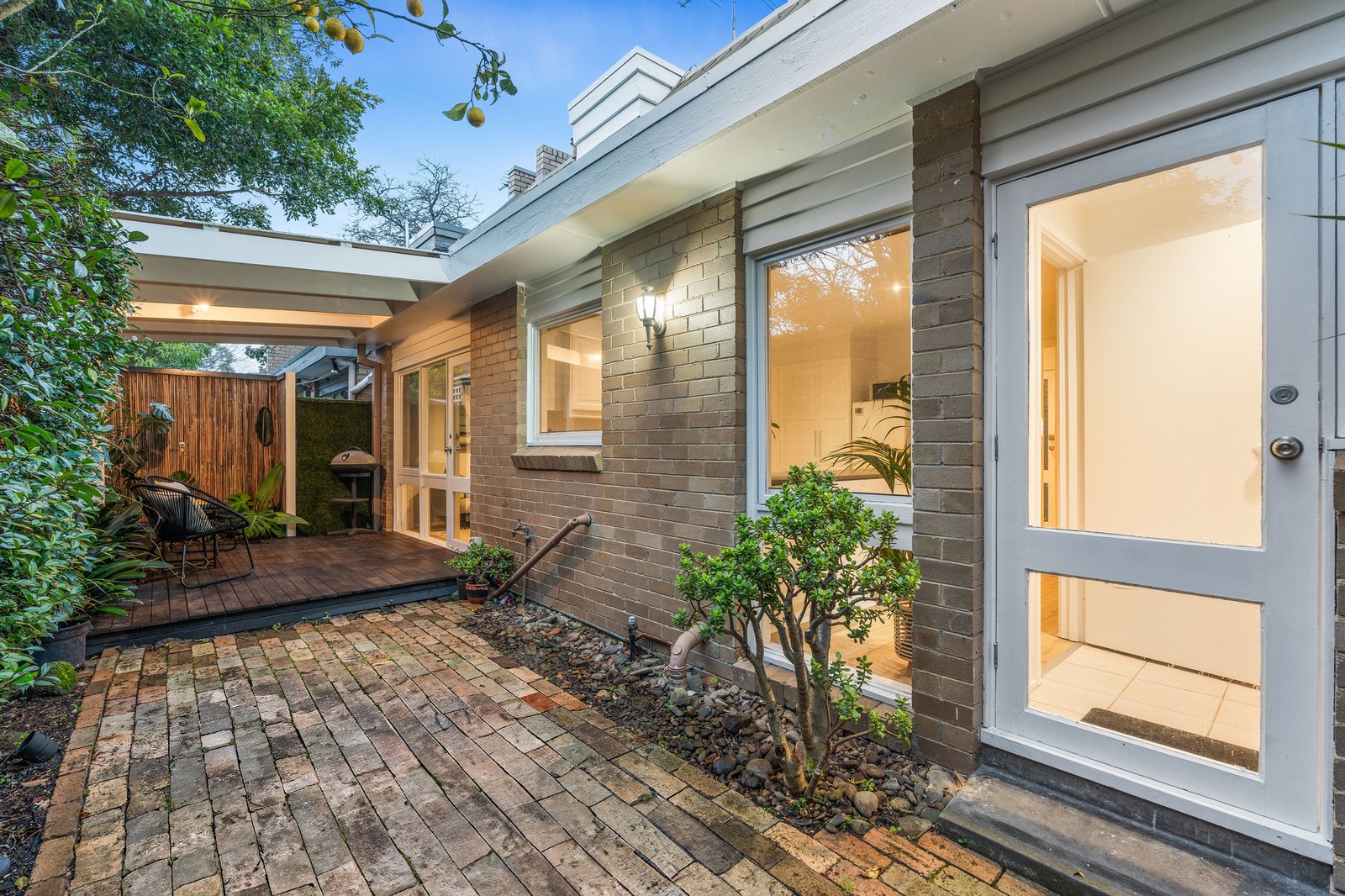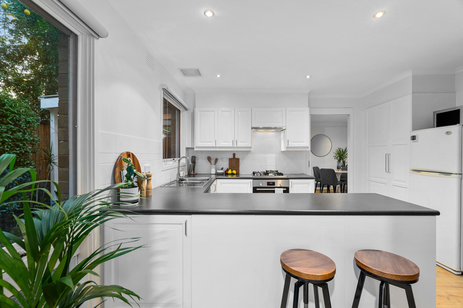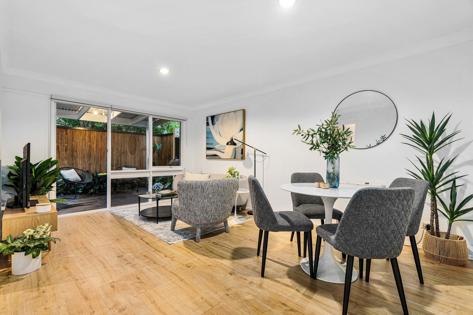 Upon entry, one is greeted by a spacious living room with access to a rear courtyard adorned with lush greenery. The adjoining contemporary kitchen and dining area showcase superior quality appliances, tiled splashbacks, and sleek cabinetry offering ample storage. The kitchen is equipped with a gas stove, electric oven, and integrated dishwasher. Additional amenities include a laundry and expansive storage space beneath the stairs, complemented by a separate downstairs powder room.