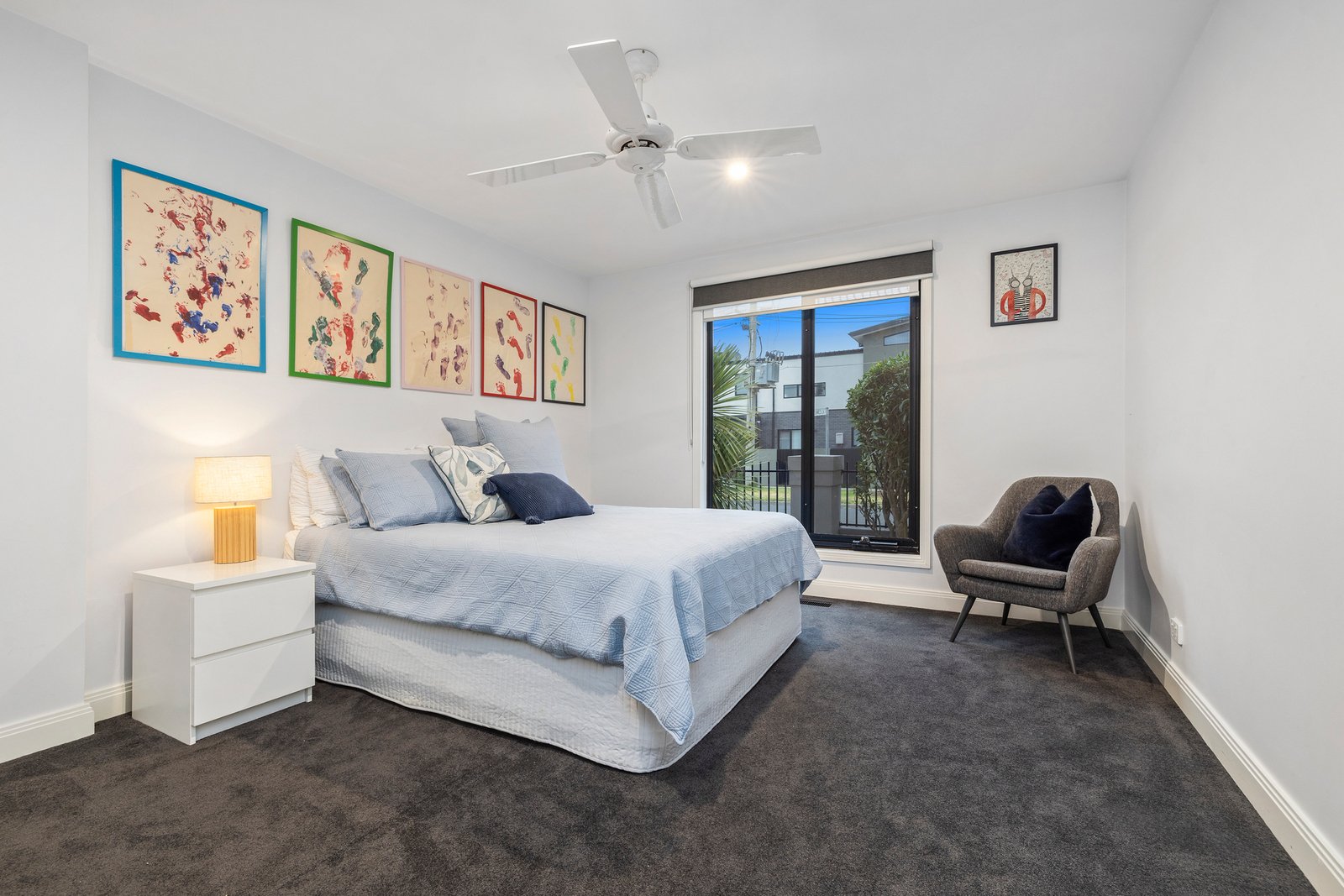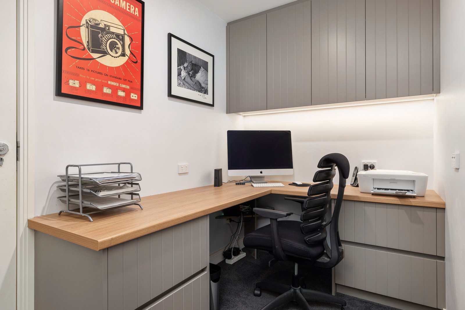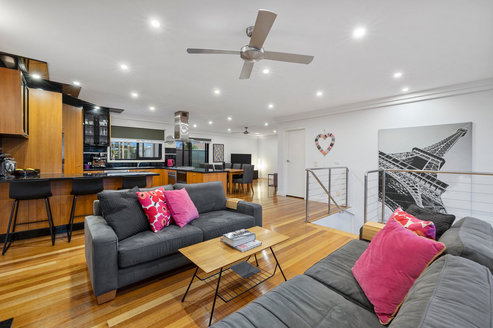 Up on this level is the king-sized master with a cool ebony-toned walk-through robe to the smartly renovated bathroom with twin vanity and a luxe shower, while downstairs are three further bedrooms all with built-in robes – one an optional 4th bedroom/family room with access to the garden.