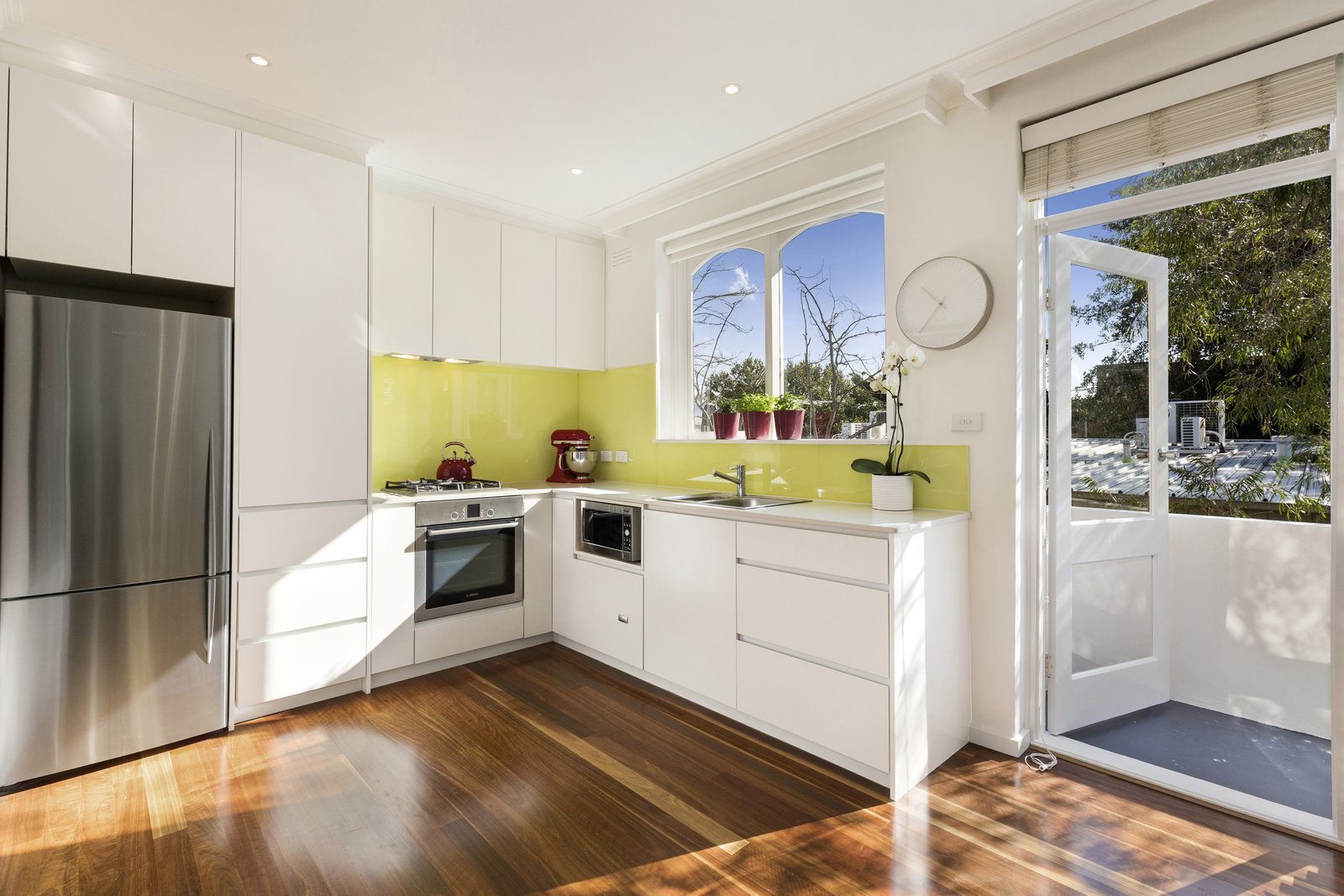 The kitchen's stone benches and Bosch appliances underline the quality of its updating while in their own zone, two double bedrooms, with built in robes, share a central bathroom. Car parking, storage cage. Trams, shops and cafes all within a matter of moments.