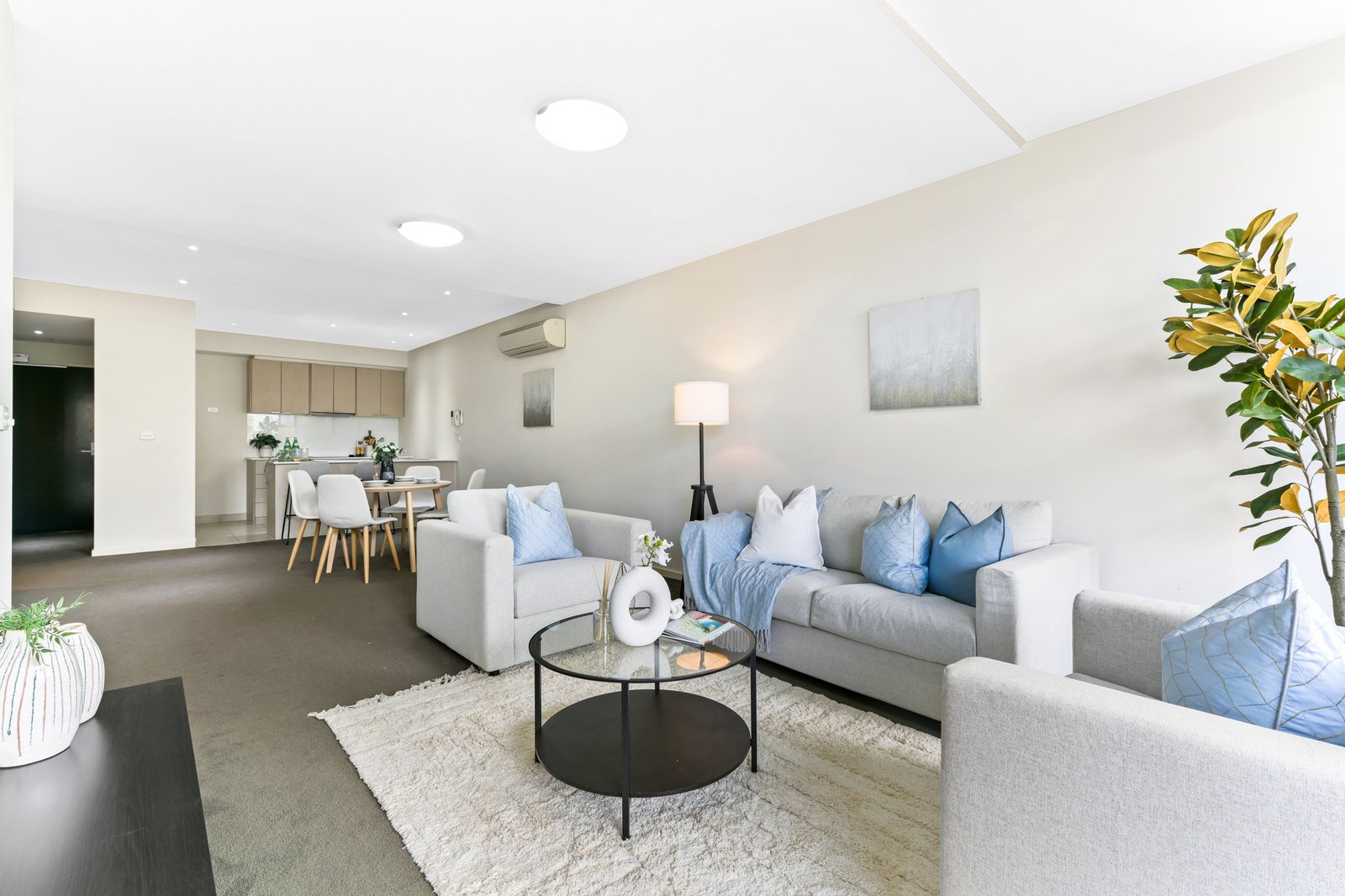 Inside, the apartment is air-conditioned and opens out to a full-width paved balcony, perfect for outdoor dinners and BBQs. The open-plan living and dining area is spacious, with high square-set ceilings and modern LED downlights providing a bright and airy atmosphere. Plush light grey carpet adds a touch of luxury, while soft window furnishings ensure privacy. The main bedroom also includes a study nook, offering a quiet space for working. A separate powder room for guests adds extra convenience.
